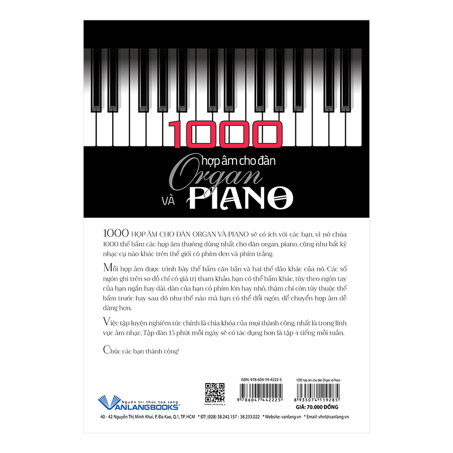 1000 Hợp Âm Cho Đàn Organ & Piano Cuốn sách chứa 1000 thế bấm các hợp âm thường dùng nhất cho đàn Organ, piano, cũng như bất kỳ nhạc cụ nào khác có phím đen và phím trắng trên thế giới. Mỗi hợp âm được trình bày thế bấm căn bản và hai thế đảo khác của nó. Các số ngón tay ghi trên sơ đồ chỉ có giá trị tma khảo, bạn có thể bấm khác tuỳ theo ngón tay bạn ngắn hay dài, đàn của bạn có phím lớn hay nhỏ, thậm chí còn tuỳ thuộc thế bấm trước hay sau đó như thế nào mà bạn có thể đổi ngón, để chuyển hợp âm dễ dàng hơn. Việc luyện tập nghiêm túc chính là chìa khoá của mọi thành công, nhất là trong lĩnh vực âm nhạc. Tập đàn 15 phút mỗi ngày sẽ có tác dụng là tập 4 tiếng mỗi tuần.