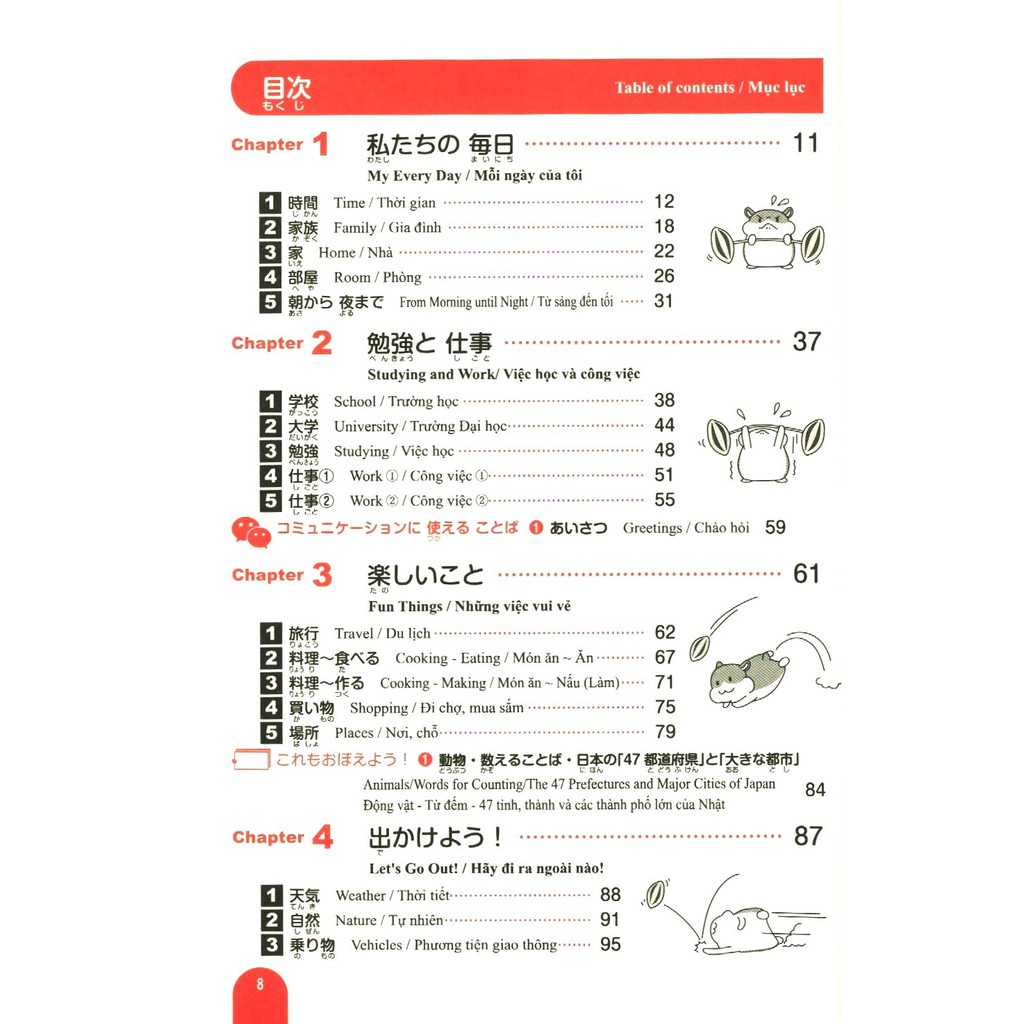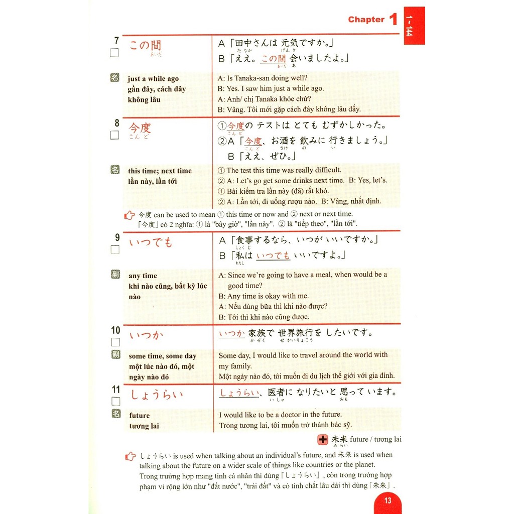 Bộ sách học từ vựng cấp độ N5 ~ N1 dành cho Kỳ thi Năng lực Nhật ngữ. Bộ sách gồm 5 cuốn: N1, N2, N3, N4, N5, tập hợp các từ vựng xuất hiện thường xuyên trong các kỳ thi Năng lực Nhật ngữ. Các từ vựng này được chia theo từng chủ đề, đi kèm các câu ví dụ. Đặc biệt bộ sách có kèm theo bản dịch Anh – Trung – Việt, rất tiện cho các bạn tự học ở nhà.Mời bạn đón đọc. Tác giả: Arc Academy Nhà Xuất Bản: Nxb Trẻ Nhà Phát Hành: NXB Trẻ Năm Xuất Bản: 2019 Số Trang: 200