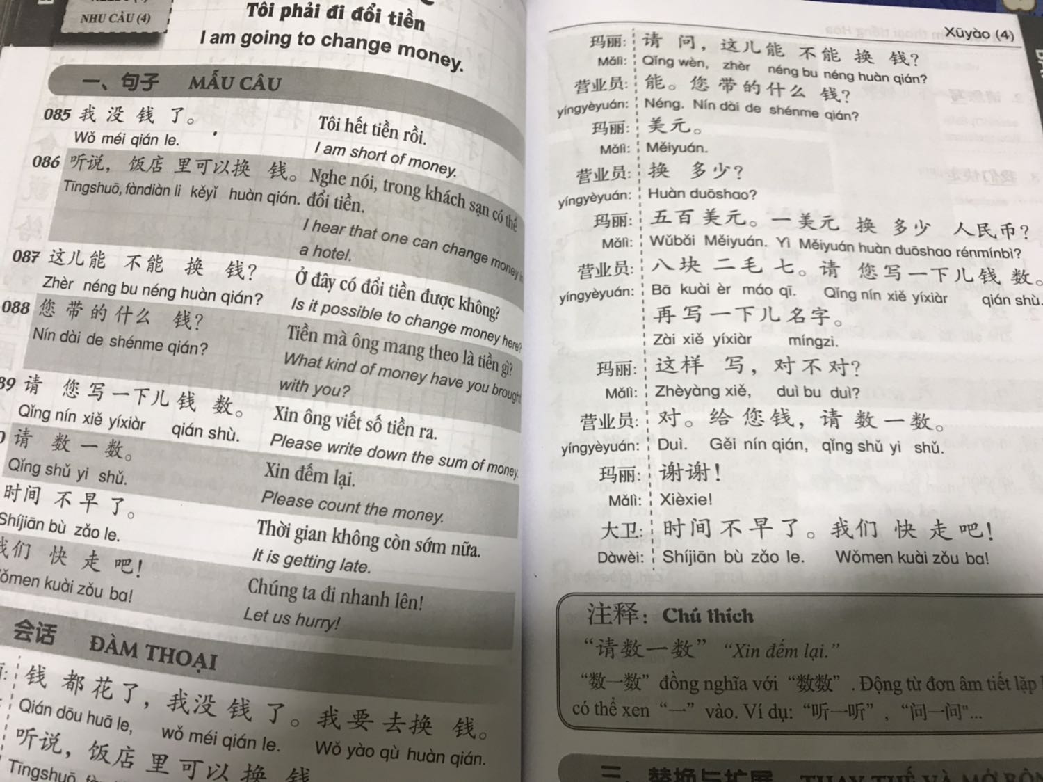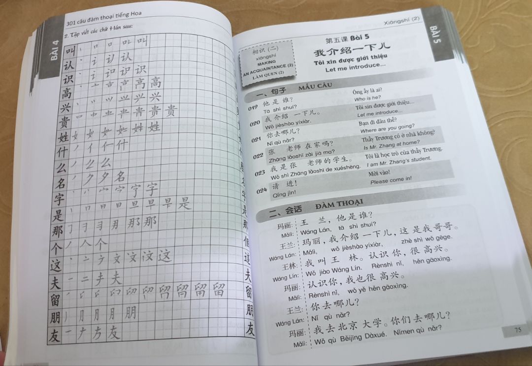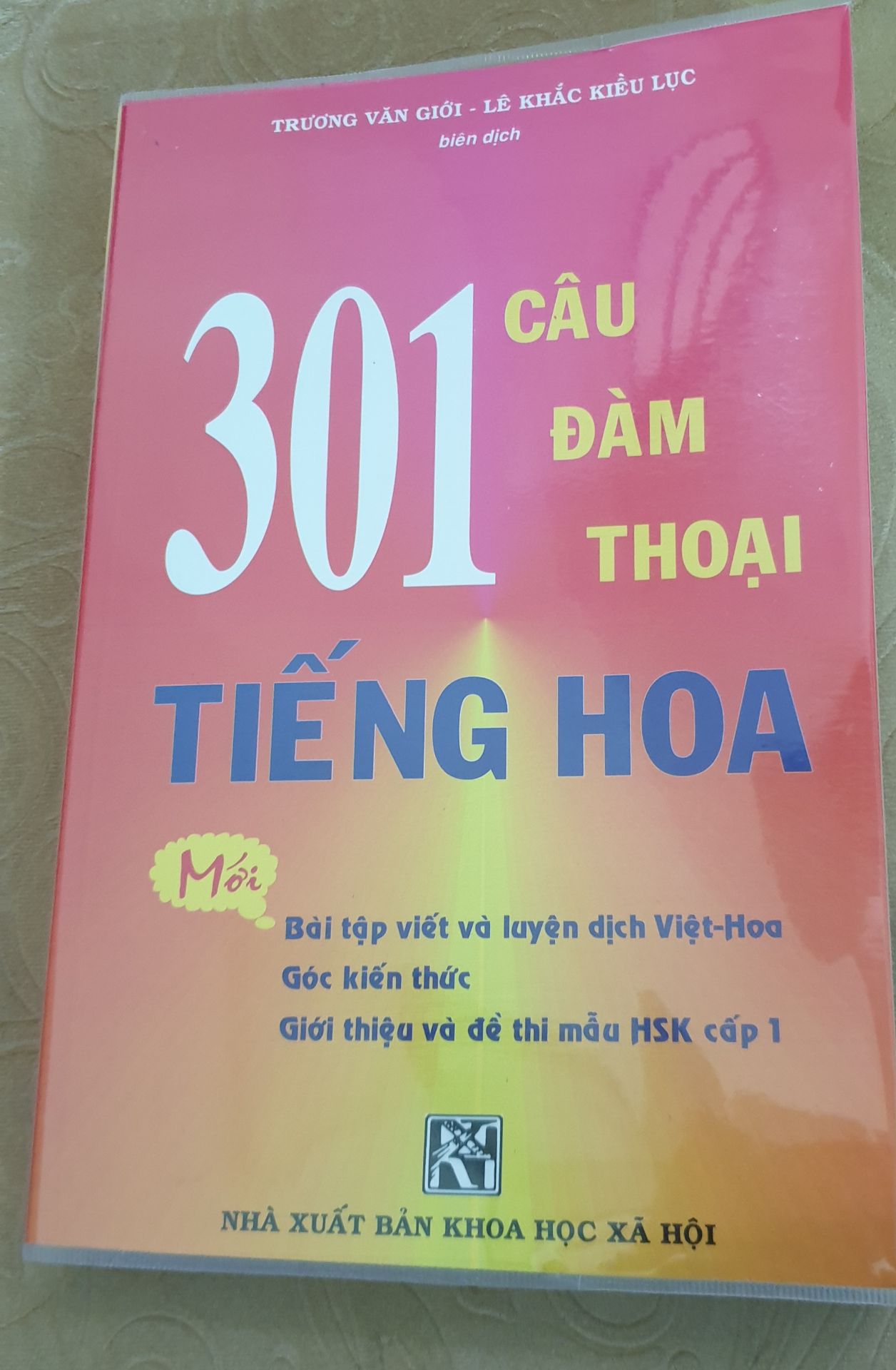 301 câu đàm thoại tiếng Hoa – Giáo trình “301 câu đàm thoại tiếng Hoa” được biên dịch và bổ sung dựa trên cơ sở cuốn sách giáo khoa ” Hán ngữ hội thoại 301″ do các chuyên gia Hán ngữ của học viện ngôn ngữ Bắc kinh biên soạn. – Giáo trình gồm 48 bài trong đó có 8 bài ôn tập, bao quát trên 800 từ thường dùng. Nội dung các bài tập gồm các phần “Mẫu câu”, “Đàm thoại”, “Từ mới”, “Chú ý từ ngữ”, “Ngữ pháp”, “bài tập” – Giáo trình biên soạn theo hướng “mẫu câu” để đi vào thực hành giao tiếp, nhưng cũng giới thiếu khái quát cấu trúc ngữ pháp của tiếng Hán hiện đại.