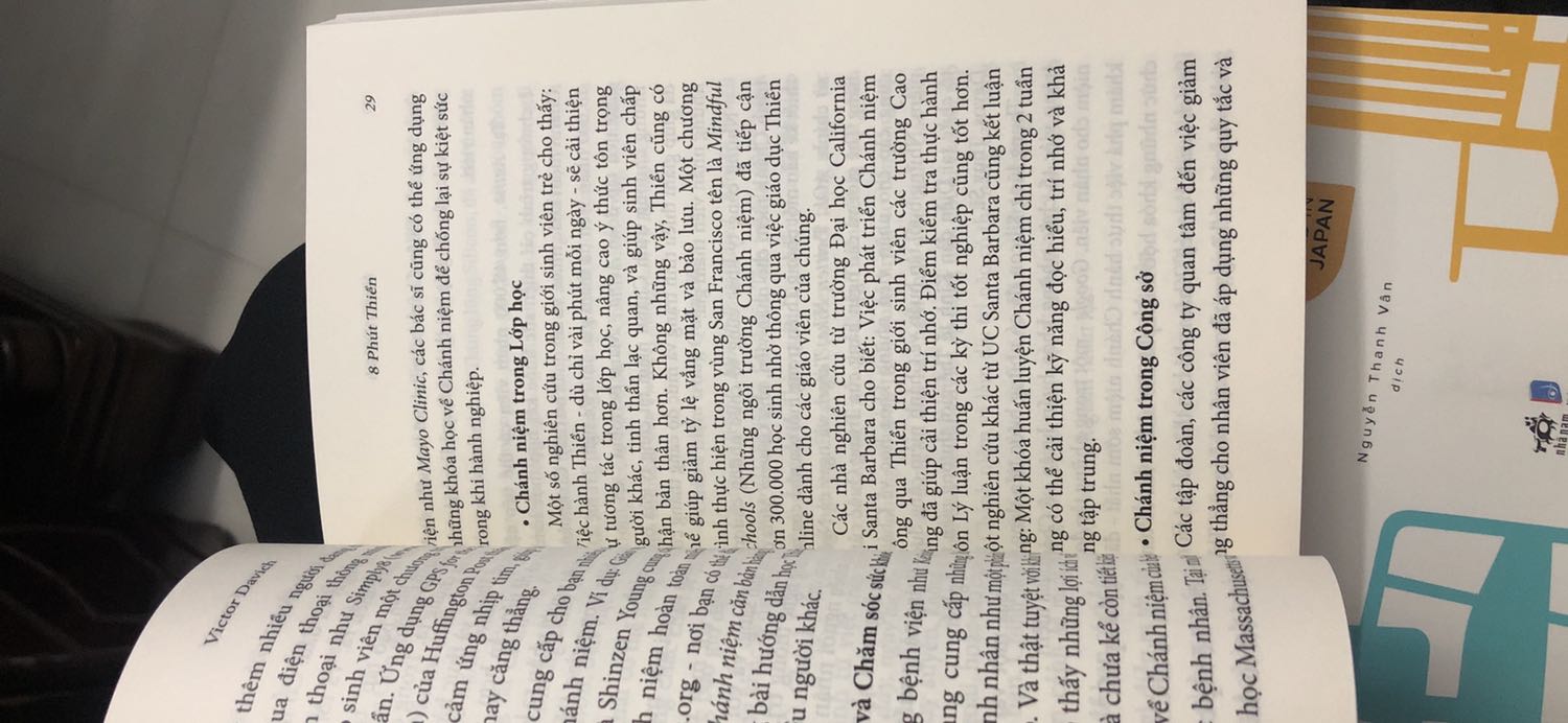 Thiền và Chánh niệm đã trở thành xu thế chủ đạo, xuất hiện từ những bài báo đăng trên các tạp chí như: Fortune, Forbes, Vogue, hay những bài online của tờ The New York Time và tờ Huffington Post, cho đến những ứng dụng sẵn có trên thiết bị di động của bạn. Có vẻ như không ngày nào mà bạn không thấy Thiền được đề cập trên các phương tiện truyền thông ở đâu đó, trong bối cảnh nào đó – không phải như một thứ gì đó nhất thời theo trào lưu, lập dị, hoặc phản văn hóa, mà là một thứ gì đó rất Mỹ. Tại sao? Bởi bạn càng tập trung sống trong hiện tại, bạn càng hạnh phúc và ít bị căng thẳng hơn. Bây giờ, Thiền được dạy khắp nơi – từ các trường Phổ thông đến các trường Y khoa. Những ngôi sao ngành giải trí như Oprah Winfrey và Ellen DeGeneres đều Thiền trước khi biểu diễn. Các công ty lớn như Procter & Gamble và Tập đoàn US Marine (Thủy quân Lục chiến Hoa Kỳ) cũng đang ứng dụng Thiền trong môi trường làm việc. Nhưng Thiền không chỉ dành cho những người nổi tiếng, các giám đốc cấp cao và những nhà thể thao chuyên nghiệp. Thiền (và kết quả của nó là Chánh niệm) là những công cụ có thể ứng dụng trong mọi lĩnh vực của cuộc sống – kể cả trong nghề nghiệp của bạn. Ngày nay, Thiền và Chánh niệm đã trở thành một phần của văn hóa Mỹ, là cách để đạt được sức khỏe tốt, tăng năng suất lao động, sự sáng tạo, sức khỏe thể chất lẫn tinh thần. – Victor Davich ——— “Một phương pháp hướng dẫn rất khác lạ và dứt khoát đưa bạn đến một sự thực hành thánh thiện. 8 Phút Thiền sẽ nâng cao, đào sâu, và làm phong phú việc thực hành tâm linh của bất cứ ai, dù họ thuộc tín ngưỡng nào”. – Reverend John Newton, Viện Cơ Đốc. “Là một người tin tưởng mạnh mẽ vào giá trị của Thiền, tôi nhiệt liệt hoan nghênh cuốn sách mới này. Nó giúp ngay cả những người bận rộn nhất trong chúng ta cảm nhận được nhiều lợi ích từ kỹ thuật cổ xưa này. Tác giả đã hướng dẫn Thiền cho chúng ta một cách dí dỏm, dễ cảm nhận và duyên dáng. Quan trọng hơn: Là một người thực tế, ông đã chỉ ra nhiều cơ hội để chúng ta áp dụng Thiền trong đời sống hằng ngày, và hướng dẫn chúng rất tỉ mỉ”. – Tiến sĩ Barrie R. Cassileth, Chủ tịch của Quỹ Laurence S. Rockefeller Integrative Medicine, Trung tâm Nghiên cứu Ung thư Memorial Sloan Kettering.