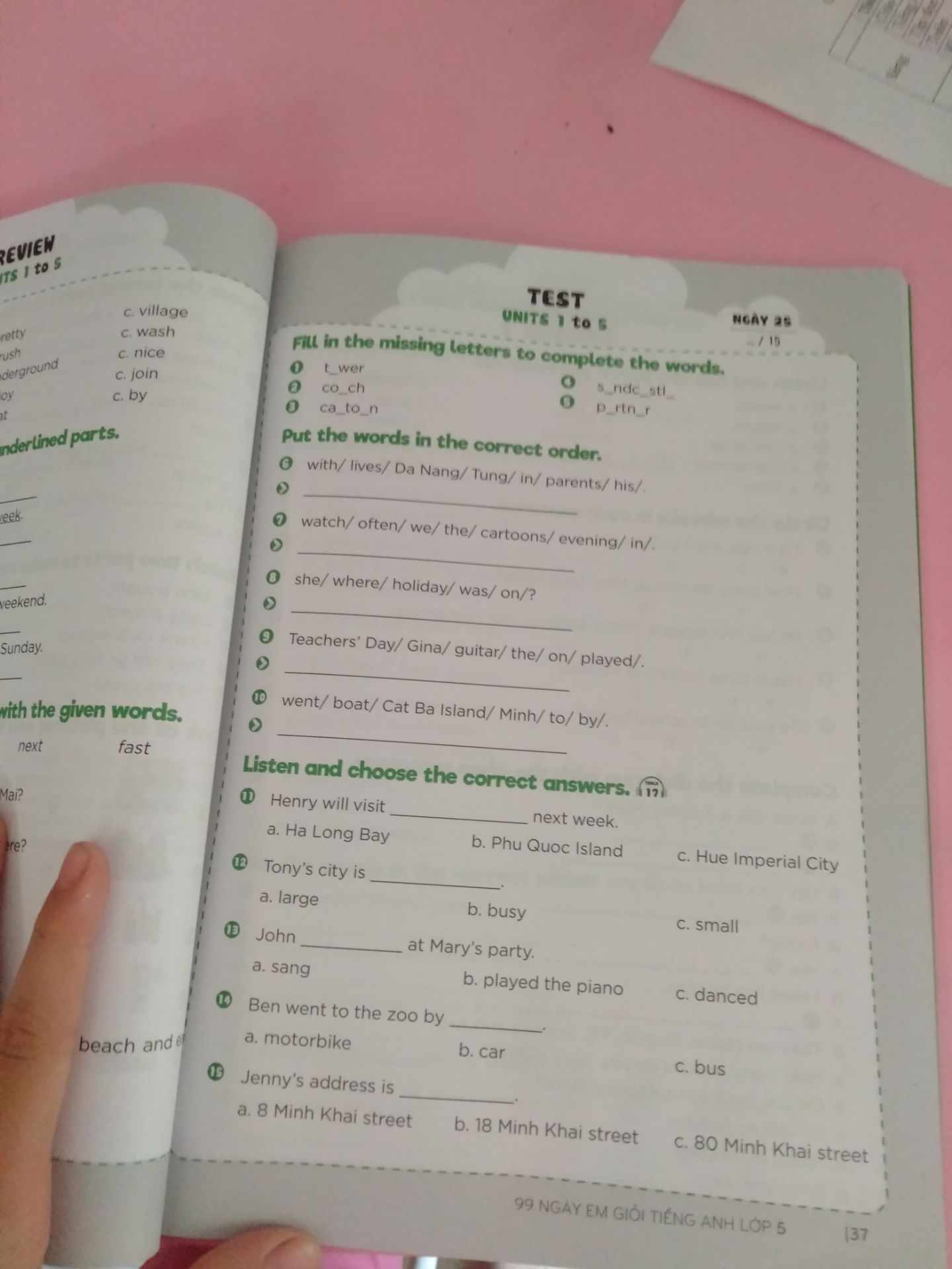 99 Ngày Em Giỏi Tiếng Anh Lớp 5 Học sinh không biết cách ôn tập các kiến thức trọng tâm Nhiều học sinh lớp 5 không biết phải học bắt đầu từ đâu, không biết cách ôn tập có hệ thống theo từng bài học. Nhiều em bị hổng kiến thức từ những lớp dưới nên với những kiến thức tiếng Anh lớp 5 các em vẫn thấy lạ lẫm. Để các em có thể vượt qua những bài kiểm tra một cách dễ dàng cũng như nâng cao tính ứng dụng của tiếng Anh trong thực tế thì kiến thức từ sách giáo khoa là vẫn chưa đủ. Học sinh không tìm được các bài tập để nâng cao kiến thức từ cơ bản đến nâng cao Sách giáo khoa thường không có nhiều bài tập để các em ôn luyện và kiến thức sách giáo khoa thường nằm ở mức cơ bản mà chưa có các bài tập nâng cao. Học lý thuyết mà không luyện tập các em sẽ không ghi nhớ được kiến thức lâu. Các em đang muốn tìm thêm các bài tập để ôn luyện nhưng không hề dễ dàng. Việc học tập và kèm cặp con học của phụ huynh sẽ trở nên đơn giản và dễ dàng hơn nếu giải quyết được tất cả những vấn đề trên. Với mong muốn giúp đỡ các bậc phụ huynh và các em có tài liệu ôn tập đúng chuẩn và bám sát các bài kiểm tra trên lớp chúng tôi xin giới thiệu tới các bạn bộ sách “99 ngày em giỏi tiếng anh lớp 5” – cuốn sách giúp học tốt tiếng Anh. Điều quan trọng sau mỗi bài học trên lớp là các em nhớ và hiểu kiến thức quan trọng trong sách giáo khoa, có thể làm được các bài tập củng cố kiến thức đó. 99 ngày em giỏi tiếng anh lớp 5 có gì đặc biệt? Cuốn sách 99 ngày em giỏi Tiếng Anh – 5 sẽ là một giải pháp hợp lý dành cho các em học sinh tiểu học. Bộ sách sẽ cung cấp: • Mục tiêu cần đạt sau mỗi bài học trong sách giáo khoa • Lộ trình 99 ngày để đạt các mục tiêu đó • Hệ thống kiến thức cần ghi nhớ trong chương trình học từng lớp • Tổng hợp bài tập tự luyện theo kiến thức và kỹ năng đã học 99 ngày – tương ứng với 99 bài tự luyện – được thiết kế từ dễ đến khó, kết hợp luyện tập về từ vựng, ngữ pháp, mẫu câu, hội thoại, bài đọc, tạo cơ hội cho các em học sinh ở mọi trình độ có thể nâng cao kiến thức, kỹ năng tiếng Anh của mình. Với 99 bài học, sẽ giúp học sinh: • Nắm chắc toàn bộ kiến thức trọng tâm • Dễ dàng làm tốt các bài tập và bài kiểm tra trên lớp • Củng cố và nâng cao kỹ năng nghe – nói – đọc – viết • Tự luyện và đánh giá mức độ hiểu biết sau mỗi bài học Để đạt hiệu quả học tập, các em có thể tham khảo cách học với cuốn sách sau đây: • Mỗi tuần học ba ngày. • Mỗi ngày học một bài. • Mỗi bài khoảng 15-30 phút. Trước khi học, các em hãy đọc mục tiêu của từng đơn vị bài học trong Bảng “Mục tiêu và lộ trình học tập”. • Đọc lại kiến thức cần nhớ trong tờ “Tổng hợp kiến thức tiếng Anh” • Nghiêm túc học và làm bài tập • Sau khi làm xong, kiểm tra lại đáp án và ghi rõ số lượng câu trả lời đúng vào phần ghi điểm ở đầu mỗi trang sách. • Ghi lại điểm số vào bảng “Theo dõi kết quả học tập”. • Sau mỗi đơn vị bài học, sau mỗi bài test, các em hãy nhìn lại kết quả trong bảng “Theo dõi kết quả học tập” và đánh giá lại mức độ hiểu biết về kiến thức và kỹ năng của mình so với bảng “Mục tiêu và lộ trình học tập”. Từ đó, có kế hoạch học tập tốt hơn. Chúng tôi hy vọng, cuốn sách 99 ngày em giỏi tiếng Anh lớp 5 sẽ là một cuốn sách hữu ích cho các em học sinh tiểu học, giúp các em biết lập mục tiêu và lên kế hoạch để đạt được mục tiêu đó. • Chia lộ trình rõ ràng, số buổi tiêu chuẩn và mục tiêu đạt được • Bảng kết quả học tập tự đánh giá Sau cuốn sách sẽ có phần hướng dẫn cho các em, với phần đáp án này các em có thể tự kiểm tra được kết quả sau khi làm bài tập. Với cuốn sách tuyệt vời hướng dẫn các em học sinh học tập hiệu quả cũng như tài liệu cho các bậc phụ huynh đồng hành cùng con trên chặng đường học hành. Đừng bỏ qua cuốn sách tuyệt vời này, hãy sắm cho con mình ngay hôm nay nhé!