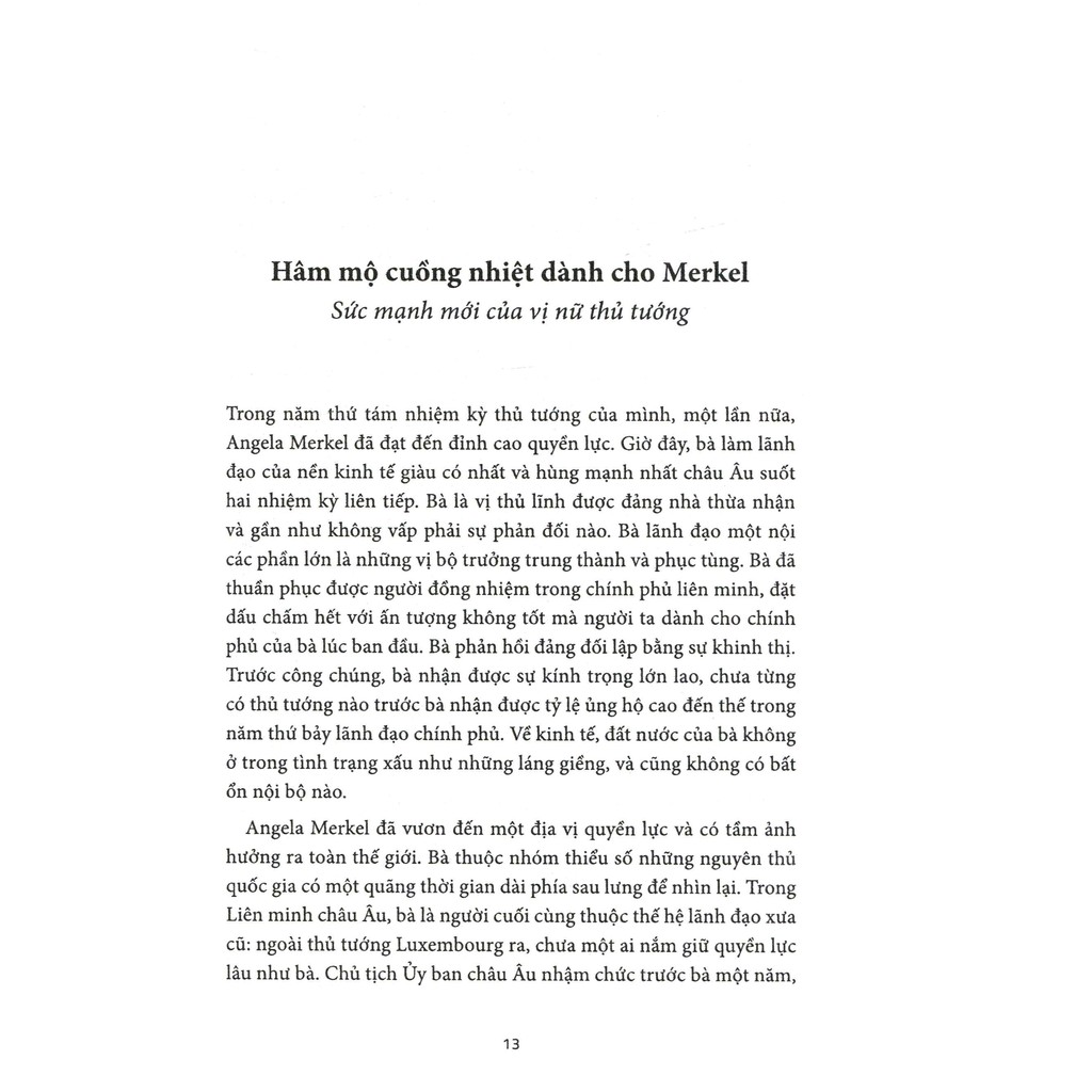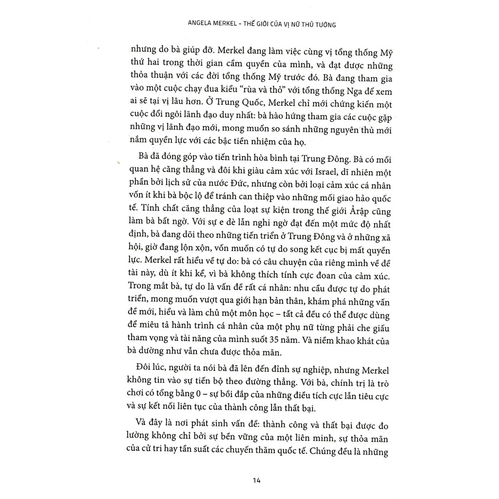 Tiểu sử được ủy quyền về một trong những người phụ nữ quyền lực nhất thế giới làm sáng tỏ con người đằng sau một chính trị giaVới việc khu vực đồng tiền chung euro bên bờ vực sụp đổ và một cuộc khủng hoảng không lường trước được, một nhân vật chính trị bao trùm lên tất cả, Angela Merkel, lãnh đạo của nền kinh tế mạnh nhất. Mặc dù đối ngoại trở thành vấn đề trọng tâm của vai trò thủ tướng trong năm bầu cử quyết định này, cả thế giới lo lắng dõi theo nước Đức đóng vai trò giải cứu châu Âu. Từ những ngày thiếu nữ đi nhờ xe đến Tbilisi đến lúc trở thành khách mời danh dự của quốc yến tại Nhà Trắng, cuốn sách này nghiên cứu tỉ mỉ về một cô gái đến từ Đông Đức vươn lên đến cấp bậc cao nhất của quyền lực ở châu Âu. Đồng thời cũng giải thích thế giới quan của Angela Merkel được hình thành và chịu ảnh hưởng bởi xuất thân và ý thức hệ của bà như thế nào, bản miêu tả sinh động này bàn về quan hệ cá nhân của bà với các đồng cấp quốc tế như David Cameron, Barack Obama, và Vladimir Putin, cũng như thái độ của bà dành cho các quốc gia và nền văn hóa của những vị nguyên thủ đó.Mời bạn đón đọc. Tác giả: Stefan Kornelius Nhà Xuất Bản: Nxb Trẻ Nhà Phát Hành: NXB Trẻ Năm Xuất Bản: 2016 Số Trang: 292