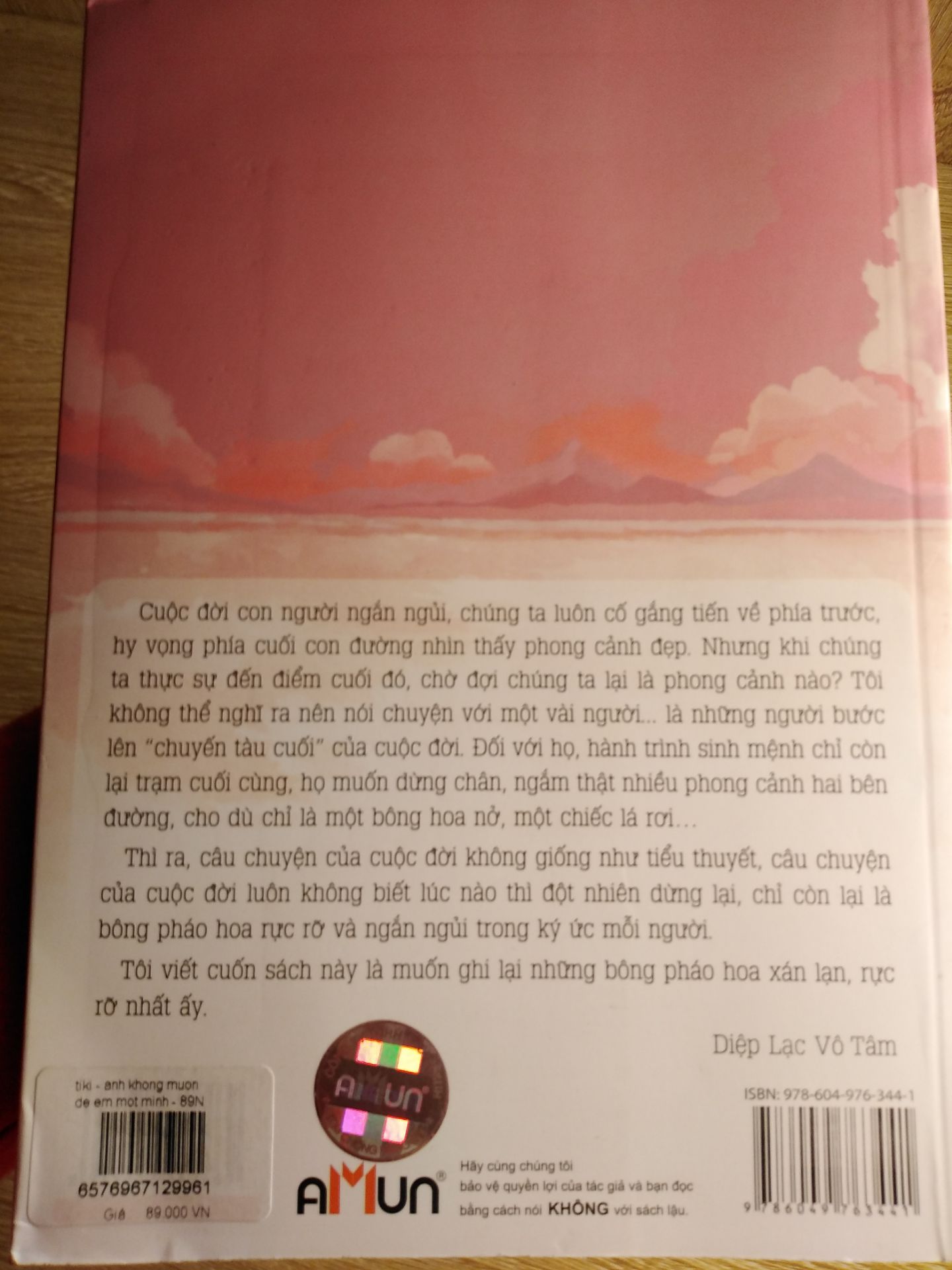 Anh Không Muốn Để Em Một Mình (Tái Bản) Cuộc đời con người ngắn ngủi, chúng ta luôn cố gắng tiến về phía trước, hy vọng phía cuối con đường nhìn thấy phong cảnh đẹp. Nhưng khi chúng ta thực sự đến điểm cuối đó, chờ đợi chúng ta lại là phong cảnh nào? Tôi không thể nghĩ ra nên nói chuyện với một vài ngườ là những người bước lên “chuyến tàu cuối” của cuộc đời. Đối với họ, hành trình sinh mệnh chỉ còn lại trạm cuối cùng, họ muốn dừng chân, ngắm thật nhiều phong cảnh hai bên đường, cho dù chỉ là một bông hoa nở, một chiếc lá rơi… Thì ra, câu chuyện của cuộc đời không giống như tiểu thuyết, câu chuyện của cuộc đời luôn không biết lúc nào thì đột nhiên dừng lại, chỉ còn lại là bông pháo hoa rực rỡ và ngắn ngủi trong ký ức mỗi người. Tôi viết cuốn sách này là muốn ghi lại những bông pháo hoa xán lạn, rực rỡ nhất ấy.