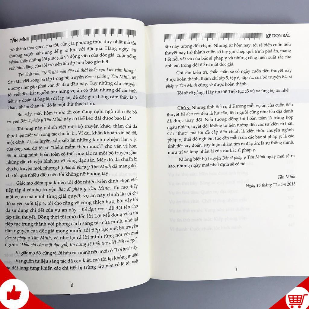 Sách – Bác sĩ Pháp Y Tần Minh – Người Sống Sót, Kẻ Nhìn Trộm, Kẻ Dọn Rác (Combo, lẻ tùy chọn) Công ty phát hành Phúc Minh Nhà xuất bản NXB Văn Học Tác giả Pháp Y Tần Minh Dịch Giả Tuệ Tâm(1); Tú Phương(2); Đinh Quỳnh Anh(3) Ngày xuất bản 06-2019(1); 08-2018(2); 01-2018(3) Kích thước 16 x 24 cm Loại bìa Bìa mềm Số trang 471-1; 560-2; 548-3 ——- 1. Kẻ Dọn Rác Một sát thủ bí ẩn âm thầm xuất hiện trong thành phố, hắn lặng lẽ hành quyết những người lang thang, những kẻ tâm thần. Sau khi gây án, hắn hoàn toàn không để lại dấu vết nào ngoại trừ chữ “Kẻ dọn rác” như lời thách thức dành cho giới cảnh sát. Nhóm giám định hiện trường có thể tìm thấy tay sát thủ thoắt ẩn thoắt hiện như bóng ma kia nhờ vào những dấu vô cùng tinh vi không? Mỗi giây mỗi phút diễn ra trong series “Bác sĩ pháp y Tần Minh” đều khiến từng tế bào thần kinh của bạn chịu kích thích đến cực độ. Tần Minh là một bác sĩ pháp y rất có danh tiếng tại Trung Quốc. Ông chính là tác giả của series sách bán chạy “Bác sĩ pháp y Tần Minh”. Tần Minh bước vào nghề pháp y từ rất sớm, nên ông có kinh nghiệm vô cùng phong phú trong việc giải mã dấu hiệu phạm tội trên các xác chết. Theo ông, những dấu hiệu đó chính là “lời của xác chết”. Với đôi tay phẫu thuật quỷ khốc thần sầu, với sự bình tĩnh đáng nể và tấm lòng nhân từ như Đức Phật, ông đã phanh phui biết bao sự thật bi thảm, giúp các oan hồn được giải thoát. —– 2. Người Sống Sót “Người sống sót” kể về chuỗi những án mạng song song xảy ra trên 2 địa bàn khác nhau, có thời gian sít soát nhau, các nạn nhân ở mỗi vụ án song song có cùng chung 1 đặc điểm (cùng là cô dâu, cùng là trẻ em, hoặc cùng là người già neo đơn…). Hung thủ là ai? Đang trốn ở gầm trời nào? Truyện khởi đầu bằng hai đám cưới đẫm máu dường như không có điểm chung, nhưng các nạn nhân đều là những cô dâu có cùng độ tuổi và danh tính của kẻ giết người bỏ lại phía sau hình dạng in giày, kích thước, dấu vân tay, dấu chân một cách chính xác. Đây là một kẻ giết người tâm thần phân liệt? Hai hay nhiều người phạm tội? Là một sự bắt chước? Hoặc là một cuộc thách đố để thỏa mãn bản thân? —– 3. Kẻ Nhìn Trộm Tiếp nối Kẻ dọn rác và Người sống sót, Kẻ Nhìn Trộm là hành trình tìm ra chân tướng sự thật của tổ Pháp Y gồm 5 người: Tần Minh, Lâm Đào, Đại Bảo, Thi Vũ và Hàn Lượng. Truyện bao gồm 10 vụ án nhỏ tưởng chừng như chẳng hề liên quan đến nhau nhưng lại là những mắt xích quan trọng trong việc phá vụ án lớn nhất liên quan đến Kẻ nhìn trộm. Một người bạn của Đại Bảo là Đỗ Châu bỗng nhiên mất tích, vợ anh linh cảm điều chẳng lành. Khi vụ án còn chưa tìm ra manh mối, bỗng hai thi thể phụ nữ được phát hiện trong trang phục hành khất ở nơi hoang vắng. Điều đáng nói là trên tay một trong hai nạn nhân có chiếc nhẫn kết hôn của Đỗ Châu. Liệu Đỗ Châu có liên quan gì đến vụ án này? Là hung thủ? Kẻ bị hại? hay là một anh hùng cứu mĩ nhân? Vẫn lối viết lạnh lùng khách quan, trong Kẻ nhìn trộm, độc giả lại tiếp tục theo dõi câu chuyện điều tra, tìm chứng cớ của đội pháp y. Thông qua đó hiểu rõ hơn về nghiệp vụ Pháp Y: hiện tượng chết ngạt CO2, mất máu đến chết, ngộ độc khí CO, chết cháy… Đặc biệt trong cuốn truyện này sẽ xuất hiện những vụ án giết người, phi tang xác chết. Với Kẻ nhìn trộm, tác giả Tần Minh đã có một bước tiến mới trong cách xây dựng tình huống, cốt truyện. Tất nhiên mọi thứ vẫn dựa trên “”sự thật”” nhưng tính bất ngờ khiến người đọc ngỡ ngàng và không hề nhàm chán dù đã đọc rất nhiều vụ phá án trước đó.