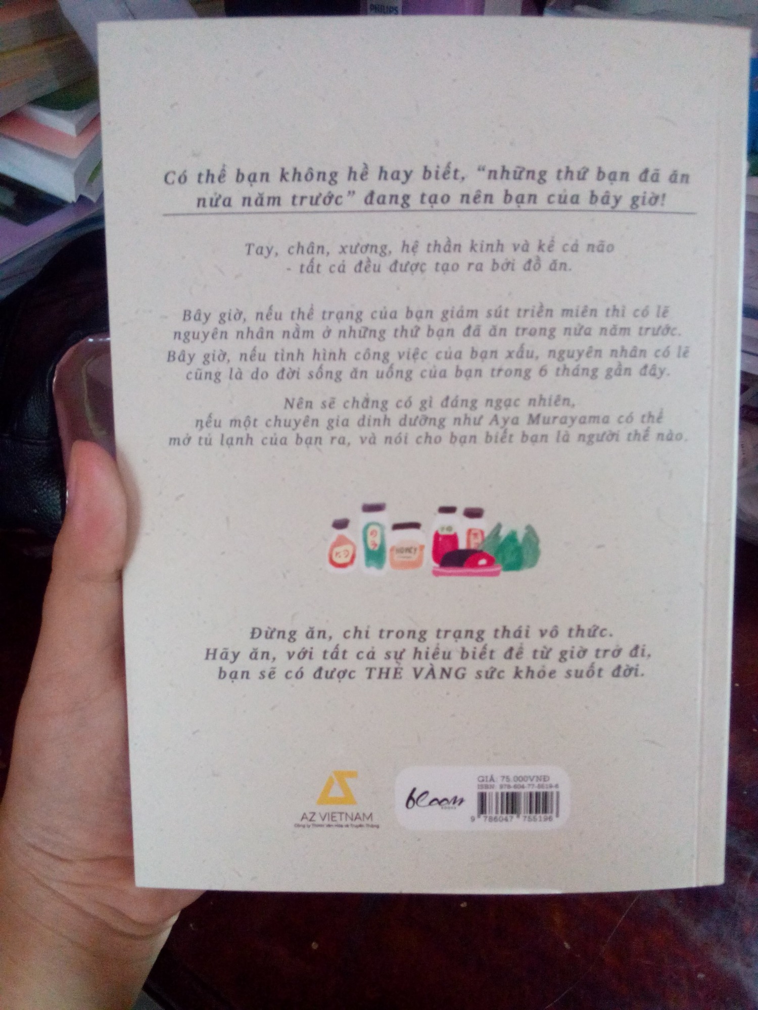 Bạn Là Những Gì Bạn Ăn 6 Tháng Trước Có thể bạn không hề hay biết, “những thứ bạn đã ăn nửa năm trước” đang tạo nên bạn của bây giờ! Tay, chân, xương, hệ thần kinh và kể cả não – tất cả đều được tạo ra bởi đồ ăn. Bây giờ, nếu thể trạng của bạn giảm sút triền miên thì có lẽ nguyên nhân nằm ở những thứ bạn đã ăn trong nửa năm trước. Bây giờ, nếu tình hình công việc của bạn xấu, nguyên nhân có lẽ cũng là do đời sống ăn uống của bạn trong 6 tháng gần đây. Nên sẽ chẳng có gì đáng ngạc nhiên, nếu một chuyên gia dinh dưỡng như Aya Murayama có thể mở tủ lạnh của bạn ra, và nói cho bạn biết bạn là người thế nào. Đừng ăn, chỉ trong trạng thái vô thức. Hãy ăn, với tất cả sự hiểu biết để từ giờ trở đi, bạn sẽ có được THẺ VÀNG sức khỏe suốt đời.