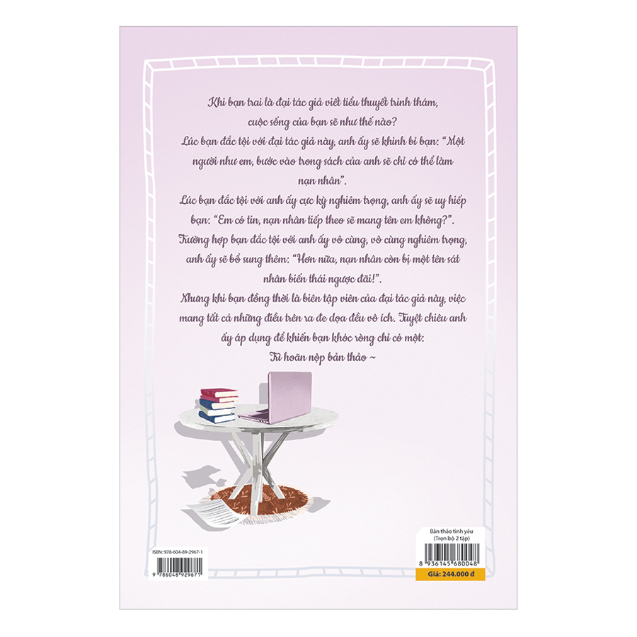 Bản Thảo Tình Yêu ( 2 Tập) Khi bạn trai là đại tác giả viết tiểu thuyết trinh thám, cuộc sống của bạn sẽ như thế nào? Lúc bạn đắc tội với anh ấy, anh ấy sẽ khinh bỉ bạn: “Một người như em, bước vào trong sách của anh sẽ chỉ có thể làm nạn nhân”. Lúc bạn đắc tội với anh ấy cực kỳ nghiêm trọng, anh ấy sẽ uy hiếp bạn: “Em có tin nạn nhân tiếp theo sẽ mang tên em không?”. Trường hợp bạn đắc tội với anh ấy vô cùng, vô cùng nghiêm trọng, anh ấy sẽ bổ sung thêm: “Hơn nữa, nạn nhân còn là người bị một tên sát nhân biến thái ngược đãi!”. Nhưng khi bạn đồng thời là biên tập viên của đại tác giả này, việc mang tất cả những điều trên ra đe dọa đều vô ích. Tuyệt chiêu anh ấy áp dụng để khiến bạn khóc ròng chỉ có một: Chây ì bản thảo~ Tập 1 – 340 trang Tập 2 – 365 trang