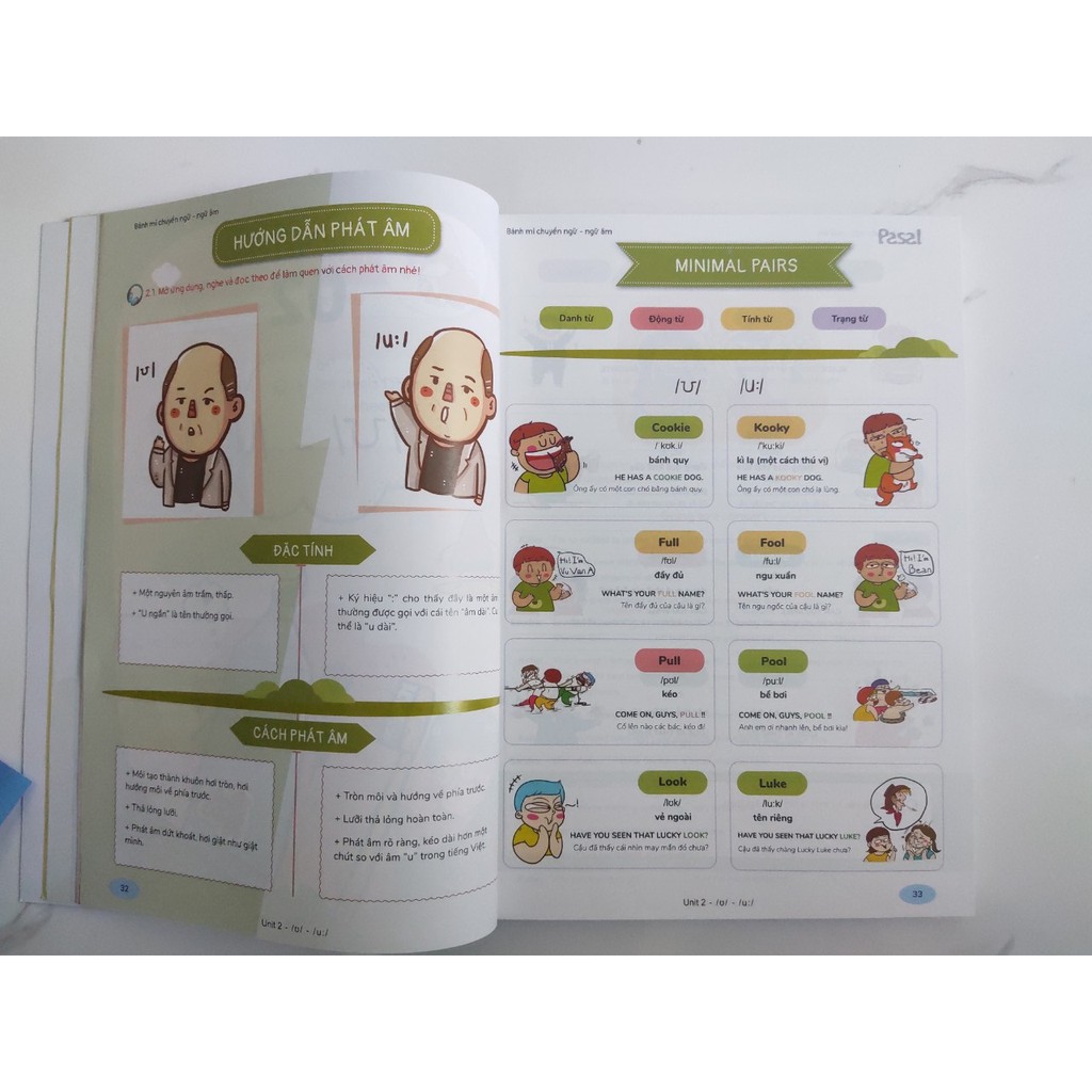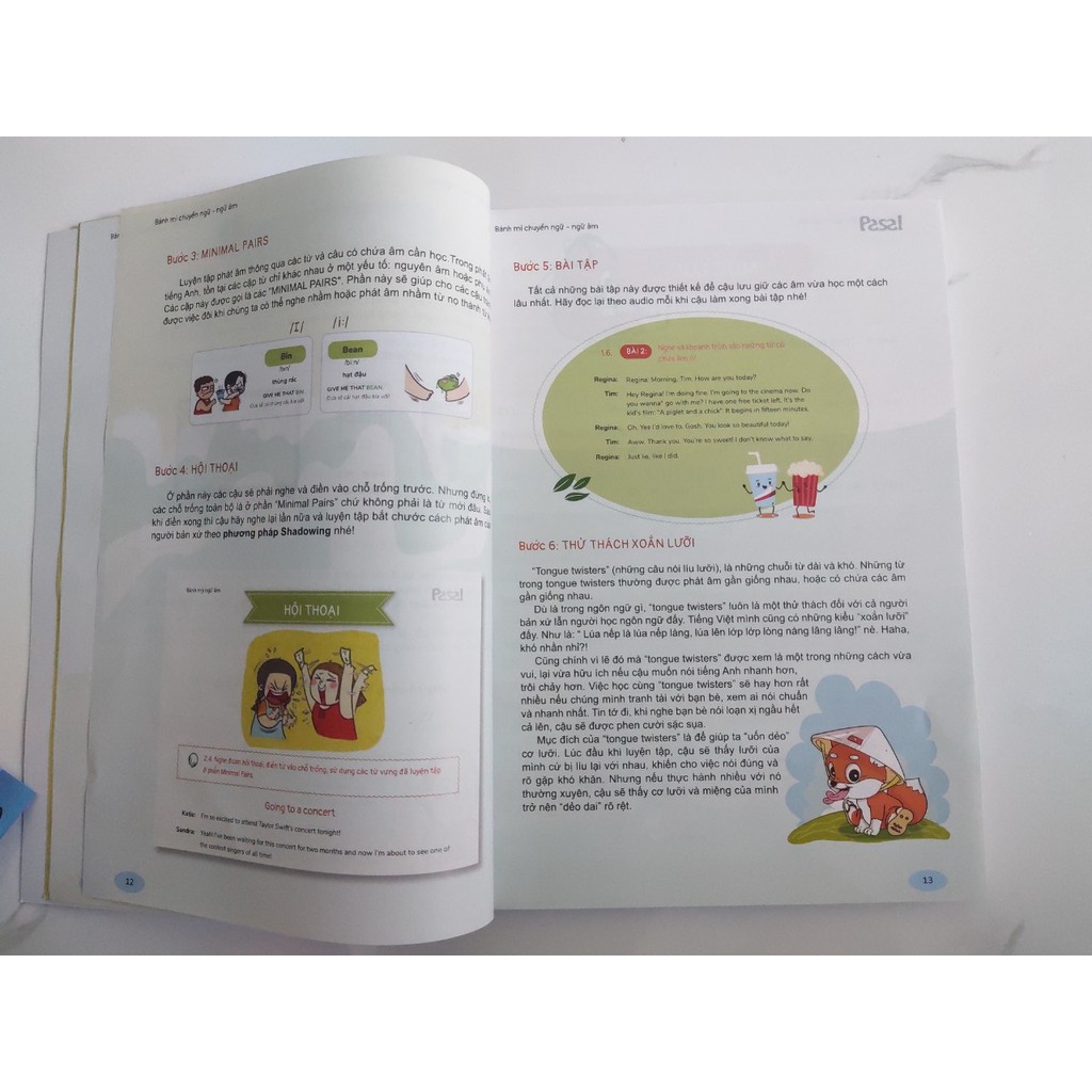 Sách Bánh mì chuyển ngữ: Ngữ âm (Kèm tài khoản Apps tự học và bộ 7 nguyên tắc phát âm hoàn hảo của Paul S.Gruber) Năm phát hành: 2020 Số trang: 100+ Nội dung: Chào các cậu. Tớ được xây dựng dựa trên Pronunciation Workshop – Hệ thống ngữ âm hàng đầu do chuyên gia ngôn ngữ Paul S. Gruber sáng lập và phát triển. Hệ thống này chú trọng vào việc phát âm chuẩn như người bản xứ thông qua việc đặt đúng khẩu hình, môi và lưỡi. Nếu cậu là 1 ai đó dưới đây, hãy để tớ trở thành người bạn đồng hành của các cậu nhé: Các bạn nhỏ muốn có nền tảng học tiếng Anh vững chắc từ sớm với sự hướng dẫn của bố mẹ. Học sinh cấp 3 đang muốn cải thiện và nâng cao kỹ năng phát âm và giao tiếp. Sinh viên muốn cải thiện khả năng giao tiếp và phát âm để thi lấy chứng chỉ quốc tế (IELTS, TOEIC,…) Người đi làm muốn nâng cao khả năng phát âm và giao tiếp tiếng Anh để phục vụ công việc. Nếu các cậu vẫn còn đang băn khoăn có nên đọc tớ hay không, để tớ nói cho các cậu 3 điều thú vị về tớ nhé: Tớ khác biệt vì tớ được xây dựng dựa trên Pronunciation Workshop do chuyên gia Paul S. Gruber sáng lập và phát triển. Và hiện nay Pasal đang là đối tác độc quyền với Paul S. Gruber tại Việt Nam. Tớ thú vị vì tớ chứa đựng rất nhiều hình ảnh minh họa đẹp mắt cùng nhiều mẩu chuyện ngắn hài hước lại gần gũi. Tớ tiện lợi vì tớ còn có app đã tích hợp sẵn các file audio hướng dẫn phát âm cần thiết. Các cậu có thể đi bất cứ đâu mà vẫn có thể học cùng với tớ. Tớ thật tuyệt vời phải không nào! Trọn bộ giải pháp mà tớ đem lại cho cậu sẽ bao gồm: – Sách Bánh Mì Chuyển Ngữ: Phiên bản Ngữ Âm – Tài khoản tự học Online qua App Bánh Mì Chuyển Ngữ – Ebook bí quyết phát âm hoàn hảo của Paul S.Gruber – 3 buổi coaching Online – tư vấn lộ trình học 1-1 hiệu quả – Tham gia vào cộng đồng tự học và chăm sóc 24/7 “Bánh mì chuyển ngữ” là một bộ sách gồm 2 cuốn Bánh mì chuyển ngữ – Ngữ âm & Bánh mì chuyển ngữ – Phản xạ giao tiếp: – Cuốn sách Ngữ âm gồm 26 unit chính hướng dẫn phát âm 43 âm IPA, cùng 6 unit bonus tập trung vào các quy tắc phát âm nâng cao như nối âm, nhấn trọng âm và đọc âm cuối. Mỗi bài học bao gồm hướng dẫn phát âm cùng với các từ mẫu, các đoạn hội thoại và bài tập để giúp các bạn nâng cao khả năng phát âm cũng như giao tiếp của mình. – Cuốn sách phản xạ giao tiếp vẫn đang là một bí ẩn, hãy cùng chờ đón nhé! Cải thiện phát âm và Phản xạ giao tiếp dựa trên hệ thống Pronunciation Workshop và Efforless English – hai phương pháp học hiệu quả đã giúp hàng triệu người cải thiện khả năng phát âm và giao tiếp tiếng Anh. Học mà vui với hệ thống bài học được thiết kế theo hướng hài hước và thân thiện, giúp cậu có niềm hứng khởi trong suốt quá trình học.