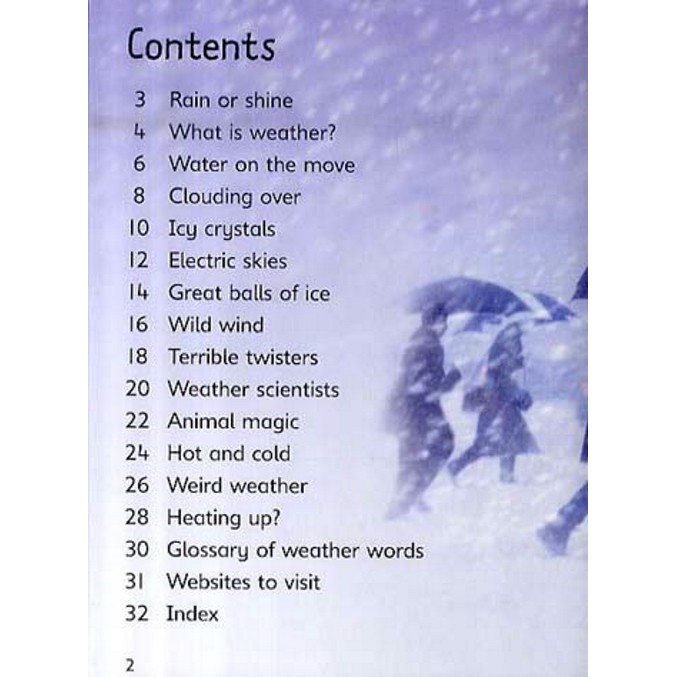 1 Giới thiệu Sách – Beginner Weather Cuốn sách này sẽ cung cấp cho bé kiến thức về các dạng khí hậu, thời tiết khác nhau. Đọc sách bạn sẽ vô cùng ngạc nhiên khi b iết rằng, không chỉ có nóng lạnh, mà còn có rất nhiều hình thái khí hậu khác nhau: những cơn gió lốc, những trận vòi rồng, những lớp băng tuyết ẩn chứa nhiều thông tin thú vị. Sách được in màu đẹp mắt, với mỗi trang có nhiều hình ảnh. Câu văn ngắn gọn, súc tích nhưng chứa đựng nhiều thông tin quý giá. Ngoài ra, sách còn có nhiều đường dẫn Internet Link để giúp các bé chủ động tìm kiếm thông tin, mở rộng kiến thức và vấn đề quan tâm 2. Thông tin Sách – Beginner Weather Sách bìa cứng Số trang: 32 Nhà xuất bản : Usborne Publishing Ltd (2012) Năm xuất bản 2018 ISBN-10: 0746071493 ISBN-13: 978-0746071496