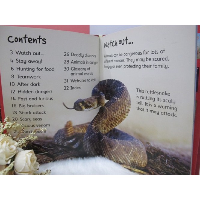 1. Giới thiệu Sách – Beginners Dangerous Animals BEGINNERS DANGEROUS ANIMALS nằm trong series sách Beginners của Nhà Xuất Bản Usborne dành cho các bé nhỏ bắt đầu tìm hiểu các kiến thức khoa học thuộc nhiều lĩnh vực khác nhau Sách có văn phong sách ngắn gọn, dễ hiểu, cùng hình minh họa sống động, dành cho bé từ 4 tuổi BEGINNERS DANGEROUS ANIMALS bàn về một chủ đề thú vị: các loài động vật nguy hiểm trên thế giới. Thế giới các loài rắn, Gấu trắng, Hổ, Sói… hiện ra thật sinh động. Các bé sẽ hiểu tập tính bầy đàn, cách thức săn mồi của các loài động vật này, hiểu được tại sao chúng lại trở nên hung dữ để bảo vệ bản năng sinh tồn của mình 2. Thông tin Sách – Beginners Dangerous Animals Bìa cứng ISBN: 9780746088630 Tác giả Rebecca Gilpin Độ tuổi 4+ Nhà xuất bản Usborne Năm xuất bản 2018 Số trang 32 Kích thước 204 x 150mm