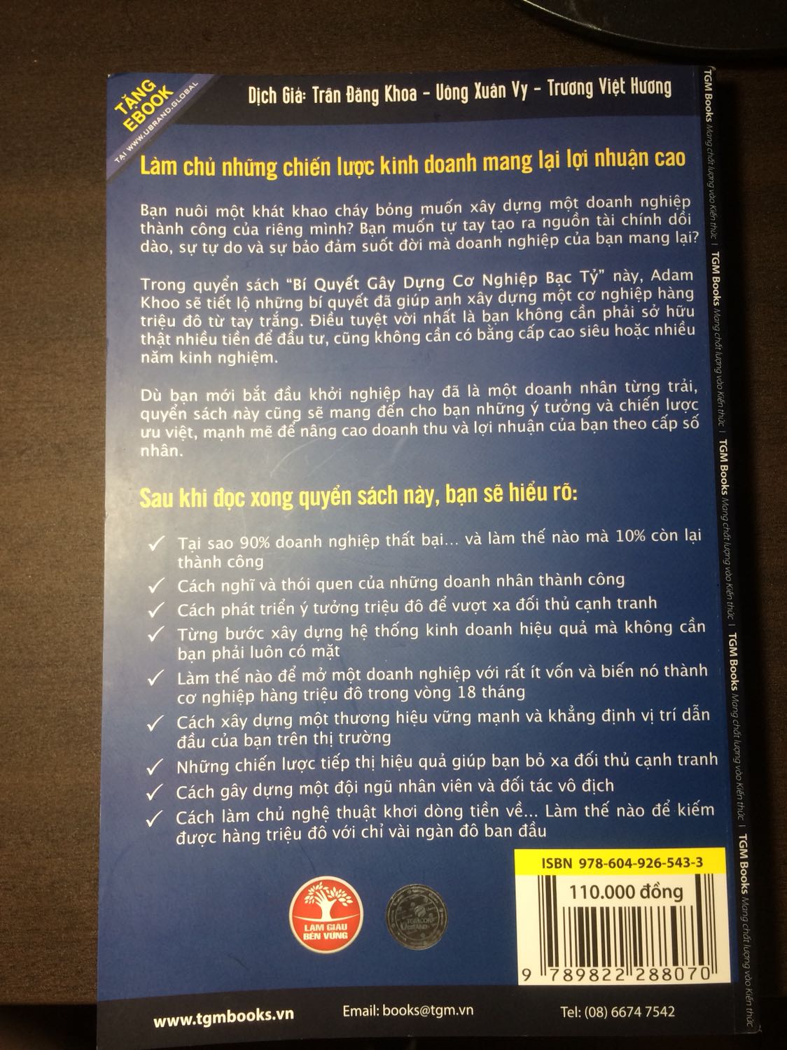 Bạn nuôi một khát khao cháy bỏng muốn xây dựng một doanh nghiệp thành công của riêng mình? Bạn muốn tự tay tạo ra nguồn tài chính dồi dào, sự tự do và sự bảo đảm suốt đời mà doanh nghiệp của bạn mang lại? Trong quyển sách “Bí quyết gây dựng cơ nghiệp bạc tỷ” này, Adam Khoo sẽ tiết lộ những bí quyết đã giúp anh xây dựng một cơ nghiệp hàng triệu đô từ tay trắng. Điều tuyệt vời nhất là bạn không cần phải sở hữu thật nhiều tiền để đầu tư, cũng không cần có bằng cấp cao siêu hoặc nhiều năm kinh nghiệm Dù bạn mới bắt đầu khởi nghiệp hay đã là một doanh nhân từng trải quyển sách này cũng sẽ mang đến cho bạn những ý tưởng và chiến lược ưu việt, mạnh mẽ để nâng cao doanh thu và lợi nhuận của bạn theo cấp số nhân Sau khi đọc xong quyển sách này, bạn sẽ hiểu rõ: Tại sao 90% doanh nghiệp thất bạà làm thế nào mà 10% còn lại thành công Cách nghĩ và thói quen của những doanh nhân thành công Cách phát triển ý tưởng triệu đô để vượt xa đối thủ cạnh tranh Từng bước xây dựng hệ thống kinh doanh hiệu quả mà không cần bạn phải luôn có mặt Làm thế nào để mở một doanh nghiệp với rất ít vốn và biến nó thành cơ nghiệp hàng triệu đô trong vòng 18 tháng Cách xây dựng một thương hiệu vững mạnh và khẳng định vị trí dẫn đầu của bạn trên thị trường Những chiến lược tiếp thị hiệu quả giúp bạn bỏ xa đối thủ cạnh tranh Cách gây dựng một đội ngũ nhân viên và đối tác vô địch Cách làm chủ nghệ thuật khơi dòng tiền về Làm thế nào để kiếm được hàng triệu đô chỉ với vài ngàn đô ban đầu Mời bạn đón đọc.