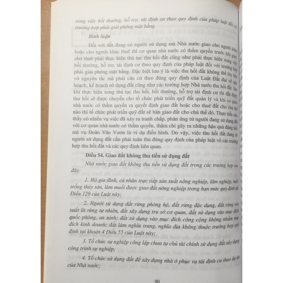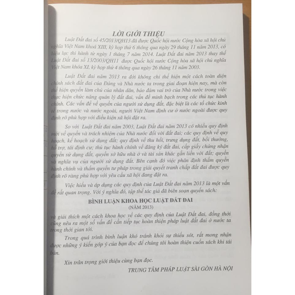 BÌNH LUẬN KHOA HỌC LUẬT ĐẤT ĐAI (NĂM 2013) TS. Phạm Thị Hương Lan (Chủ biên) Nhà xuất bản: Lao Động Ngày phát hành: 1.2018 Số trang: 400 Công ty phát hành: Nhà sách Dân Hiền Lời giới thiệu: Luật Đất đai đã được Quốc hội nước Cộng hòa xã hội chủ nghĩa Việt Nam khoá XIII, kỳ họp thứ 6 thông qua ngày 29 tháng 11 năm 2013, có hiệu lực thi hành từ ngày 1 tháng 7 năm 2014. Đây là Luật Đất đai thay thế Luật Đất đai số 13/2003/QH11 được Quốc hội nước Cộng hòa xã hội chủ nghĩa Việt Nam khóa XI, kỳ họp thứ 4 thông qua ngày 26 tháng 11 năm 2003. So với Luật Đất đai năm 2003, Luật Đất đai năm 2013 có nhiều quy định mới về quyền và trách nhiệm của Nhà nước đối với đất đai; các quy định về quy hoạch, kế hoạch sử dụng đất; quy định về thu hồi, trưng dụng đất, bồi thường, hỗ trợ, tái định cư; thủ tục hành chính về đăng ký đất đai, cấp giấy chứng nhận quyền sử dụng đất, quyền sở hữu nhà ở và tài sản khác gắn liền với đất; quyền và nghĩa vụ của người sử dụng đất. Bên cạnh đó việc phân định thẩm quyền hành chính và thẩm quyền tư pháp trong giải quyết tranh chấp đất đai được quy định rõ ràng phù hợp với yêu cầu xã hội đang đặt ra. Việc hiểu và áp dụng các quy định của Luật Đất đai năm 2013 là một vấn đề rất quan trọng. Với ý nghĩa đó, tập thể tác giả đã biên soạn quyển sách: BÌNH LUẬN KHOA HỌC LUẬT ĐẤT ĐAI (NĂM 2013) và giải thích một cách khoa học về các quy định của Luật Đất đai, đồng thời cũng nêu ra một số vấn đề cần tiếp tục hoàn thiện pháp luật đất đai ở nước ta trong thời gian tới. Trong quá trình bình luận khó tránh khỏi sự thiếu sót, rất mong nhận được những ý kiến góp ý của bạn đọc để chúng tôi hoàn thiện cuốn sách khi tái bản.