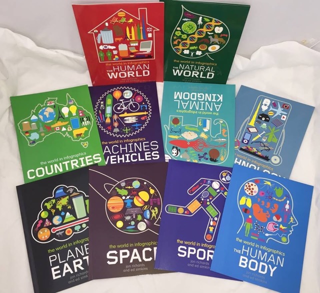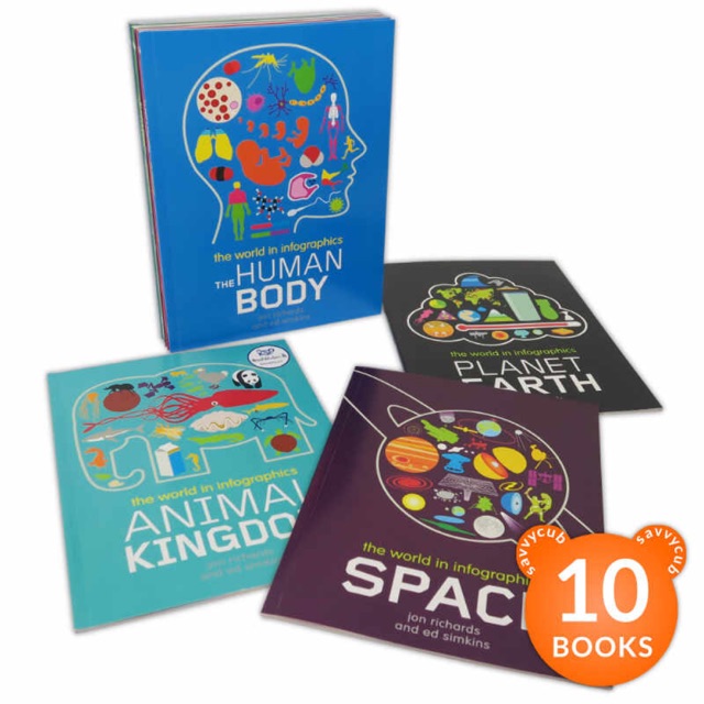 Sách bộ 10 cuốn The world in inforgraphic là bộ sách thú vị bao gồm nhiều chủ đề thú vị sau đây: Natural World Space Sport Technology Machines And Vehicles Human World Human Body Animal Kingdom Countries Planet Earth Sử dụng các hình thức trực quan hóa dữ liệu như biểu tượng, chữ tượng hình và đồ họa, những cuốn sách này trình bày thông tin theo một cách thú vị nhất. Các sự thật về khoa học về các chủ đề khác nhau như không gian, công nghệ, quốc gia và động vật được trình bày bằng đồ họa và giải thích chính xác nhất cho các độc giả nhí mê tìm hiểu. Năm xuất bản: 2018 Số trang: 20 trang mỗi cuốn Tác giả: Nhiều tác giả