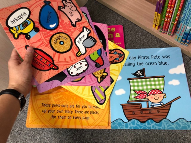 Bé có thể tự sáng tạo ra câu chuyện của riêng mình bằng các miếng ghép đi kèm. Đi kèm với trang đầu tiên của sách là những items phù hợp với câu chuyện. Việc của bé là tự chọn lựa ra được vật dụng/ đồ vật/con vật nào phù hợp với ngữ cảnh. Ví dụ: One day Pirate Pete was siling the ocean blue. He said: ” I see a ____ in the sky” – Bé sẽ lựa chọn giữa helicopter ,seagull ,doughnut ,balloon ,spaceship để điền vào cho câu chuyện của mình. Cứ như thế, có thể có đến vài chục phiên bản truyện khác nhau tùy theo sự sáng tạo của bé. Một cuốn sách khá là đáng mua, có giá bìa 8.99 Bảng/cuốn. Nếu mua ở Anh bạn sẽ phải mất khoảng 270k/cuốn Mời Ba Mẹ đặt hàng để làm quà cho con. • Số trang: 18 • Size: 240 x 220 mm • Năm xuất bản: 2011 • #PiratePete #WalkerBooks • #BỏngNgôStore #SachChoBe #SachThieuNhi
