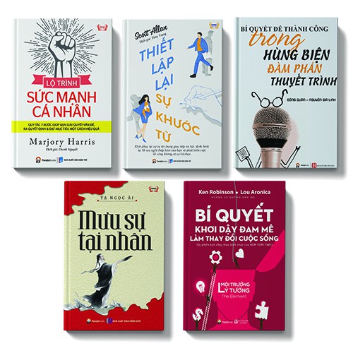 1. Lộ trình sức mạnh cá nhân Tác giả: Marjory Harris Nhà xuất bản: Nhà Xuất Bản Dân Trí Năm xuất bản: 01-2019 Số trang: 240 Giới thiệu sách: Lộ trình sức mạnh cá nhân là một quy trình giúp giải quyết vấn đề, ra quyết định, đặt mục tiêu và xây dựng kế hoạch. Điều này phụ thuộc vào ba kỹ năng thiết yếu mà tất cả chúng ta đều có từ khi sinh ra – đó là tưởng tượng, nhận thức và có động lực, các phương pháp giúp mài giũa những kỹ năng thiết yếu này và bài tập thực hành để chỉ ra cách áp dụng những phương pháp đó. Có năm bảng định dạng riêng được tùy chỉnh cho từng người (Lộ trình) và Lộ trình này có thể được sử dụng trên nhiều nền tảng, thiết bị hoặc trên giấy. Cuốn sách này sẽ chỉ ra cách khám phá và sử dụng ba kỹ năng thiết yếu bạn sẵn có – đó là tưởng tượng, nhận thức và có động lực – để đưa bạn đến đích mong muốn. 2. Thiết lập lại sự khước từ Tác giả: Scott Allan Nhà xuất bản: Nhà Xuất Bản Dân Trí Năm xuất bản: 01-2019 Số trang: 304 Giới thiệu sách: Bạn có từng ở trong một hoàn cảnh xã hội mà bạn cảm thấy bị đe dọa và quá sợ hãi để cất tiếng nói của mình? Bạn có tin rằng mình không có gì để đóng góp cho cuộc trò chuyện nên hầu như trong mọi lúc bạn đều giữ im lặng? Bạn có cảm thấy bị khước từ khi ở cạnh người khác và cảm thấy rằng không ai nhìn thấy “con người thật” của bạn? Bạn có sợ phát biểu ý tưởng của mình một cách công khai vì bạn có thể nhận được một lời nhục mạ? Nếu bạn thấy điều này nghe quen thuộc, thì bạn không đơn độc đâu. Sợ hãi sự khước từ là tình trạng tiến thoái lưỡng nan ảnh hưởng đến mọi người ở những mức độ khác nhau: Khi ở nhà, tại nơi làm việc và trong xã hội, chúng ta liên tục chiến đấu với những lời chỉ trích, phán xét, ý kiến và mong muốn được chấp nhận của bản thân. Cuốn “Thiết lập lại sự khước từ” dành cho bất cứ ai muốn tìm cách vượt qua những rào cản và thách thức khi đương đầu với sự khước từ xã hội. Những sự “đau đớn” khi bị khước từ có thể xảy ra trong tâm trí bạn [tự chối bỏ bản thân] và ở ngoài đời thực. 3. Bí quyết thành công trong hùng biện, đàm phán, thuyết trình Tác giả: Nguyễn Gia Linh, Đổng Quân Nhà xuất bản: Nhà Xuất Bản Hồng Đức Năm xuất bản: 2017 Số trang: 364 Giới thiệu sách: Sách cũng đề cập đến một số vấn đề mà dường như mỗi người chúng ta đều gặp phải trong xã hội hiện đại: Làm thế nào mới có thể tăng cường được tài hùng biện của mình cũng như là nâng cao khả năng tiêu thụ hàng hóa và tăng thu nhập. Cuốn sách cung cấp những phương pháp giúp các bạn biết được cần phải nói gì ở cuộc họp, qua điện thoại. Bạn cũng có thể coi đây như một tài liệu hướng dẫn ăn nói và diễn thuyết. Chỉ khi có được kỹ năng đàm phán, thuyết trình thì bạn mới có thể ung dung kinh doanh trên thị trường khốc liệt, nhân viên chấp hành tốt mệnh lệnh của bạn, khiến cho mệnh lệnh của bạn được tiến hành thuận lợi và xuất sắc. Tất cả những điều này đều được quyết định bởi khả năng ăn nói của bạn. Có thể thấy rằng muốn thành công thì không thể thiếu được tài hùng biện. Hiện nay, kinh doanh ngày càng cạnh tranh khốc liệt hơn, là một thương nhân, một mặt cần phải “luyện chiêu” ăn nói, mặt khác cần phải quản lý nội bộ. 4. Bí quyết khơi dậy đam mê làm thay đổi cuộc sống Tác giả: Nhiều Tác Giả Nhà xuất bản: Nhà Xuất Bản Lao Động Năm xuất bản: 08-2015 Số trang: 406 Giới thiệu sách: Bí Quyết Khơi Dậy Đam Mê Cuốn sách Bí Quyết Khơi Dậy Đam Mê bao gồm một lượng lớn các câu chuyện về những cuộc hành trình sáng tạo của rất nhiều người; trong số đó có những người được phỏng vấn riêng. Họ nói về lần đầu tiên nhận ra tài năng độc đáo của riêng mình và cách thức để tạo nên một cuộc đời thành công khi làm những gì mình yêu thích. 5. Mưu sự tại nhân Tác giả: Tạ Ngọc Ái Nhà xuất bản: Nhà Xuất Bản Hồng Đức Năm xuất bản: 01-2019 Số trang: 408 Giới thiệu sách: “Mưu sự tại nhân, hành sự tại thiên”. Người thông minh biết tận dụng ưu thế vượt trội, người tự tin biết khai thác ưu thế nội lực, người giỏi giang biết tạo ưu thế cạnh tranh. Con đường đi tới thành công bao giờ cũng gập ghềnh hiểm trở. Trên chặng đường đó phải chấp nhận cạnh tranh với những đối thủ hùng hậu, phải vượt qua rất nhiều chông gai hiểm họa, thoát khỏi vô số cạm bẫy. Muốn giữ cho cơ nghiệp vững bền thì phải không ngừng học tập, bổ sung trau dồi kiến thức, học cái hay cái mạnh của người khác để tự hoàn thiện mình. Trong cuộc sống cũng như trong sự nghiệp phải vượt qua mọi thử thách tôi luyện, tích luỹ đầy đủ kinh nghiệm, không ngừng tăng cường khả năng cạnh tranh. Cho dù vấp váp thất bại cũng không chùn bước, m
