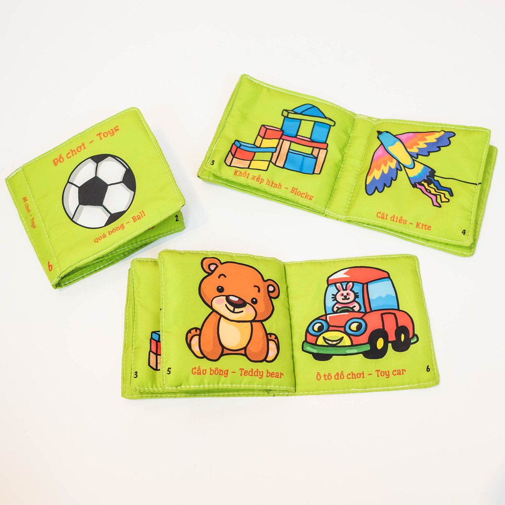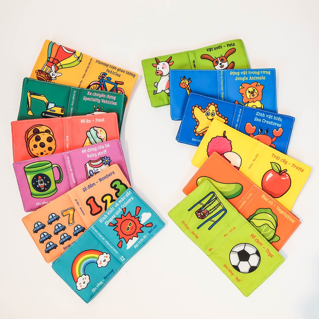 Sách vải đồng hành cùng con trưởng thành. Trẻ sơ sinh được đảm bảo an toàn tuyệt đối với chất liệu vải chuyên dụng của sách vải: +Vải khử trùng giữ vệ sinh sạch +Chất liệu mềm mại +Trọng lượng nhẹ Con được phát triển tối đa các giác quan +Xúc giác qua việc sờ nắm sách +Thính giác qua âm thanh sột soạt của màng PP vui tai +Thị giác cùng các khung màu cơ bản Tạo điều kiện cho nhiều kĩ năng phát triển sau này +Tư duy về hình ảnh, hình khối, màu sắc cơ bản +Các từ tiếng việt, tiếng anh cơ bản dễ dàng áp dụng để mở rộng vốn từ +Hứng thú với sách, hình thành sự yêu sách và thói quen đọc sách. Sách vải là trợ giúp đắc lực cho bố mẹ Giúp bố mẹ yên tâm về độ an toàn sách vải đối với bé con nhà mình Dễ dàng vệ sinh, chỉ cần đem giặt là sách vải lại như mới, tiết kiệm thời gian cho bố mẹ. Độ bền có thể lên đến 10 năm, tiết kiệm chi phí cho gia đình mình. Một cuốn sách đơn giản để bố mẹ dành 1-2 phút cùng con nhỏ đọc sách mỗi ngày. + Thể loại: Sách vải kích thích đa giác quan song ngữ + Nội dung: Bộ sách gồm 6 cuốn là 6 chủ đề thân quen giúp các bé khám phá thế giới xung quanh một cách toàn diện hơn Cuốn 7: Phương tiện giao thông Cuốn 8: Xe chuyên dụng Cuốn 9: Đồ ăn Cuốn 10: Đồ dùng của bé Cuốn 11: Số đếm Cuốn 12: Hình khối và màu sắc + Độ tuổi: 0+ + Kích thước: 11×11 cm + Số trang: 8 trang/ cuốn