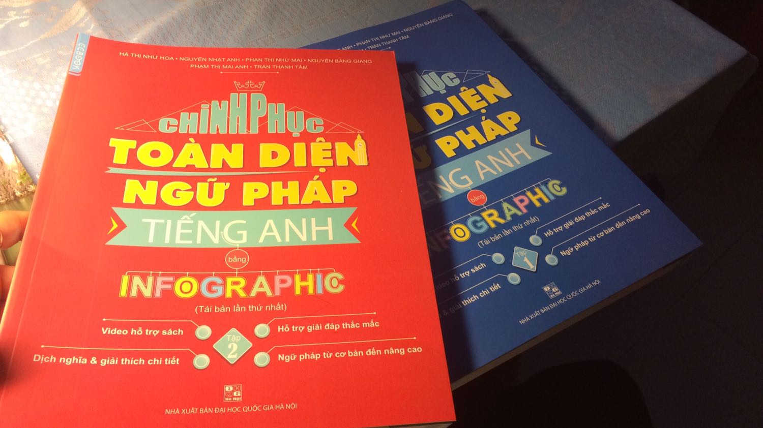 Chinh phục toàn diện ngữ pháp tiếng Anh bằng Infographic (2 tập) Là nền tảng của ngôn ngữ, ngữ pháp đóng vai trò quan trọng trong việc xây dựng nền móng để phát triển các kỹ năng nghe; nói; đọc; viết. Hiểu được sự cần thiết của ngữ pháp tiếng Anh, Nhà xuất bản Đại học Quốc gia Hà Nội phối hợp cùng đơn vị CCBook biên soạn cuốn sách “Chinh phục toàn diện ngữ pháp tiếng Anh bằng Infographic tập 2”. Khối lượng kiến thức được trình bày dưới dạng infographic ngắn gọn, súc tích với các ví dụ minh họa sinh động kèm theo lời giải chi tiết sẽ giúp bạn đọc dễ dàng tiếp cận và vận dụng kiến thức một cách chủ động, hiệu quả. Giới thiệu về cuốn sách Chinh phục toàn diện ngữ pháp tiếng Anh bằng infographic tập 2 Bộ sách “Chinh phục toàn diện ngữ pháp tiếng Anh bằng infographic” gồm có 20 chuyên đề được chia thành 2 tập. Tập 1 có 10 chuyên đề và tập 2 có 10 chuyên đề. Kiến thức ở mỗi chuyên đề được chia thành 2 phần cơ bản và nâng cao được trình bày dưới dạng infographic. Chinh phục toàn diện ngữ pháp tiếng Anh bằng infographic tập 2 có 10 chuyên đề, bao gồm: Cụm động từ; Thể bị động; Liên từ; Sự hòa hợp chủ ngữ & động từ; Giả định thức; Câu gián tiếp; Mệnh đề; Đảo ngữ; Câu hỏi; Cấu tạo từ. Trong mỗi chuyên đề được chia thành 2 phần: phần kiến thức ngữ pháp được trình bày dưới dạng infographic với những sơ đồ, hình ảnh, ví dụ minh họa sinh động; phần 2 là bài tập vận dụng với các câu hỏi được chia theo dạng bài tập cơ bản và nâng cao. Ưu điểm cuốn sách Chinh phục toàn diện ngữ pháp tiếng Anh bằng infographic tập 2 Trên thị trường hiện nay có tới hàng trăm đầu sách tham khảo về ngữ pháp tiếng Anh. Tuy nhiên, để lựa chọn được cuốn sách chất lượng là điều không hề đơn giản. Chinh phục toàn diện ngữ pháp tiếng Anh bằng infographic với những ưu điểm nổi bật sẽ giúp bạn dễ dàng chinh phục được kiến thức về ngữ pháp: Tổng hợp kiến thức ngữ pháp tiếng Anh thông dụng nhất: Qua 20 chuyên đề bài học, các bạn sẽ được học những chủ điểm ngữ pháp thông dụng nhất. Những kiến thức ngữ pháp tiếng Anh này thường xuất hiện trong các đề thi và trong giao tiếp hằng ngày. Kiến thức được trình bày dưới dạng Infographic: Khối lượng kiến thức được trình bày dưới dạng Infographic – biểu hiện thông tin trực quan bằng hình ảnh nhằm truyền tải kiến thức nhanh chóng và rõ ràng. Với thiết kế đẹp mắt; hình ảnh minh họa sinh động. Đảm bảo tính logic, ngắn gọn, súc tích nhằm khơi dậy cảm hứng cho người học; giúp người học dễ tiếp cận với những vấn đề phức tạp hơn. Bài tập được phân theo các mức độ khác nhau: Hệ thống bài tập được chia thành hai mức độ cơ bản và nâng cao sẽ giúp người học ghi nhớ và củng cố lượng kiến thức đã học. Ngoài ra, có thể dễ dàng đánh giá được lực học của mình đang ở mức độ nào; xác định kiến thức cần bổ sung thêm. Lời giải chi tiết, dễ hiểu: Đáp án, giải thích chi tiết và dịch nghĩa nằm ở những trang cuối của cuốn sách nhằm giúp bạn đọc kiểm tra; đánh giá năng lực của mình. Rất thuận lợi để các bạn tự chủ động trong quá trình học.
