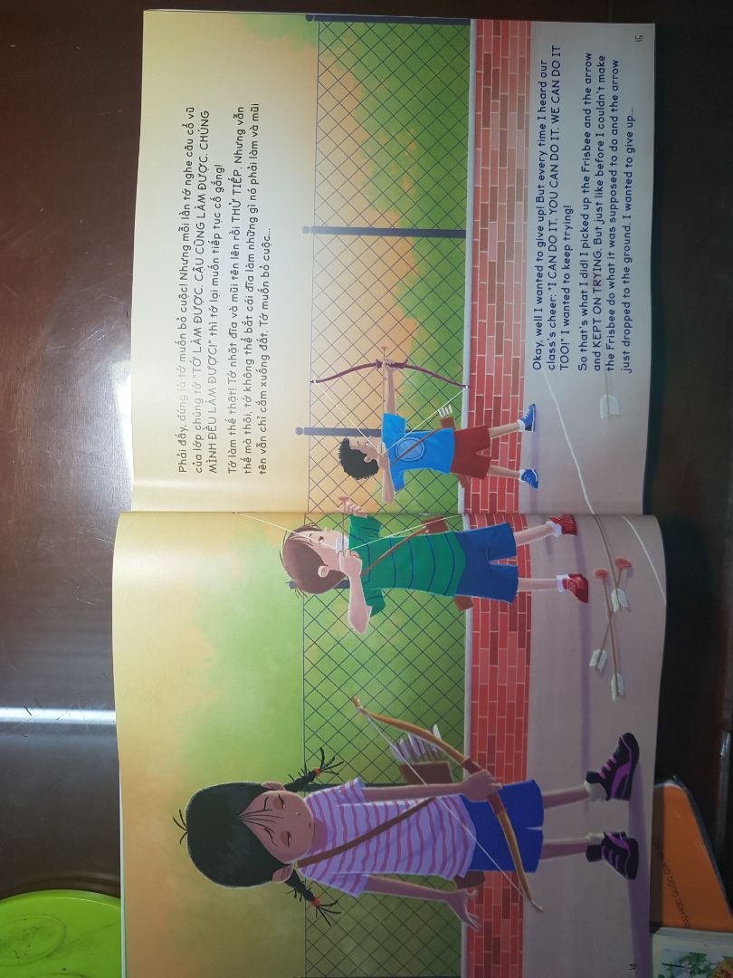 Bộ Song Ngữ – Kiên Trì Không Bỏ Cuộc Tớ sẽ tham dự Thế vận hội! Thật tuyệt, trường của tớ tổ chức Ngày hội thể thao và tất cả học trò toàn trường sẽ được thi đấu. Đội lớp tớ chọn tên là Chiến mã, vì chúng tớ mạnh mẽ, chúng tớ sẽ gắng sức, và chúng tớ không bỏ cuộc. Tớ cũng rất cố gắng. Nhưng tớ bó tay với môn ném đĩa và bắn tên, khó đến mức phát khóc lên được! Liệu tớ có thể kiên trì đến cùng, hay tớ sẽ từ bỏ? Cuốn sách này rèn tính kiên trì. Cả bộ có 4 cuốn.