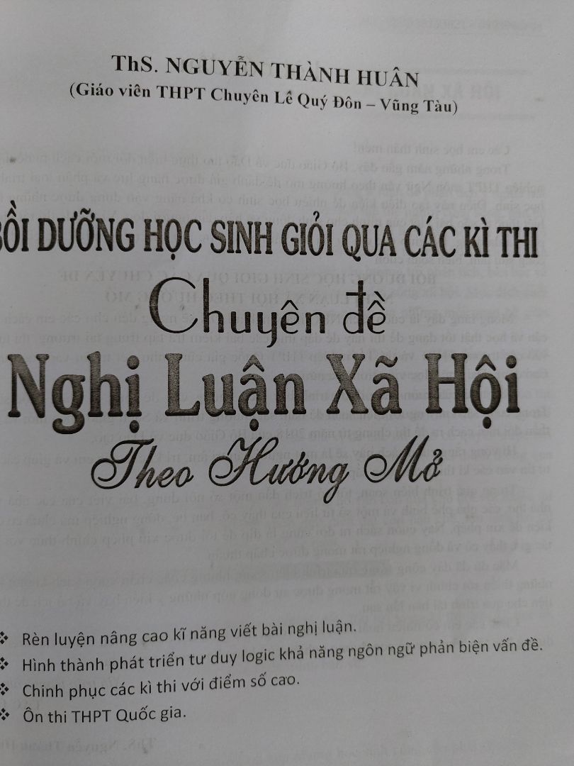 Các em học sinh thân mến! Trong những năm gần đây, Bộ Giáo dục và Đào tạo thực hiện đổi mới cách ra đề thi tốt nghiệp THPT môn Ngữ văn theo hướng mở để đánh giá được năng lực và phân loại trình độ học sinh. Điều này tạo điều kiện để nhiều học sinh có khả năng vận dụng được những hiểu biết thực tế vào bài viết của mình cho sinh động và hấp dẫn người đọc. Vì thế đề thi rất phong phú và đa dạng. Để giúp các em tự tin gặt hái những ước mơ cho riêng mình tác giả đã dày công sưu tầm, biên soạn cuốn BỒI DƯỠNG HỌC SINH GIỎI QUA CÁC CHUYÊN ĐỀ NGHỊ LUẬN XÃ HỘI THEO HƯỚNG MỞ mong rằng đây là cuốn sách NHỎ mà ý nghĩa LỚN sẽ mang đến cho các em cách tiếp cận và học thật tốt dạng đề thi này để đáp ứng các bài kiểm tra tập trung tại trường, thi tuyển vào các trường THPT và thi Tốt nghiệp THPT Quốc gia cũng như xét tuyển vào các trường Cao đẳng, Đại học, Học viện trong cả nước. Cấu trúc của cuốn sách được trình bày theo những vấn đề thực tế trong cuộc sống. Trong cuốn sách này người biên soạn đã bám sát chương trình và Sách giáo khoa mới và tinh thần đổi mới cách ra đề thi chung từ năm 2018 của Bộ Giáo dục và Đào tạo. Hi vọng rằng cuốn sách này sẽ là một người bạn tri âm, tri kỉ của các em và giúp các em tự tin vào các kì thi quan trọng sắp tới. Trong quá trình biên soạn, tôi có trích dẫn một số nội dung, bài viết của các nhà văn, nhà thơ, các nhà phê bình và một số tư liệu của thầy cô, bạn bè, đồng nghiệp mà chưa có điều kiện để xin phép. Nay cuốn sách ra đời cũng là dịp để tôi được xin phép chính thức với quý tác giả, thầy cô và đồng nghiệp rất mong được chấp thuận. Mặc dù đã dày công trong quá trình biên soạn, nhưng chắc chắn cuốn sách không khỏi những thiếu sót chính vì vậy rất mong được sự đóng góp những ý kiến hay và bổ ích để thuận tiện cho quá trình tái bản lần sau. Chúc các em có nhiều hoài bão, khát vọng, học giỏi, đạt được nhiều thành tích trên con đường học tập hôm nay và con đường nghiên cứu khoa học trong tương lai.