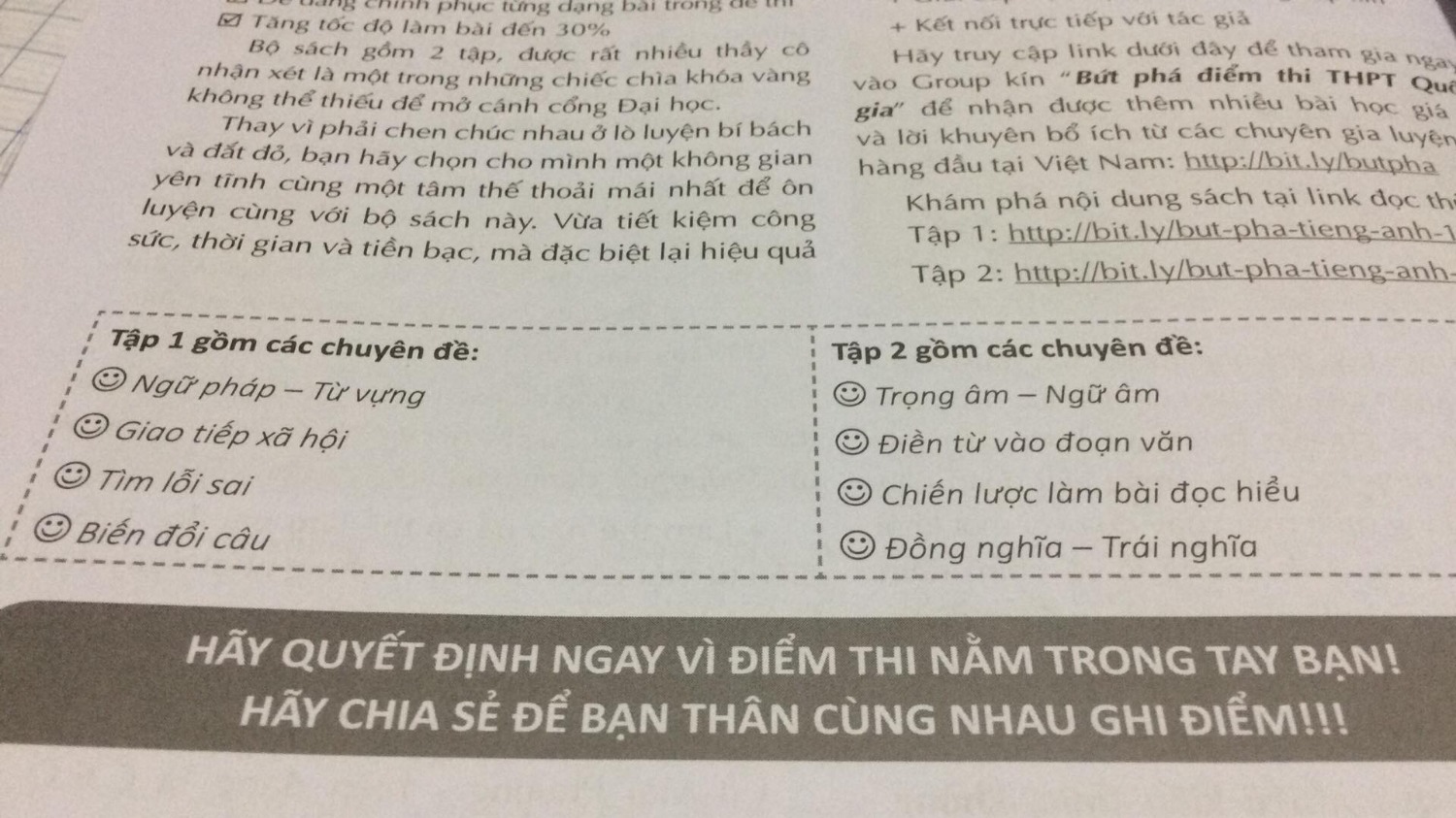 Bứt Phá Điểm Thi THPT Quốc Gia Môn Tiếng Anh 1 Kỳ thi THPT Quốc gia là một kỳ thi quan trọng, đánh dấu một bước ngoặt to lớn của cuộc đời các em học sinh. Chỉ còn vài tháng ngắn ngủi là các em đã phải tham gia kỳ thi rồi. Để có được một kết quả cao nhất các em cần phải cố gắng nỗ lực, luyện tập hằng ngày và trên hết các em phải có được một tài liệu ôn tập phù hợp, bám sát được xu hướng ra đề. Chắc hẳn giờ đây các em đều đang rất hồi hộp và lo lắng. Thấu hiểu được tâm lý đó, chúng tôi sẽ bật mí cho các em bí kíp giúp bứt phá tốc lực điểm thi môn tiếng Anh THPT Quốc gia. Tiếng Anh không khó, nhưng ôn thi THPT Quốc gia môn Tiếng Anh lại đầy áp lực bởi vì: Tiếng Anh có quá nhiều kiến thức, không biết phải ôn gì và bắt đầu từ đâu Đề thi tiếng Anh bao gồm 50 câu chứa đến 8 dạng bài trong đó như: trọng âm/ ngữ âm, đọc hiểu, từ vựng, điền từ, tìm lỗi sai,… với cực kỳ nhiều kiến thức lồng ghép bên trong. Do vậy nhiều bạn không biết ôn tập từ đâu, ôn như thế nào trong khi kỳ thi đang tới rất gần. Trong khi đó các tài liệu ôn thi trên thị trường hiện nay đều “nhồi nhét” quá nhiều kiến thức cho các em. Không có phương pháp làm bài trắc nghiệm tiếng Anh hiệu quả Trong 50 câu trắc nghiệm tiếng Anh có đến 50% các câu hỏi thuộc dạng đọc hiểu. Các sĩ tử thường mất khá nhiều thời gian ở phần này. Đa số các em đều cặm cụi đọc và dịch nghĩa nhưng vẫn không tìm được đáp áp đúng. Trong đề thi còn có nhiều câu hỏi bẫy, đánh đố học sinh. Để giải quyết tốt đòi hỏi các em cần có phương pháp làm bài nhanh, hiệu quả và phải bỏ túi một số bí kíp nhất định. Áp lực thi cử đè nặng Kỳ thi THPT Quốc gia là kỳ thi quan trọng vừa phục vụ mục đích xét tốt nghiệp, vừa phục vụ tuyển sinh vào đại học. Trong giai đoạn nước rút này các em đều đang có tâm lý lo lắng, sợ hãi khi phải chịu áp lực từ nhiều phía. Bứt phá điểm thi THPT Quốc gia môn Tiếng Anh tập 1 Tổng hợp kiến thức qua các chuyên đề Bứt phá điểm thi THPT Quốc gia môn Tiếng Anh của tác giả Vũ Thị Mai Phương gồm có 2 tập. Tập 1 gồm 4 chuyên đề: Chuyên đề 1: Ngữ pháp – Từ vựng Chuyên đề 2: Giao tiếp xã hội Chuyên đề 3: Tìm lỗi sai Chuyên đề 4: Biến đổi câu Mỗi chuyên đề tác giả đều đi từ lý thuyết đến ví dụ và các bài tập vận dụng giúp học sinh nắm chắc kiến thức nhanh nhất và biết cách áp dụng chúng vào làm thi. Cung cấp các bí quyết làm bài nhanh – Rút gọn thời gian làm bài Thông qua cuốn sách các em sẽ có được những kỹ năng, những mẹo làm bài trắc nghiệm giúp giải quyết nhanh các bài tập. Tìm hiểu cách chọn đáp án đúng một cách thông minh và nhanh chóng nhất. Các em không cần đọc hết cả câu hỏi, dịch nghĩa từng phần mà vẫn có thể ghi điểm tuyệt đối. Nhờ những bí quyết mà tác giả đã tổng hợp chắc chắc các em học sinh sẽ tăng được tốc độ làm bài lên đến 30%, nhờ đó các em sẽ dành được nhiều thời gian để làm những câu khó cũng như rà soát lại bài làm. Tổng hợp nhiều đề thi thử Sách còn tổng hợp tất cả các bẫy chắc chắn sẽ gặp trong đề thi và những cách nhận biết và vượt qua những câu hỏi một cách dễ dàng. Chắc chắn rằng thông qua cuốn sách các em sẽ yêu thích môn tiếng Anh và dễ dàng chinh phục được từng dạng bài trong đề thi. Các em còn có cơ hội được làm các đề thi thử từ những năm trước, qua đó các em sẽ dễ dàng nhận biết được thói quen ra đề của Bộ. Hỗ trợ trong suốt quá trình các em ôn thi Sở hữu cuốn sách các em còn có cơ hội nhận được rất nhiều lợi ích như: – Miễn phí gói hỗ trợ luyện thi 24/7 trị giá 399.000 đồng, sẵn sàng giải đáp các thắc mắc của học sinh trong quá trình ôn luyện – Bộ video tương tác giải đề cực chất của cô Mai Phương – Kết nối trực tiếp với tác giả Vũ Thị Mai Phương Thay vì phải chen chúc ở những lò luyện thi đắt đỏ, bí bách, tại sao các em không chọn cho mình một không gian yên tĩnh và học cùng cuốn sách “Bứt phá điểm thi THPT Quốc gia môn Tiếng Anh”. Hãy mua ngay cuốn sách bổ ích này để có thể đạt được mục tiêu môn tiếng Anh mà các em đã đề ra nhé! Bộ sách Bứt phá điểm thi THPTQG – Bộ sách đặc biệt giúp bạn dễ dàng vượt qua kỳ thi THPTQG 2019 Bí quyết tránh lỗi thường gặp Một sai lầm nhỏ cũng làm bạn mất đi 0,2 điểm. Đối với xét tuyển Đại học, chỉ 0,2 điểm thôi cũng quyết định bạn đỗ hay trượt. Bộ sách sẽ giúp các bạn tránh những cái “bẫy”, không để mất điểm đáng tiếc bởi những câu hỏi đơn giản. Tổng hợp chuyên đề và dạng bài sẽ có trong đề thi Cấu trúc đề thi THPT Quốc gia 2019 có khoảng 20% kiến thức lớp 11 và 80% kiến thức lớp 12. Điều các em học sinh cần nhất chính là nắm chắc kiến thức, hiểu dạng bài và tư duy nhanh để hoàn thành bài thi trong thời gian sớm nhất. Lu