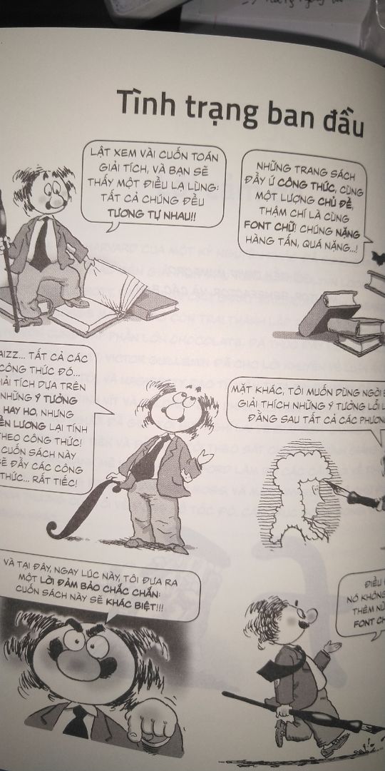 Tiếp theo chủ đề đại số, tác giả Larry Gonick tiếp tục đưa độc giả tiến bước vào vùng đất của toán giải tích, bắt nguồn từ ý tưởng của hai nhà khoa học tên tuổi, mà câu chuyện về ý tưởng này của cả hai người có thể viết hẳn thành một cuốn sách khác. Vẫn là toán học nhưng với các khái niệm trừu tượng hơn như tích phân, đạo hàm, vi phân, tỷ số, tiệm cận, giới hạn…, Larry Gonick đã thành công khi giải thích các khái niệm này thông qua những đồ thị rõ ràng và những ví dụ dí dỏm, đồng thời sau mỗi chủ đề, ông còn cung cấp cho bạn đọc những bài tập đơn giản để áp dụng những gì đã học.