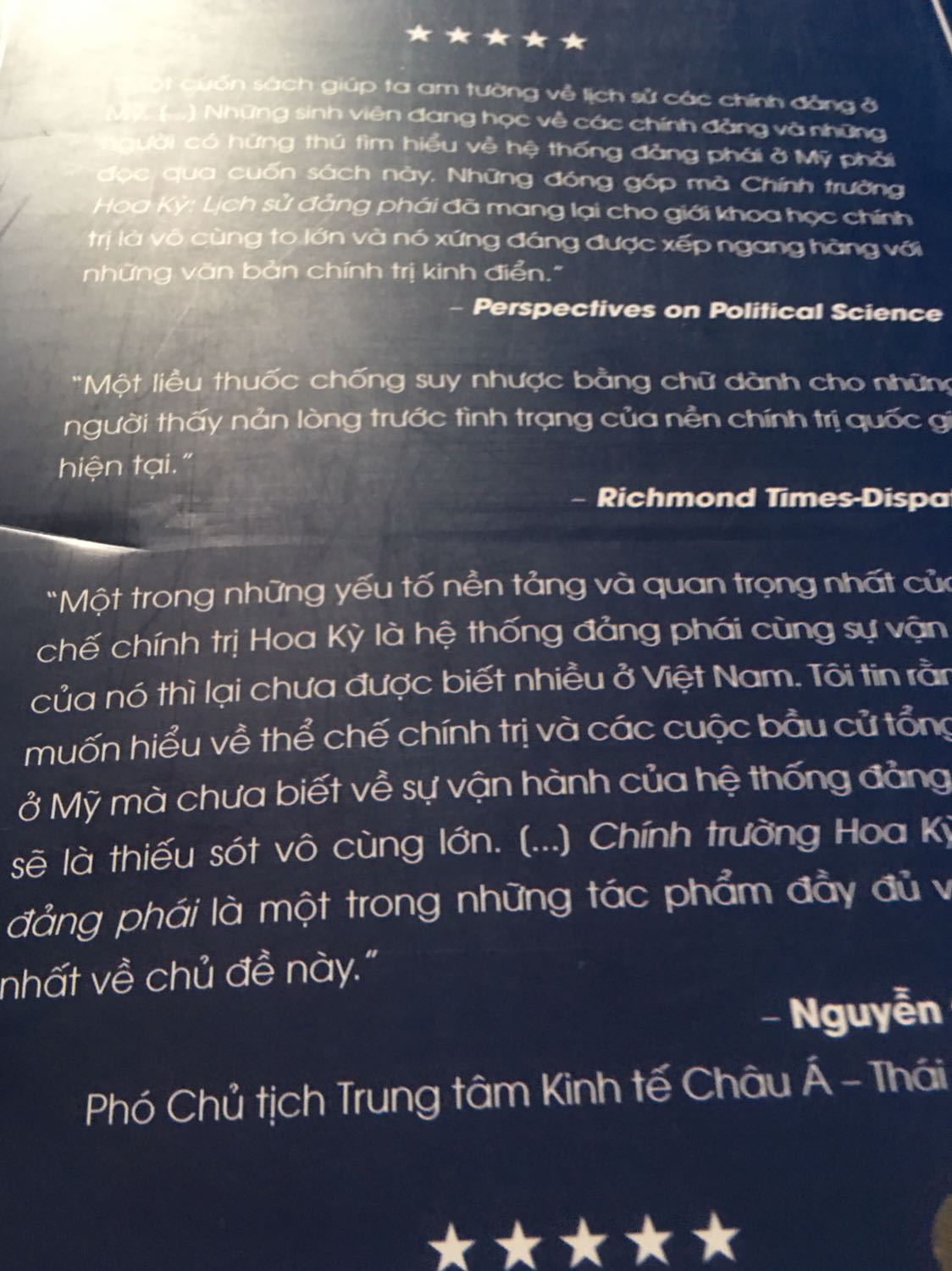 Cuốn sách là một cái nhìn đầy đủ và chi tiết về Hệ thống đảng phái chính trị Hoa Kỳ. Trong nhiều năm qua, hiểu biết chung về nước Mỹ của người Việt Nam đã tăng lên rất nhiều thông qua báo chí, sách vở, qua internet, qua các cuộc trao đổi, du lịch, làm việc. Chúng ta khá hiểu về nền kinh tế và môi trường đầu tư, kinh doanh của Mỹ. Thể chế chính trị và các cuộc bầu cử tổng thống Mỹ dần trở nên quen thuộc sau mỗi bốn năm. Hàng chục cuốn sách được xuất bản ở Việt Nam mỗi năm về chủ đề này cũng giúp cho độc giả nắm rõ những khái niệm cơ bản và các sự kiện, nhân vật nổi bật nhất. Song, một trong những yếu tố nền tảng và quan trọng nhất của thể chế chính trị Hoa Kỳ là hệ thống đảng phái và sự vận hành của nó thì lại chưa được biết nhiều ở Việt Nam. Muốn hiểu về thể chế chính trị và các cuộc bầu cử tổng thống ở Mỹ mà chưa biết về sự vận hành của hệ thống đảng phái thì đó sẽ là thiếu sót vô cùng lớn. Cuốn sách Chính trường Hoa Kỳ: Lịch sử đảng phái của tác giả A. James Reichley, một trong những tác phẩm đầy đủ và chi tiết nhất về chủ đề này. Đây là một công trình khoa học chính trị rất sâu sắc về lịch sử hình thành, phát triển các đảng phái chính trị ở Mỹ, được đúc kết từ kinh nghiệm sau nhiều năm nghiên cứu, giảng dạy của tác giả. Tác giả Reichley đã tổng kết lại hệ thống đảng phái chính trị Hoa Kỳ từ lúc khởi nguồn như một liên minh lỏng lẻo của các câu lạc bộ xã hội đến một hệ thống có cấu trúc và tập trung cao của các bộ máy chính trị tại cộng đồng, thị trấn, thành phố, tiểu bang và liên bang liên kết với nhau. Ông cũng phân tích về những biến động chính trị và sự mưu đồ, kế hoạch và chiến lược xảy ra trên khắp các khu vực và các nhóm cử tri bỏ phiếu khi các đảng hình thành, phát triển và cả suy thoái. Ý nghĩa bìa sách: Con lừa là biểu tượng của đảng Dân chủ, con voi là biểu tượng của đảng Cộng hòa + ĐÁNH GIÁ/NHẬN XÉT CHUYÊN GIA: “Một cuốn sách giúp ta am tường về lịch sử các chính đảng ở Mỹ. [] Những sinh viên đang học về các chính đảng và những người có hứng thú tìm hiểu về hệ thống đảng phái ở Mỹ phải đọc qua cuốn sách này. Những đóng góp mà Chính trường Hoa Kỳ: Lịch sử đảng phái đã mang lại cho giới khoa học chính trị là vô cùng to lớn và nó xứng đáng được xếp ngang hàng với những văn bản chính trị kinh điển.” – Perspectives on Political Science “Một liều thuốc chống suy nhược bằng chữ dành cho những người thấy nản lòng trước tình trạng của nền chính trị quốc gia hiện tại.” – Richmond Times-Dispatch “Chính trường Hoa Kỳ: Lịch sử đảng phái đã xuất sắc đan cài những thắc mắc chính trị mà ta đã tự vấn từ lâu vào truyền thống tự do và cộng hòa, thứ tinh thần hiện diện trên hai chính đảng lớn ở Mỹ.” – Commentary “Chân thành khuyên mọi người nên đọc.” – Library Journal