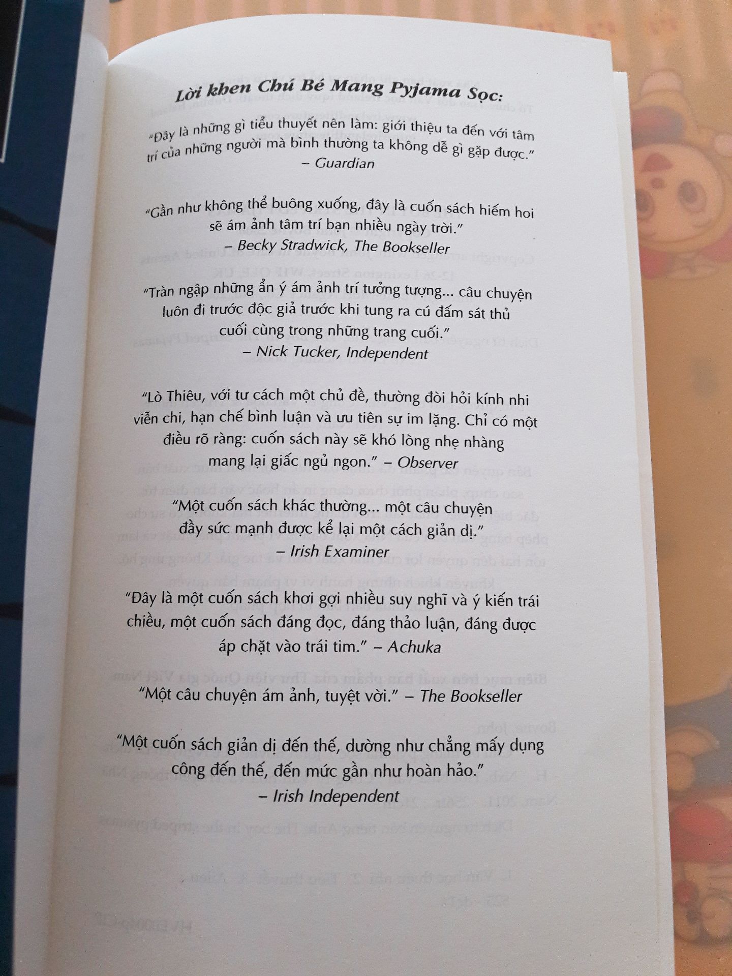 Chú Bé Mang Pyjama Sọc (Tái Bản 2018) Rất khó miêu tả câu chuyện về Chú bé mang pyjama sọc này. Thường thì chúng tôi vẫn tiết lộ vài chi tiết về cuốn sách trên bìa, nhưng trong trường hợp này chúng tôi nghĩ làm như vậy sẽ làm hỏng cảm giác đọc của bạn. Chúng tôi nghĩ điều quan trọng là bạn nên đọc mà không biết trước nó kể về điều gì.Nếu bạn định bắt đầu đọc cuốn sách thật, bạn sẽ cùng được trải qua một hành trình với một cậu bé chín tuổi tên là Bruno (dù đây không hẳn là sách cho trẻ chín tuổi). Và chẳng sớm thì muộn bạn sẽ cùng Bruno đến một hàng rào. Những hàng rào như vậy vẫn tồn tại ở khắp nơi trên thế giới. Chúng tôi hy vọng không ai trong chúng ta phải vượt qua một hàng rào như vậy trong đời.