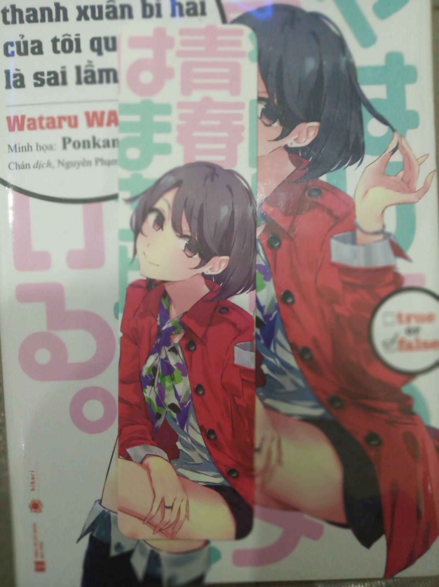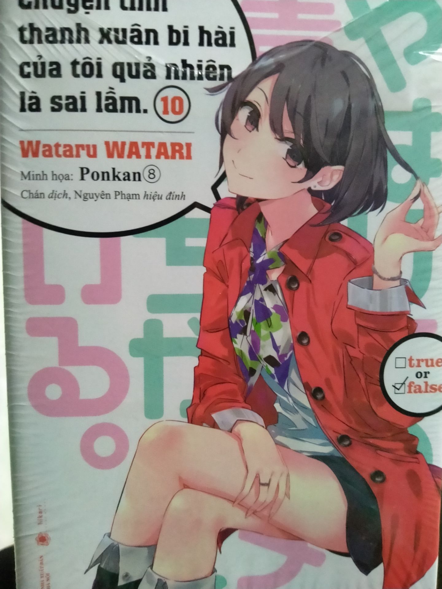 Chuyện tình thanh xuân bi hài của tôi quả nhiên là sai lầm. (tên gốc: Yahari Ore no Seishun Rabukome wa Machigatteiru., gọi tắt là Oregairu), là một trong những series light novel ăn khách nhất trong vòng 20 năm trở lại đây, bộ truyện được viết bởi tác giả trẻ Wataru WATARI, do họa sĩ Ponkan8 vẽ minh họa và được xuất bản bởi NXB nổi tiếng Shogakukan. Chuyện tình thanh xuân bi hài của tôi quả nhiên là sai lầm. đã dành giải light novel hay nhất của bảng xếp hạng uy tín Kono light novel ga sugoi! trong 3 năm liên tiếp là 2014, 2015 và 2016. Bên cạnh đó, nam chính và nữ chính của series này là Hachiman và Yokin oshita cũng đoạt giải nam nữ chính được yêu thích nhất trong các năm đó. Họa sĩ minh họa Ponkan8 với những bức tranh minh họa đẹp và sinh động của mình cũng được bình chọn là họa sĩ minh họa được yêu thích nhất trong năm 2015. Đến thời điểm hiện tại, series đã kết thúc với 14 tập, nhưng số sách bán ra đã vượt mốc 10 triệu bản. Nghỉ đông. Thời điểm những ngày cuối năm thành thơi và tiếp đến sẽ là năm mới. Do phải ra ngoài nhiều hơn tưởng tượng để đi lễ đầu thi đỗ và mua sắm nên ngay đầu năm, Hachiman đã gặp phải Yukinoshita Haruno, Hayama Hayato và… Sau những khoảng thời gian đã trải qua cùng với nhau, có thể thấy rằng mọi người đã biết về nhau chút ít. Thế nhưng hẳn vẫn còn rất nhiều điều mà họ chưa hề biết đến. Cả bây giờ, cả từ giờ về sau cũng vậy. Chỉ còn chút ít thời gian nữa là năm lớp Mười Một sẽ kết thúc. Càng muốn trân trọng quãng thời gian này bao nhiêu, mọi người càng nhút nhát bấy nhiêu. Dù có suy nghĩ đến mức nào cũng không tìm ra được câu trả lời. Dù có chạy lâu cỡ nào cũng không tìm ra được câu trả lời. Dù có chạy lâu cỡ nào cũng không tìm thấy đích. Những mối quan hệ mới, khoảng thời gian mới dành cho những cô cậu này lại bắt đầu. Tập thứ 10 của Chuyện tình thanh xuân bi hài của tôi quả nhiên là sai lầm. Về tác giả: Wataru WATARI Sinh năm 1987. Nhóm máu A, cung Bảo Bình. Thường bị phê phán là dáng vẻ bận bịu và thiếu ngủ của mình khiến cho người khác rất khó chịu nhưng tôi có muốn thế đâu, phần lớn những lúc như vậy chỉ đơn thuần là tín hiệu SOS mà thôi. Tuy tinh thần tôi yếu ớt nhưng thể lực tôi lại mạnh mẽ đến mức thừa thãi Ponkan 8 Đến mùa nằm dưới bàn sưởi ăn kem rồi Bố cục sách: Ghi chép thứ nhất: Có lẽ, đó chẳng phải lời bộc bạch của ai cả. Chương 1: Cuối cùng thì Hikigaya Komachi cũng đi cầu nguyện Chương 2: Như mọi khi, Yukinoshita Haruno lại đến phá bĩnh Chương 3: Chẳng biết từ bao giờ, Isshiki Iroha đã trở thành khách quen Chương 4: Dẫu vậy, Miura Yumiko vẫn muốn được biết Chương 5: Cho tới ngày ấy, Totsuka Saika vẫn sẽ đợi Chương 6: Yukinoshita Haruno lộng lẫy tan biến vào trong bóng tối Ghi chép thứ hai: Hoặc có thể, đó là lời bộc bạch của tất cả mọi người Chương 7: Lúc nào Hayama Hayato cũng đáp ứng kỳ vọng của mọi người Chương 8: Cứ thế, quá khứ và tương lai của mọi người hoà lẫn vào nhau rồi tập kết ở hiện tại Ghi chép thứ ba: Nếu như vậy thì đó là lời bộc bạch của ai đây Chương 9: Nhưng rồi, Yukinoshita Haruno đã nói như thế này Lời bạt Trích dẫn: “Hikigaya, cậ bị thương à?” Yukinoshita nheo mắt lại với vẻ thương tâm khi liếc về phía đôi chân của tôi. “Ờ, một chút thôi.” Tôi không thể nói mình bị vướng chân vào nhau rồi ngã lăn ra được. Nghe tệ lắm. Với lại như thế thì giống hệt như lúc nạn nhân của một vụ bạo hành gia đình đang viện cớ còn gì. Kiểu như “Không phải đâu! Vết thương này là do bị ngã thôi mà!” ấy. Không thể để cậu ta lo lắng thừa thãi rằng tôi đang bị bạo hành gia đình được. “Đáng lẽ cậu phải sơ cứu ở đấy luôn chứ. Chỗ đó cũng có nhân viên y tế mà.” “Lúc tôi đến đích thì không còn ai nữa rồ” Nghe tôi trả lời vậy, Yukinoshita bèn chống tay lên trán và bắt đầu suy nghĩ. “Có vẻ hơi không đúng lúc nhỉ? Hay là tại số cậu đen. Hoặc cũng có thể là do đôi mắt của cậu nữa.” “Ờ thì tôi xấu cả tính cách lẫn tâm hồn đấy. Mà chỗ thuốc sát trùng này có được tự ý sử dụng không nhỉ?” Tôi vừa hỏi, vừa lướt qua mấy kệ thuốc không hề có khoá. Nghe thấy vậy, Yukinoshita thở dài. “Thậm chí đến cách hành xử của cậu cũng xấu nữa.” Yukinoshita đứng dậy, vẫy tay đuổi tôi tránh khỏi kệ thuốc, sau đó lấy thuốc sát trùng và băng ra rồi chỉ vào chiếc ghế trước mặt. “Ngồi xuống chỗ kia đi.” “Thôi không cần đâu, chừng này tôi cũng tự làm được.” “Cứ để đấy.” Tuy không can tâm cho lắm nhưng tôi cũng ngồi xuống đúng như những gì được bảo. Sau đó, Yukinoshita cũng di chuyển tới trước mặt chiếc ghế mà tôi vừa ngồi xuống. Cậu ta đưa tay lại gần chân tôi và bắt đầu sát trùng vết thương. Mùi thuốc sát trùng xộc vào mũi tôi. Lúc Yukinoshita cúi xuống, tôi ngửi thấy được mùi dầu gộ