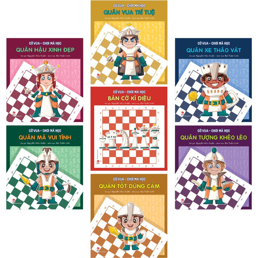 Combo bộ sách CỜ VUA, CHƠI MÀ HỌC (trọn bộ 7 cuốn) (A) THÔNG TIN CHUNG VỀ BỘ SÁCH – Tác giả: Nguyễn Hữu Huấn – Bùi Tuấn Linh – Năm xuất bản: 2019 – Số trang: 20 trang / mỗi cuốn. – Bộ sách dành cho các bé từ 3 tuổi trở lên, giúp các bé vừa chơi vừa học. Bộ sách gồm 7 cuốn sách: 1) Cờ vua – Chơi mà học: Bàn cờ kì diệu 2) Cờ vua – Chơi mà học: Quân Vua trí tuệ 3) Cờ vua – Chơi mà học: Quân Hậu xinh đẹp 4) Cờ vua – Chơi mà học: Quân Xe tháo vát 5) Cờ vua – Chơi mà học: Quân Mã vui tính 6) Cờ vua – Chơi mà học: Quân Tượng khéo léo 7) Cờ vua – Chơi mà học: Quân Tốt dũng cảm (B) THÔNG TIN CHI TIẾT CUỐN SÁCH: Bộ sách 7 cuốn có những nội dung như sau: Cuốn sách đầu tiên kể về Bàn cờ. Các cuốn tiếp theo, mỗi cuốn viết về một quân cờ, được sắp xếp theo thứ tự chiều cao tăng dần của các quân cờ vua: Tốt – Xe – Mã – Tượng – Hậu – Vua. Những điều thú vị về các quân cờ – từ kích thước, tên gọi, đến cách đi, nước đánh – được tác giả giới thiệu dí dỏm qua mục “Bé có biết?”. Bé có biết Bàn Cờ được phát minh từ bao giờ? Tên tiếng Anh của quân Tốt? Quân Xe có hình dáng giống gì nào? Nước đi đặc trưng của quân Vua? Cờ Vua – Chơi Mà Học đưa ra những kiến thức cơ bản nhất về cờ vua, hướng dẫn cho bé tập làm quen với cờ vua. Đây có thể coi là “giáo trình” cờ vua dành cho lứa tuổi mầm non mà các thầy cô giáo, các huấn luyện viên và phụ huynh có thể sử dụng để hướng dẫn bé. Ngoài kiến thức, cuốn sách còn lồng ghép các trò chơi quen thuộc với bé để các bé có thể thực hành, như: nối các điểm để vẽ quân cờ, tô màu cho quân cờ, mê cung tìm đường đi để hiểu cách di chuyển của quân cờ trên bàn cờ, giải đố vui để làm quen cách tính điểm, cắt dán theo hình vẽ… Thông qua câu chuyện về mỗi quân cờ, tương tác trực tiếp trên từng trang sách, điều bé nhận được quan trọng hơn hết đó là sự hứng thú với bộ môn thể thao trí tuệ này. Bé tập di chuyển các quân cờ; tư duy tìm đường đi; làm quen với tiếng Anh cờ vua; từng bước thực hành việc tính toán đường đi nước bước, biểu lộ cảm xúc với từng quân cờ vua… ĐẶC BIỆT: Khi mua sách, bạn sẽ được tặng thêm bookmark cờ vua. Bên cạnh đó, Quý khách được tư vấn trước, trong và sau khi mua hàng bởi các chuyên gia cờ vua của Shop! Hiệu sách có phương châm sử dụng cờ vua như một phương tiện giáo dục trẻ em, đưa giá trị sách đến cộng đồng. Quý khách có thể tham khảo thông tin của Shop trên mạng ở các kênh thông dụng. Trân trọng giới thiệu cuốn sách tới quý khách. Mời bạn đón đọc! #treem #chobe #covua #daycon #mamnon #Sachcovua #tuduy #trithongminh #tritue #covuaduongsinh #duongsinhbook #NguyenHuuHuan #BuiTuanLinh #KimDong