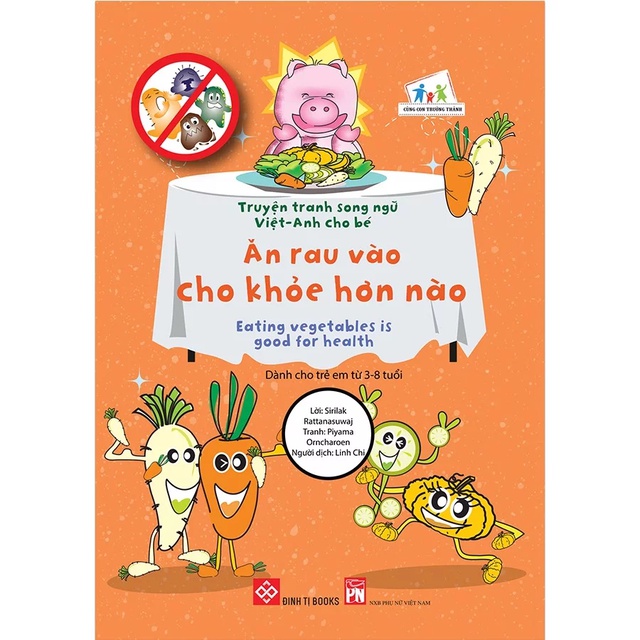 Công ty phát hành: Đinh Tị Tác giả: Nhiều tác giả Nhà xuất bản: NXB Phụ Nữ Năm xuất bản: 2020 Số trang: 192 Giới thiệu sách: Theo đa số các nghiên cứu khoa học, dạy ngoại ngữ cho trẻ em từ khi còn nhỏ tuổi mang đến rất nhiều lợi ích: 1. Tư duy phóng khoáng và sẵn sàng tiếp thu điều mới mẻ 2. Cơ hội nghề nghiệp tốt hơn trong tương lai 3. Dễ dàng hơn khi học những ngôn ngữ khác trong giai đoạn sau này của cuộc đời 4. Được hưởng sự giáo dục văn hóa đa dạng hơn (với văn học, phim ảnh, âm nhạc…) 5. Khả năng tập trung cao hơn 6. Khả biến thần kinh (giúp thông minh hơn) 7. Làm chậm lại sự khởi phát bệnh Alzheimer so với những người chỉ dùng một ngôn ngữ… Bộ Truyện tranh song ngữ Việt-Anh cho bé gồm 12 tập là 12 câu chuyện được kể bằng tiếng Việt và tiếng Anh. Mỗi câu chuyện không chỉ mang đến những giờ phút giải trí vui vẻ, mà còn chứa đựng bài học bổ ích, khuyến khích các bé phát triển lối sống lành mạnh, có trách nhiệm, và giúp cải thiện vốn từ vựng tiếng Anh. Đây chắc chắn sẽ là món quà tuyệt vời để các bậc cha mẹ dành tặng cho những “nhà ngôn ngữ học bé nhỏ” của mình. Bộ sách gồm 12 tập: – For washing hair without tears – Để gội đầu mà không cay mắt – Smart babies can get dressed themselves – Bé thông minh, bé tự mặc áo quần – Drawing in the right places, coloring in the right spaces – Vẽ đúng nơi, tô đúng chỗ – School is fun! – Ở trường thật là vui! – Let’s go to bed early! – Hãy đi ngủ sớm! – Sing, sing, sweet Parrot! – Hát lên nào bé Vẹt ngọt ngào! – To become tall – Để trở nên cao lớn – A clean and tidy Kangaroo – Bạn Kangaroo sạch sẽ, gọn gàng – Exercise is important – Tập thể dục quan trọng lắm nhé – Bunny loves candies – Thỏ con thích ăn kẹo ngọt – Eating vegetables is good for health – Ăn rau vào cho khỏe hơn nào – Keeping your body clean and friends are always near you – Tắm sạch tắm thơm, bạn thương bạn mến