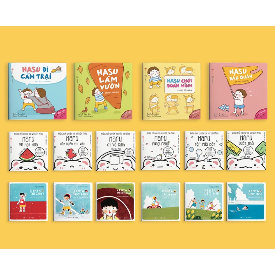 Công ty phát hành: Wabooks Nhà xuất bản: NXB Lao động – Xã hội Tác giả: Suzuki Mio, Fuku Mitsu Loại bìa: Bìa mềm Số trang: 24 trang Mực in màu chiết xuất dầu đậu nành nhập khẩu Nhật Bản an toàn cho bé Giấy C150 dày khó nhàu rách Năm xuất bản: 2019 Hướng dẫn bố mẹ phương pháp đọc Ehon được in ở đầu mỗi cuốn sách. Nếu cha mẹ đang tìm kiếm những đầu sách giúp con mình từng bước khám phá thế giới xung quanh và tìm hiểu chính bản thân mình, thì Combo 12 cuốn sách Ehon này là sự lựa chọn hoàn hảo. Ehon là một loại sách kết hợp các yếu tố màu sắc, tranh vẽ và câu từ đơn giản với những nội dung hoặc đề tài hết sức gần gũi, dành cho các bé từ 0 đến 10 tuổi, giúp bé có thể nhận biết và học hỏi nhiều điều từ thế giới xung quanh.Dạy con bằng sách Ehon là phương pháp giáo dục sớm đến từ Nhật Bản, đã được áp dụng hàng trăm năm nay tại đất nước này để nuôi dưỡng một thế hệ người Nhật nghiêm túc, kỷ luật hàng đầu thế giới. Đôi nét về các bộ sách: Bộ sách Chơi thể thao cùng Kenta Bộ sách Ehon “Kenta chơi thể thao” của Wabooks gồm 6 cuốn với 6 môn thể thao hữu ích: “Kenta leo núi”, ” Kenta thi chạy”, “Kenta học bơi”, “Kenta tập xe đạp”, “Kenta tập bóng chày”, “Kenta trượt băng”. Xuyên suốt series “Kenta chơi thể thao” là hành trình trải nghiệm quý giá của cậu bạn Kenta với những trò chơi mới và những kiến thức siêu siêu thú vị. Những câu chuyện vụn vặt của Maru Bộ ehon Maru phù hợp cho trẻ từ 24 tháng tuổi trở lên, gồm có 6 cuốn, chia thành 2 bộ nhỏ hơn là Maru Lớn Rồi (gồm “Maru rụng răng”, “Maru một ngày xui xẻo”, “Maru và hạt dưa”) và Maru Giúp Mẹ (gồm ” Maru đi vệ sinh”, “Maru quét nhà”, “Maru tập rửa bát”), chú trọng về việc dạy trẻ các kỹ năng tư duy khi quan sát những sự việc xảy ra xung quanh hằng ngày. Những câu chuyện kỳ lạ của Hasu Hasu là cậu bé mang đầy đủ những tính cách tinh nghịch, tò mò của các bé trong độ tuổi 3-6. Bộ sách với 4 cuốn ” Hasu làm vườn”, “Hasu đầu đội quần”, “Hasu đi căm trại”, ” Hasu chơi đoán hình” ngộ nghĩnh, đáng yêu sẽ kích thích trí tưởng tượng và sáng tạo thùy trán của trẻ.
