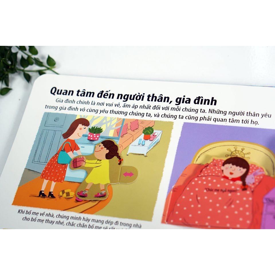 Set sách gồm 2 tập: Bách khoa kỹ năng sống đa tương tác – 60 kỹ năng ứng xử giúp con văn minh, lịch sự là cuốn sách LẬT MỞ – CHUYỂN ĐỘNG đề cập đến các nội dung vô cùng bổ ích: – Dạy bé cách cư xử lễ phép, lịch sự trong cuộc sống hàng ngyaf. – Văn minh, lịch sự khi ăn uống, đi đứng, giữ gìn vệ sinh sạch sẽ. – Nói lời văn minh, lễ phép ở nơi công cộng. – Nhiệt tình, vui vẻ đón tiếp khách đến chơi nhà. – Quan tâm, giúp đỡ, yêu thưng người thân trong gia đình và mọi người xung quanh. Cuốn sách gồm nhiều hình minh họa ngộ nghĩnh, thiết thực, được thiết kế đầy tinh tế, tỉ mỉ bằng các miếng LẬT – MỞ – KÉO – ĐẨY, giúp các bé vừa chơi vừa học kiến thức. Tác giả: Lời: Dương Kim Tú Tranh: Hương Tiêu Hầu Dịch giả: Thu Ngân NXB Hà Nội Độ tuổi: 0-6 tuổi Kích thước: 26.5x23cm Năm xuất bản: 2019 Công ty phát hành: Đinh Tị
