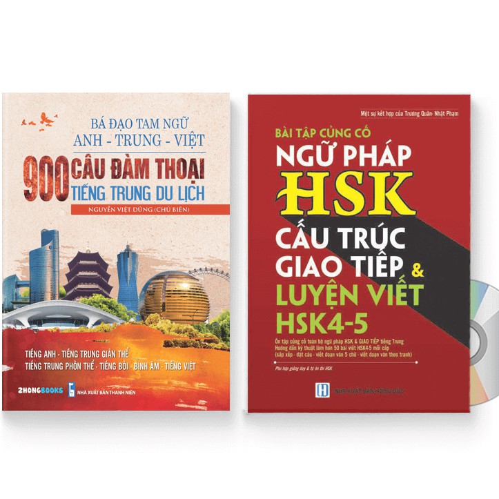 Sách – Combo: 900 Câu đàm thoại tiếng Trung du lịch + Bài Tập Củng Cố Ngữ Pháp HSK + DVD quà tặng Bá đạo tam ngữ Trung-Anh-Việt: 900 Câu đàm thoại tiếng Trung du lịch (Tiếng Anh – Tiếng Trung phồn thể – Tiếng Trung giản thể – Tiếng bồi – Bính âm – Tiếng Việt) Tác giả: L-Team Số trang: 199 Năm xuất bản: 2020 Nhà Xuất Bản: Thanh Niên Nội dung sách: Du lịch là khoảng thời gian giúp mỗi người cân bằng cuộc sống, khám phá thêm nhiều quốc gia, nhiều miền đất mới. Trước khi khởi hành sang các quốc gia sử dụng tiếng Trung Quốc, đừng quên ghi nhớ trọn bộ cẩm nang tiếng Trung du lịch gồm 900 câu thoại cùng hàng trăm từ vựng bổ sung cho các chủ đề được biên tập bằng cả tiếng Trung giản thể, tiếng Trung phồn thể, tiếng bồi, bính âm (pinyin), tiếng Anh cùng tiếng Việt trong quyển sách này nhé !!! Bạn đã tích góp bấy lâu cho một chuyến du lịch, bạn đã lên kế hoạch thật kĩ càng nhưng kì nghỉ trong mơ lại trở thành ác mộng khi gặp phải những tình huống trớ trêu nơi xứ người. Bạn có thể bị lạc đường, chẳng may bị xây xát, thất lạc hành lý… tệ hơn nữa là bạn chẳng thể giao tiếp và giải quyết những tình huống này bởi vốn tiếng Anh hay tiếng Trung lẹt đẹt. Nếu viễn cảnh trên có thể là tương lại của bạn trong chuyến du lịch sắp tới thì bạn nhất định phải học các tình huống thoại và series từ vựng trong quyển sách này. Cẩm nang tam ngữ sẽ gửi tới bạn những cấu trúc câu, mẫu hội thoại tiếng Anh, tiếng Trung, tiếng bồi, tiếng Việt trong một số tình huống phổ biến khi đi du lịch. Cấu trúc sách bao gồm 36 chương với mỗi chương là một chủ đề bao gồm 2 phần: – Phần 1: Mẫu câu giao tiếp cơ bản, thông dụng thường gặp nhất – Phần 2: Các từ vựng liên quan đến chủ đề Bài Tập Củng Cố Ngữ Pháp HSK – Cấu Trúc Giao Tiếp & Luyện Viết HSK 4-5 kèm đáp án + DVD Tác giả: Nhật Phạm Số trang: 490 Ngày xuất bản: 01/11/2017 Nhà Xuất Bản: Dân Trí Giá bìa: 300,000 VNĐ Nội dung sách: Bài tập ngữ pháp HSK1-6 ( Full ngữ pháp tiếng Trung) Luyện viết HSK4-5 với các đề thật HSK, sách có đáp án chi tiết, hướng dẫn làm bài! Hy vọng những kiến thức trong cuốn sách này sẽ giúp ích cho các bạn đọc ở một thời điểm nào đó trong cuộc sống, dù chỉ là một phần bé nhỏ! DVD đi kèm và link Online backup chứa 30Gb dữ liệu quà tặng, Chi tiết: ♦ 200 bộ đề thi có đầy đủ audio nghe và đáp án từ HSK1 đến HSK6 ♦ Tổng hợp tài liệu dành cho người mới bắt đầu học tiếng Trung ♦ Từ điển thành ngữ tiếng Trung ♦ Từ vựng tiếng Trung theo chủ đề ♦ Giáo trình luyện thi HSK từ sơ cấp đến cao cấp ♦ Giáo trình ngữ pháp tiếng Trung ♦ Bộ giáo trình Hán ngữ 6 quyển (kèm file nghe) ♦ Bộ giáo trình Boya 9 quyển (kèm file nghe) ♦ Tài liệu học giao tiếp tiếng Trung theo tình huống ♦ Giáo trình 301 câu đàm thoại tiếng Trung ♦ 3000 câu giao tiếp thông dụng trong tiếng Trung ♦ 1000 câu giao tiếp cơ bản trong tiếng Trung ♦ 5000 Từ vựng HSK 1-6 Anh, Trung (có cả Giản + Phồn), Việt, bồi; có hướng dẫn viết từng nét cho từng chữ; có Audio nghe ♦ 10,000 ví dụ HSK1 – HSK5 có tiếng Anh, tiếng Trung giản, phồn, bồi, tiếng Việt, và Audio ♦ Giáo trình dạy tiếng Việt cho người Trung Quốc ♦ Kho sách về du lịch Trung Quốc ♦ Audio Nghe 1001 Bức Thư Viết Cho Tương Lai ♦ Audio Nghe 999 Bức Thư Viết Cho Bản Thân ♦ Audio Nghe Phát triển từ vựng tiếng Trung Ứng dụng ♦ Audio Nghe Sách Du Lịch Việt Nam – Ẩm Thực và Cảnh Điểm ♦ Audio Nghe sách Trung Quốc 247: Góc nhìn bỡ ngỡ ♦ Audio Nghe sách Trung Quốc 247: Mái nhà thân thuộc ♦ Audio nghe sách Cuộc đời phụ nữ: Muôn vàn lý do hạnh phúc ♦ Audio nghe sách 123 Thông điệp thay đổi tuổi trẻ ♦ Audio nghe bộ sách từ điển HSK hiệ đại tập 1-2-3 ♦ Audio nghe sách Tứ Hải Giai Huynh Đệ: Tôi là Ai? Tôi đang ở Đâu? ♦ Audio nghe sách Tứ Hải Giai Huynh Đệ: Bạn là Ai? Bạn từ đâu Đến? ♦ … và còn rất nhiều quà tặng nữa, bạn hãy khám phá trong DVD và link quà tặng nhé!