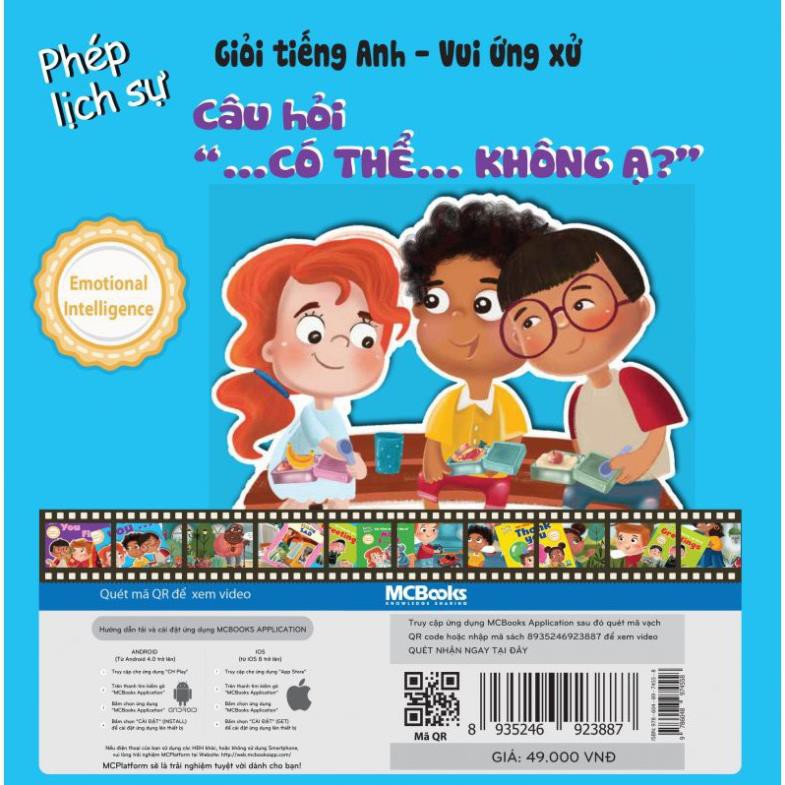 Combo trọn bộ sách Being Polite (Giỏi tiếng Anh – Vui ứng xử) Bộ sách gồm 8 cuốn sách với 8 phép lịch sự cơ bản: Being polite: You first: Mời bạn trước Being polite: Greetings: Chào hỏi Being polite: Please: Câu nói “Xin…ạ” Being polite: Sorry: Lời xin lỗi Being polite: Thank you: Lời cản ơn Being polite: Excuse me: Xin nhờ Being polite: Would you: Câu nói “… có thể… không ạ?” Being polite: May I: Câu nói “… được không ạ” – Bộ sách với phiên bản song ngữ giúp bé học tiếng Anh qua những mẫu câu phép lịch sự cơ bản trong tiếng Việt và trong tiếng Anh. – Các tình huống minh họa bằng tranh vẽ màu sắc, gợi sự hứng thú khi bé có thể vừa học vừa thư giãn hiệu quả. – Sách có ứng dụng MCPlatform để giúp bé học một cách chân thực hơn Cha mẹ hoàn toàn có thể giúp con có những trải nghiệm học thực tế hơn qua các video bằng cách tải ứng dụng MCBooks Application và quét mã QR code trên cuốn sách. Với những ứng dụng mang tính giáo dục và thực tế cao, hy vọng bộ sách không chỉ là là tài liệu giáo dục thật tốt giúp trẻ nhận thức được sự quan trọng của phép lịch sự mà còn là nền tảng giúp bé vận dụng tiếng Anh vào những tình huống hàng ngày. Công ty phát hành MCBOOKS Nhà xuất bản Hồng Đức Kích thước 20,5 x 20,5 cm Loại bìa Bìa mềm Số trang 24/ cuốn #tienganh #chobe #chotre #being #polite #vuiungxu #combo