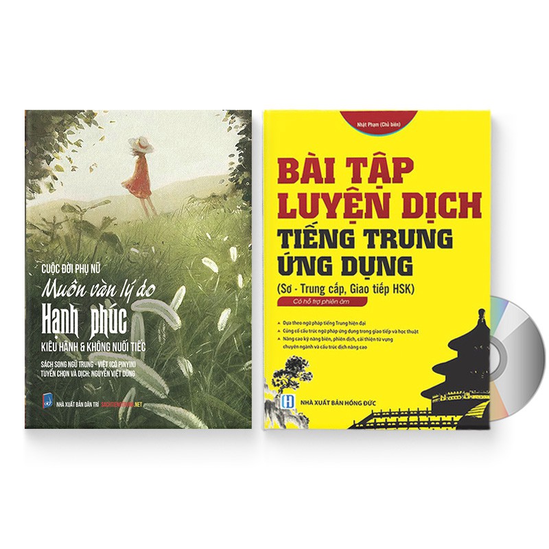 Sách – Combo: Cuộc đời phụ nữ: Muôn vàn lý do hạnh phúc + Bài tập luyện dịch tiếng Trung Ứng Dụng + DVD nghe sách Cuộc đời phụ nữ: Muôn vàn lý do hạnh phúc Nội dung sách: Những bài viết về văn hóa và con người Trung Hoa Chủ biên: Nguyễn Việt Dũng Xuất bản: 2018 Nhà xuất bản: Dân Trí Số trang: 510 Giá bìa: 350,000 VNĐ Bài tập luyện dịch tiếng Trung Ứng Dụng (Sơ – Trung cấp, giao tiếp HSK) (Trung – Pinyin – Việt, có đáp án) Nội dung sách: Những bài viết hay giúp học tiếng Trung hay Tác giả: Nhật Phạm Số trang: 350 Ngày xuất bản: 01/11/2017 Nhà Xuất Bản: Hồng Đức
