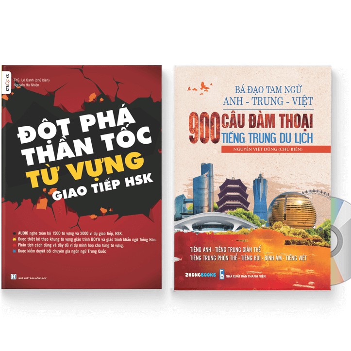 Sách – Combo: Đột Phá Thần Tốc Từ Vựng Giao Tiếp HSK + 900 Câu đàm thoại tiếng Trung du lịch + DVD quà tặng Đột Phá Thần Tốc Từ Vựng Giao Tiếp HSK Tác giả: Lê Oanh – Nguyễn Hà Nhiên Số trang: 283 Năm xuất bản: 2020 Nhà Xuất Bản: Hồng Đức Nội dung sách: Là cuốn sách giao tiếp đầu tiên bạn cần có khi bắt đầu học tiếng Trung từ con số 0. Sách dành cho người mới bắt đầu, người học giao tiếp, ôn luyện thi HSK sơ, trung cấp với hơn 1500 từ vựng gốc và từ vựng mở rộng, 3000 ví dụ giao tiếp đời sống cũng như hàn lâm học thuật để phục vụ thi HSK, thi đại học, giao tiếp trong đời sống, công việc,… Cuốn sách được chia theo 30 chủ điểm của chương trình hán ngữ BOYA của Đại học ngôn ngữ Bắc Kinh bao gồm: Chào hỏi, cách nói giờ, thời tiết, gia đình, mua bán, hỏi đường, đi bệnh viện,… Sách đảm bảo tuyệt đối về tính chính xác của ngôn ngữ Việt – Trung, toàn bộ ví dụ và cách sử dụng được kiểm duyệt kĩ càng, 100% sử dụng trong đời sống hằng ngày và sát với kiến thức HSK, đảm bảo bạn giành được điểm HSK cực kì cao và giao tiếp thành thạo sau 3 tháng ôn luyện. 900 Câu đàm thoại tiếng Trung du lịch (Tiếng Anh – Tiếng Trung phồn thể – Tiếng Trung giản thể – Tiếng bồi – Bính âm – Tiếng Việt) Tác giả: L-Team Số trang: 199 Năm xuất bản: 2020 Nhà Xuất Bản: Thanh Niên Nội dung sách: Du lịch là khoảng thời gian giúp mỗi người cân bằng cuộc sống, khám phá thêm nhiều quốc gia, nhiều miền đất mới. Trước khi khởi hành sang các quốc gia sử dụng tiếng Trung Quốc, đừng quên ghi nhớ trọn bộ cẩm nang tiếng Trung du lịch gồm 900 câu thoại cùng hàng trăm từ vựng bổ sung cho các chủ đề được biên tập bằng cả tiếng Trung giản thể, tiếng Trung phồn thể, tiếng bồi, bính âm (pinyin), tiếng Anh cùng tiếng Việt trong quyển sách này nhé! Bạn đã tích góp bấy lâu cho một chuyến du lịch, bạn đã lên kế hoạch thật kĩ càng nhưng kì nghỉ trong mơ lại trở thành ác mộng khi gặp phải những tình huống trớ trêu nơi xứ người. Bạn có thể bị lạc đường, chẳng may bị xây xát, thất lạc hành lý… tệ hơn nữa là bạn chẳng thể giao tiếp và giải quyết những tình huống này bởi vốn tiếng Anh hay tiếng Trung lẹt đẹt. Nếu viễn cảnh trên có thể là tương lại của bạn trong chuyến du lịch sắp tới thì bạn nhất định phải học các tình huống thoại và series từ vựng trong quyển sách này. Cẩm nang tam ngữ sẽ gửi tới bạn những cấu trúc câu, mẫu hội thoại tiếng Anh, tiếng Trung, tiếng bồi, tiếng Việt trong một số tình huống phổ biến khi đi du lịch. Cấu trúc sách bao gồm 36 chương với mỗi chương là một chủ đề bao gồm 2 phần: – Phần 1: Mẫu câu giao tiếp cơ bản, thông dụng thường gặp nhất – Phần 2: Các từ vựng liên quan đến chủ đề DVD đi kèm và link Online backup chứa 30Gb dữ liệu quà tặng, Chi tiết: ♦ 200 bộ đề thi có đầy đủ audio nghe và đáp án từ HSK1 đến HSK6 ♦ Tổng hợp tài liệu dành cho người mới bắt đầu học tiếng Trung ♦ Từ điển thành ngữ tiếng Trung ♦ Từ vựng tiếng Trung theo chủ đề ♦ Giáo trình luyện thi HSK từ sơ cấp đến cao cấp ♦ Giáo trình ngữ pháp tiếng Trung ♦ Bộ giáo trình Hán ngữ 6 quyển (kèm file nghe) ♦ Bộ giáo trình Boya 9 quyển (kèm file nghe) ♦ Tài liệu học giao tiếp tiếng Trung theo tình huống ♦ Giáo trình 301 câu đàm thoại tiếng Trung ♦ 3000 câu giao tiếp thông dụng trong tiếng Trung ♦ 1000 câu giao tiếp cơ bản trong tiếng Trung ♦ 5000 Từ vựng HSK 1-6 Anh, Trung (có cả Giản + Phồn), Việt, bồi; có hướng dẫn viết từng nét cho từng chữ; có Audio nghe ♦ 10,000 ví dụ HSK1 – HSK5 có tiếng Anh, tiếng Trung giản, phồn, bồi, tiếng Việt, và Audio ♦ Giáo trình dạy tiếng Việt cho người Trung Quốc ♦ Kho sách về du lịch Trung Quốc ♦ Audio Nghe 1001 Bức Thư Viết Cho Tương Lai ♦ Audio Nghe 999 Bức Thư Viết Cho Bản Thân ♦ Audio Nghe Phát triển từ vựng tiếng Trung Ứng dụng ♦ Audio Nghe Sách Du Lịch Việt Nam – Ẩm Thực và Cảnh Điểm ♦ Audio Nghe sách Trung Quốc 247: Góc nhìn bỡ ngỡ ♦ Audio Nghe sách Trung Quốc 247: Mái nhà thân thuộc ♦ Audio nghe sách Cuộc đời phụ nữ: Muôn vàn lý do hạnh phúc ♦ Audio nghe sách 123 Thông điệp thay đổi tuổi trẻ ♦ Audio nghe bộ sách từ điển HSK hiệ đại tập 1-2-3 ♦ Audio nghe sách Tứ Hải Giai Huynh Đệ: Tôi là Ai? Tôi đang ở Đâu? ♦ Audio nghe sách Tứ Hải Giai Huynh Đệ: Bạn là Ai? Bạn từ đâu Đến? ♦ … và còn rất nhiều quà tặng nữa, bạn hãy khám phá trong DVD và link quà tặng nhé!