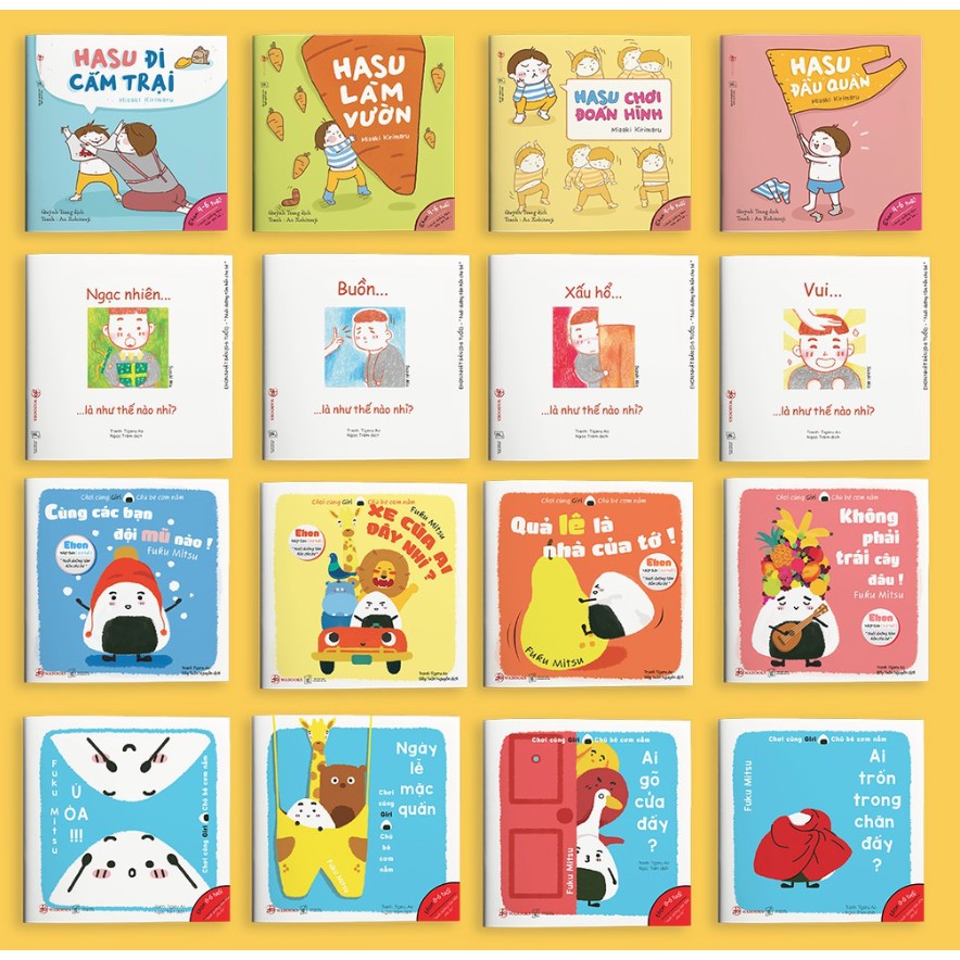 Công ty phát hành: Wabooks Nhà xuất bản: NXB Lao động – Xã hội Tác giả: Suzuki Mio, Misaki Kirimaru Loại bìa: Bìa mềm Số trang: 24 trang Mực in màu chiết xuất dầu đậu nành nhập khẩu Nhật Bản an toàn cho bé Giấy C150 dày khó nhàu rách Năm xuất bản: 2019 Hướng dẫn bố mẹ phương pháp đọc Ehon được in ở đầu mỗi cuốn sách. Nếu cha mẹ đang tìm kiếm những đầu sách giúp con mình từng bước khám phá thế giới xung quanh và tìm hiểu chính bản thân mình, thì Combo 16 cuốn sách Ehon này là sự lựa chọn hoàn hảo. Ehon là một loại sách kết hợp các yếu tố màu sắc, tranh vẽ và câu từ đơn giản với những nội dung hoặc đề tài hết sức gần gũi, dành cho các bé từ 0 đến 10 tuổi, giúp bé có thể nhận biết và học hỏi nhiều điều từ thế giới xung quanh.Dạy con bằng sách Ehon là phương pháp giáo dục sớm đến từ Nhật Bản, đã được áp dụng hàng trăm năm nay tại đất nước này để nuôi dưỡng một thế hệ người Nhật nghiêm túc, kỷ luật hàng đầu thế giới. Đôi nét về các bộ sách Bộ Ehon Cảm xúc: Bộ sách ehon “Điều kỳ diệu của cảm xúc” phù hợp cho trẻ từ 0 – 6 tuổi, gồm 4 cuốn “Vui là như thế nào nhỉ?”, “Buồn là như thế nào nhỉ?”, “Ngạc nhiên là như thế nào nhỉ?” và “Xấu hổ là như thế nào nhỉ?” kể cho bé nghe những bí mật của cảm xúc thường ngày mà các con vẫn thường trải qua, từ đó cho con biết được những cảm xúc này phụ thuộc rất nhiều vào việc con đón nhận nó thế nào, đồng thời cho con niềm tin về quan điểm sống tích cực, vui vẻ, giúp con tận hưởng tất cả các cảm xúc một cách trọn vẹn nhất. Giri chú bé cơm nắm “Bộ sách “Chơi cùng Giri – chú bé cơm nắm” là tập series các mẩu chuyện xoay quanh chú bé cơm nắm Giri, gồm 2 phần đã được xuất bản. Phần một gồm 4 cuốn: “Xe của ai đây nhỉ?”, “Quả Lê là nhà của tớ”, “Cùng đội mũ lên nào”, “Không phải trái cây đâu”. Mới đây, bộ sách Giri 2 cũng đã ra mắt bố mẹ và các bé với 4 cuốn mang tên: “Ú òa”, “Ngày lễ mặc quần”, “Ai gõ cửa đấy”, “”Ai trốn trong chăn đấy?”” đem đến thêm cho các bé nhiều “đất” để thể hiện tiềm năng sáng tạo vô biên hơn.” Những câu chuyện kỳ lạ của Hasu Hasu là cậu bé mang đầy đủ những tính cách tinh nghịch, tò mò của các bé trong độ tuổi 3-6. Bộ sách với 4 cuốn ” Hasu làm vườn”, “Hasu đầu đội quần”, “Hasu đi căm trại”, ” Hasu chơi đoán hình” ngộ nghĩnh, đáng yêu sẽ kích thích trí tưởng tượng và sáng tạo thùy trán của trẻ.