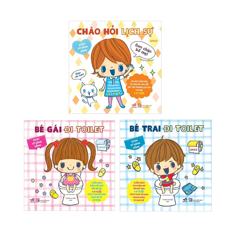Công ty phát hành: Nhã Nam Tác giả: Jinco Nhà xuất bản: NXB Lao Động Năm xuất bản: 2017 Số trang: 60 Giới thiệu sách: Combo Ehon Kỹ Năng Sống (Bộ 3 Cuốn) 1. Ehon Kỹ Năng Sống – Chào Hỏi Lịch Sự 25 câu chào hỏi và cảm ơn, xin lỗi dạy tác phong lịch sự cho bé 2-5 tuổi Mỗi sáng thức dậy, bé nói gì? Bé đáp lời người lớn ra sao? Bé nói với bạn bè thế nào? Nở nụ cười rạng rỡ khi cất lời chào hỏi, rồi biết nói cảm ơn và xin lỗi, bé sẽ truyền cảm xúc hân hoan cho người nghe. Cùng học cách cư xử lịch thiệp nhé! 2. Ehon Kỹ Năng Sống – Bé Trai Đi Toilet Cuốn sách vui nhộn này rèn bé trai 1-5 tuổi cách tự đi vệ sinh nhanh nhẹn và sạch sẽ Tè đứng hay tè ngồi? Có lau hay không nhỉ? Phân thế nào là tốt? Bệ xí xổm thì ngồi ra sao? Cuốn sách có đầy đủ các tình huống, dạy bé trai xử trí trong toilet. Bố mẹ hãy kiên trì dạy con từng bước tự đi vệ sinh, với “giáo trình” thú vị giúp bé học rất nhanh và rất vui nhé. 3. Ehon Kỹ Năng Sống – Bé Gái Đi Toilet Cuốn sách đáng yêu này rèn bé gái 1-5 tuổi cách tự đi vệ sinh sạch sẽ và an toàn Lau từ trước ra sau hay ngược lại? Mặc váy dài thì phải làm sao? Bệ xí xổm thì ngồi thế nào? Sách có đầy đủ các tình huống dạy bé gái xử trí trong toilet. Bố mẹ hãy kiên trì dạy con từng bước tự đi vệ sinh, với “giáo trình” thú vị giúp bé học rất nhanh và rất vui nhé.