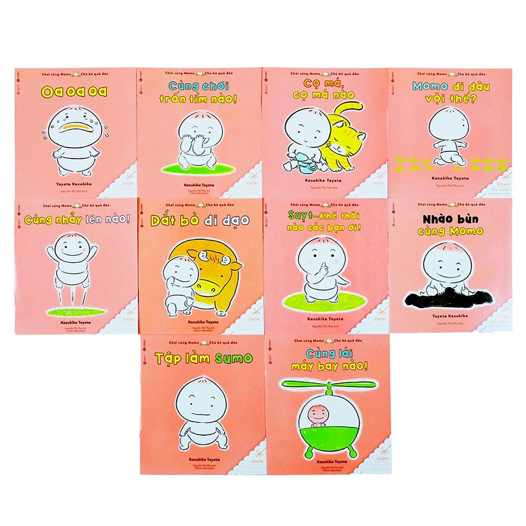 Combo Momo – Chú Bé Quả Đào (Bộ 10 Quyển) Ehon là dạng sách tranh dành cho lứa tuổi từ 0 – 10. Ehon được ví như thực phẩm của tâm hồn, thói quen đọc ehon cho con nghe được ví như bữa ăn hàng ngày cha mẹ Nhật nuôi dưỡng tâm hồn và trí tuệ cho con. Đọc ehon chính là cách cha mẹ Nhật thể hiện tình yêu thương, giúp con phát triển ngôn ngữ, trí tưởng tượng và nuôi dưỡng tâm hồn phong phú. Ehon có mặt trong tủ sách của mọi gia đình và ở thư viện trên khắp nước Nhật, là người bạn đồng hành với trẻ trong suốt những năm tháng ấu thơ. Chơi cùng Momo – Chú bé quả đào, bộ Ehon gồm 9 câu chuyện Cọ má, cọ má nào, Cùng lái máy bay nào, Cùng nhảy lên nào, Dắt bò đi dạo, Oa oa oa, Tập làm sumo, Suỵt khẽ thôi nào các bạn, Cùng chơi trốn tìm nào, Nhào bùn cùng Momo. Những câu chuyện dễ thương, hình ảnh ngộ nghĩnh kể lại những tình huống sự việc xoay quanh cậu bé Momo và những người bạn của mình. Tâm hồn trẻ được nuôi dưỡng thông qua tình yêu của cha mẹ, tình cảm với người thân, qua bài học đến từ những câu chuyện trong sách, qua tình huống ứng xử hàng ngày… Truyện có tranh minh họa dành cho trẻ em chính là một trong những người bạn tốt nhất để dạy cho trẻ về tâm hồn và trí tưởng tượng. Đó cũng chính là lí do vì sao mà cha mẹ Nhật ai cũng đọc nó cho con mình. Còn những trò chơi trí tuệ để phát triển trí thông minh thì tùy từng người dạy cho con. Trẻ sẽ yêu cha mẹ hơn khi được cha mẹ đọc cho nghe truyện. Thời kì ấu thơ là thời kì quan trọng nuôi dưỡng trí tuệ và cảm xúc. Giọng nói của cha mẹ, cách trò chuyện của cha mẹ sẽ được trẻ lưu nhớ dần dần vào trong não, khi đã lí giải đầy đủ rồi trẻ sẽ biểu hiện nó ra ngoài. Chính vì thế càng nghe được tiếng của cha mẹ nhiều thì ấn tượng trong não trẻ càng lớn, sợ dây liên hết càng bền chặt. Truyện dành cho trẻ em nên được sử dụng những ngôn từ phong phú nhưng dễ hiểu vì có kèm theo tranh vẽ để diễn đạt những nội dung về đạo đức, tri thức, năng lực tưởng tượng. Những kinh nghiệm trẻ gặp khi còn nhỏ sẽ có ảnh hưởng sâu sắc đến việc hình thành nhân cách của trẻ. Trẻ muốn cha mẹ đọc cho nghe cái gì cũng là một cơ hội để cha mẹ biết rằng con mình đang có hứng thú với cái gì để từ đó biết định hướng cho con. Những câu chuyện ấy cũng giúp cha mẹ nhớ lại hồi tưởng lại tuổi thơ, làm dịu đi căng thẳng sau một ngày mệt mỏi. Công ty phát hành Thái Hà Tác giả Kazuhiro Toyota Ngày xuất bản 06-2017 Kích thước 18.7 x 24 cm Nhà xuất bản Nhà Xuất Bản Lao Động Loại bìa Bìa mềm