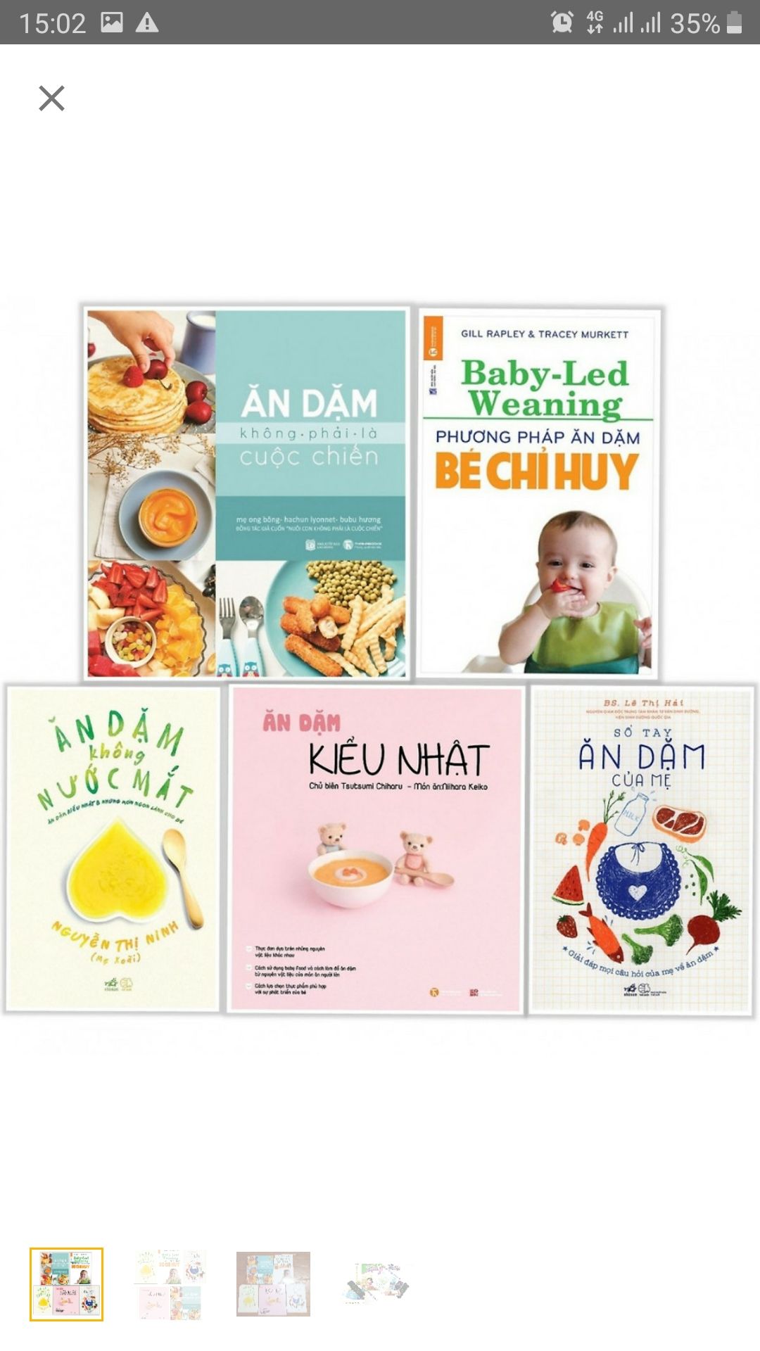 Ăn dặm cho bé là giai đoạn vô cùng quan trọng mà các bậc cha mẹ nhất định phải có kiến thức đầy đủ để chuẩn bị trước Đây là combo 5 cuốn sách ăn dặm vô cùng hay và bổ ích. Bộ 5 cuốn sách gồm 3 phương phức ăn dặm chủ yếu: A: Ăn dặm Truyền thống – Ăn dặm kiểu cháo bột truyền thống Cuốn sách Sổ tay ăn dặm của mẹ là cuốn duy nhất nói về phương pháp ăn dặm này cho đến nay một cách đầy đủ và khoa học nhất B: Ăn dặm kiểu nhật – Ăn dặm theo phương pháp và thực đơn kiểu Nhật Bản Đây là phương pháp ăn dặm khoa học theo cách mà người Nhật áp dụng. Một cách ăn dặm tốt, đầy đủ, và dễ dàng áp dụng. C: Ăn dặm kiểu bé tự chỉ hủy – Ăn dặm theo phương pháp BLW Bao gồm 2 cuốn sách: – Ăn dặm bé chỉ huy – Chỉ có lý thuyết blw – Ăn dặm không phải là cuộc chiến – Đầy đủ cả lý thuyết lẫn thực đơn hướng dẫn nấu. Combo 5 cuốn Sách Ăn dặm bao gồm 1. Ăn dặm không phải cuộc chiến – Có kèm thực đơn ăn dặm ( Phương pháp ăn dặm BLW) “Cuốn sách ăn dặm không phải là cuộc chiến và chúng tôi viết ra với mục tiêu cao nhất: Giảm và tránh việc ép ăn ở trẻ em. Cuốn sách trang bị thông tin khoa học để cha mẹ hiểu trẻ ăn bao nhiêu là đủ? Ăn thế nào là bình thường? Cái gì giúp trẻ em ham thích và có thể chủ động ăn uống? Trạng thái tâm lý và thể chất của trẻ theo lứa tuổi và những lầm tưởng thường gặp của cha mẹ với những thay đổi này? Cuốn sách đưa ra những gợi ý về cách chế biến bữa ăn gia đình lành mạnh, đủ dinh dưỡng. Hướng dẫn cho mẹ lên thực đơn cân bằng theo tuần cho gia đình. 2. Ăn dặm kiểu nhật – Có kèm thực đơn ăn dặm – Ăn dặm kiểu Nhật. Đầy đủ các kiến thức về ADKN, từ nhận biết dấu hiệu sẵn sàng ăn dặm, các giai đoạn, cách cho ăn, cách nấu, cách phân chia bữa ăn, dinh dưỡng, hỏi đá abc, xyz có hết. 3. Ăn dặm bé chỉ huy – Ăn dặm BLW Nếu bạn đã quen với hình ảnh các bé được mẹ dùng muỗng đút thức ăn nghiền nhuyễn vào miệng, bé nhè ra và mẹ lại vét vào cho đến khi nào bé nuốt thì thôi, thì BLW sẽ là một hình ảnh hoàn toàn khác. 4. Sổ tay ăn dặm của mẹ – Ăn dặm theo phương pháp truyền thống Đây là một quyển sách rất hay về rất nhiều các vấn đề ăn dặm của bé, sách được trình bày dưới dạng hỏi đáp ngắn gọn, cô đọng để mẹ nắm được những kiến thức cơ bản về dinh dưỡng cho bé trong độ tuổi ăn dặm, giải đáp thắc mắc về thói quen ăn uống và tiêu hoá của bé, hay là cách chăm sóc bữa ăn khi bé bị bệnh, cách chế biến và bảo quản thực phẩm khoa hoc. 5. Ăn dặm không nước mắt – Ăn dặm theo phương pháp Nhật (sách của mẹ Việt viết) – Ăn dặm không nước mắt. ADKN nhưng được tổng hợp lại cho phù hợp với người VN, nói nhiều về phần công thức món ăn hơn. Các mẹ có thể tham khảo. Chú ý: Phần quà tặng một trong các món ưu tiên theo thứ tự sau: 1. Sổ tay giáo dục Nhật bản 2. Sách Người Mỹ giúp con ham đọc sách 3. Cuốn sách mầm non thuộc tủ sách Mầm non 4. Bookmark kẹp sách / Bút chì xì teen (Quý khách chú ý nhé)