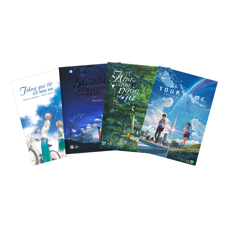 Combo gồm 4 quyển: Tiếng Gọi Từ Vì Sao, 5 Centimet Trên Giây, Khu Vườn Ngôn Từ, Your Name. 1. Your Name: Mitsuha là nữ sinh trung học sống ở vùng quê hẻo lánh. Một ngày nọ, cô mơ thấy mình ở Tokyo trong một căn phòng xa lạ, biến thành con trai, gặp những người bạn chưa từng quen biết. Trong khi đó ở một nơi khác, Taki, một nam sinh trung học người Tokyo lại mơ thấy mình biến thành con gái, sống ở vùng quê hẻo lánh. Cuối cùng hai người họ nhận ra đang bị hoán đổi với nhau qua giấc mơ. Kể từ lúc hai con người xa lạ ấy gặp nhau, bánh xe số phận bắt đầu chuyển động. Đây là phiên bản tiểu thuyết của bộ phim hoạt hình Your Name, do chính đạo diễn Shinkai Makoto chấp bút. 2. 5 Centimet Trên Giây: 5cm/s không chỉ là vận tốc của những cánh anh đào rơi, mà còn là vận tốc khi chúng ta lặng lẽ bước qua đời nhau, đánh mất bao cảm xúc thiết tha nhất của tình yêu. Bằng giọng văn tinh tế, truyền cảm, 5 centimet trên giây mang đến những khắc họa mới về tâm hồn và khả năng tồn tại của cảm xúc, bắt đầu từ tình yêu trong sáng, ngọt ngào của một cô bé và cậu bé. Ba giai đoạn, ba mảnh ghép, ba ngôi kể chuyện khác nhau nhưng đều xoay quanh nhân vật nam chính, người luôn bị ám ảnh bởi kí ức và những điều đã qua… 3. Khu Vườn Ngôn Từ: Khu vườn ngôn từ kể về một tình yêu còn xa xưa hơn cả tình yêu. Khái niệm tình yêu trong tiếng Nhật hiện đại là luyến hoặc ái, nhưng vào thời xưa nó được viết là cô bi, nghĩa là nỗi buồn một mình. Shinkai Makoto đã cấu tứ Khu vườn ngôn từ theo ý nghĩa cổ điển này, miêu tả tình yêu theo khái niệm ban sơ của nó, tức là cô bi – nỗi buồn khi một mình thương nhớ một người. 4. Tiếng Gọi Từ Vì Sao Xa : Khởi đầu cho mạch ngầm mất mát mà về sau còn xuất hiện trong 5 centimet trên giây. Khác ở chỗ tuy đặt thử thách nghiệt ngã, nhưng câu chuyện này khép lại hòa dịu hơn rất nhiều. Đọc xong, ta sẽ nhận ra rằng, khoảng cách trái đất tới thiên hà có khi chẳng đến nỗi đáng sợ bằng khoảng cách giữa hai con tim. Không rõ tiếng lòng mình có được người thương đón nhận hay không, đó mới là điều đáng buồn nhất trong một mối tình. Giống như 5 centimet Trên Giây và Khu vườn Ngôn Từ, Tiếng Gọi Từ Vì Sao Xa cũng có kết thúc khác biệt giữa bản anime và tiểu thuyết.