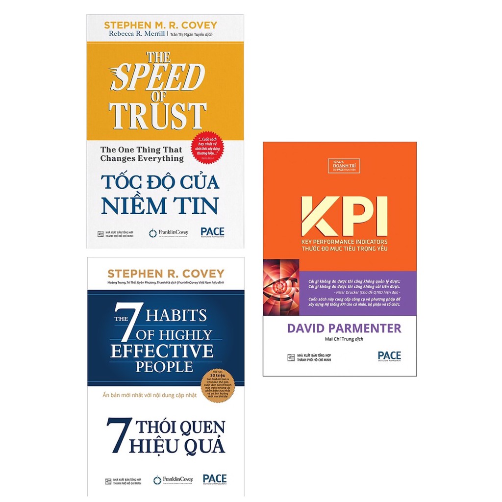 :boom:SÁCH XỊN GIÁ SIÊU MỀM YÊU :point_right:SUPER SALE GIẢM 20-40% :point_right:THEO DÕI SHOP ĐỂ NHẬN ĐƯỢC NHIỀU QUÀ :gift:QUÀ TẶNG đơn từ 300K+ :iphone:INBOX cho shop để tư vấn sách hay bạn nhé :four_leaf_clover:Hãy bấm vào hashtag để xem thêm sách chonloc dành cho bạn: #happybooks #sachnuoidayconchonloc #sachlamchamechonloc #sachhaychobechonloc ========*LỜI GIỚI THIỆU*========== 1. Tốc Độ Của Niềm Tin XÂY DỰNG THƯƠNG HIỆU BẰNG “TỐC ĐỘ CỦA NIỀM TIN” Bất kỳ doanh nhân nào cũng mong muốn xây dựng được một thương hiệu (nhãn hiệu thương mại) cho doanh nghiệp và cho sản phẩm của mình. Tuy nhiên, nếu như hiểu rằng “thương hiệu” là “cái hiệu được thương” thì cũng đồng nghĩa với việc xây dựng thương hiệu là một thách thức lớn đối với mọi doanh nghiệp. Bởi lẽ, muốn có cái “hiệu” (nổi tiếng) thì không khó, nhưng để cái “hiệu” đó được “thương” (uy tín) là điều không hề dễ dàng. Và “Tốc độ của niềm tin” (Speed of Trust) là một trong số những cuốn sách hay nhất về cách thức xây dựng thương hiệu doanh nghiệp mà tôi từng biết. Cuốn sách này chỉ ra rằng, muốn có thương hiệu uy tín (Trusted Brand) thì cần phải có một tổ chức đáng tin (Trusted Organization); muốn có một tổ chức đáng tin thì cần phải có đội ngũ đáng tin (Trusted Team); muốn có đội ngũ đáng tin thì cần phải có con người đáng tin (Trusted People). Công ty phát hành Viện Quản Lý P.A.C.E Tác giả Stephen M. R. Covey, Rebecca R. Merrill Ngày xuất bản 03-2018 Kích thước 15 x 23 cm Nhà xuất bản Nhà Xuất Bản Tổng hợp TP.HCM Dịch Giả Trần Thị Ngân Tuyến Loại bìa Bìa cứng Số trang 352 2. KPI – Thước Đo Mục Tiêu Trọng Yếu “Cái gì không đo được thì cũng không quản lý được; Cái gì không đo được thì cũng không cải tiến được.” – Peter Drucker (Cha đẻ Quản trị Kinh doanh hiện đại) Nhiều nghiên cứu trên khắp thế giới, trong đó có nghiên cứu của Robert Kaplan, Ram Charan, The Balanced Scorecard Institute và Tổ chức FranklinCovey, đã chỉ ra rằng:“70% thất bại của các doanh nghiệp ngày nay không phải là do chiến lược kém hay tầm nhìn sai, mà là do năng lực thực thi và hệ thống triển khai kém hiệu quả.” Con số trên cho thấy công tác đo lường hiệu suất công việc (Performance Management) đang được thực hiện thiếu hiệu quả trong rất nhiều tổ chức trên toàn thế giới, từ các tập đoàn đa quốc gia, cơ quan chính phủ cho đến các tổ chức phi lợi nhuận. Họ đã và đang áp dụng các thước đo mục tiêu vốn được đặt ra mà không có bất kỳ sự liên quan nào đến các nhân tố thành công quan trọng của tổ chức mình. Vậy làm sao để có thể sử dụng các thước đo mục tiêu một cách hiệu quả? KPI – Thước đo mục tiêu trọng yếu (Key Performance Indicator) chính là cuốn sách sẽ cung cấp công cụ và phương pháp để xây dựng hệ thống KPI hiệu quả dành cho mọi cá nhân, bộ phận và tổ chức. Công ty phát hành Viện Quản Lý P.A.C.E Tác giả David Parmenter Ngày xuất bản 12-2018 Kích thước 15 x 23 cm Nhà xuất bản Nhà Xuất Bản Tổng hợp TP.HCM Dịch Giả Mai Chí Trung Loại bìa Bìa cứng Số trang 540 3. 7 Thói Quen Hiệu Quả Tác phẩm “7 Thói quen Hiệu quả/ 7 Habits for Highly Effective People” đã ra đời hơn 25 năm, được biết đến là cuốn sách quản trị (quản trị bản thân và quản trị tổ chức) bán chạy nhất mọi thời đại với hơn 30 triệu bản bán ra trên toàn thế giới và được dịch sang 40 ngôn ngữ. Sách có mặt tại thị trường Việt Nam hơn 10 năm nay dưới cái tên “7 Thói quen để Thành đạt”. Ấn bản mới năm 2016 được đặt lại đúng với cái tên mộc mạc vốn có của bản gốc Tiếng Anh và có nội dung không chỉ được dịch lại toàn bộ cho sát nghĩa, dễ đọc hơn với các độc giả mà còn được cập nhật thêm những công cụ và ví dụ thực tiễn từ phiên bản nước ngoài mới nhất và có hình ảnh bìa (màu xanh đậm) giống với phiên bản gốc mới nhất. Trích lời giới thiệu của nhà giáo Giản Tư Trung – tác giả sách Đúng Việc (lời giới thiệu chỉ có trong ấn bản tiếng Việt được dịch bởi FranklinCovey Việt Nam): Tên đầy đủ của cuốn sách này, nếu dịch sát nghĩa sẽ là: “7 Thói quen của người có hiệu quả vượt trội” còn nếu dịch một cách ngắn gọn nhưng vẫn sâu sắc sẽ là “7 Thói quen Hiệu quả”. Gần như Stephen Covey đã dành cả cuộc đời mình để nghiên cứu về tính hiệu quả của con người, để đi tìm câu trả lời cho ba câu hỏi lớn lao, đó là: Vì sao con người ta trở nên ít hiệu quả?; Điều gì làm cho con người ta trở nên hiệu quả cao?; và Điều gì tạo nên hiệu quả bền vững? và 7 Habits chính là sự đúc kết sự nghiệp nghiên cứu cả đời của ông cho ba câu hỏi mang tính “muôn đời” đó. Mơ ước của hầu hết mọi người trong đời là trở thành một con người thành công và hạnh phúc bằng chính tài năng và đạo đức của mình. Ở bình diện tổ chức hay các quốc gia cũng vậỵ Công ty phát hành Viện Quản Lý P.A
