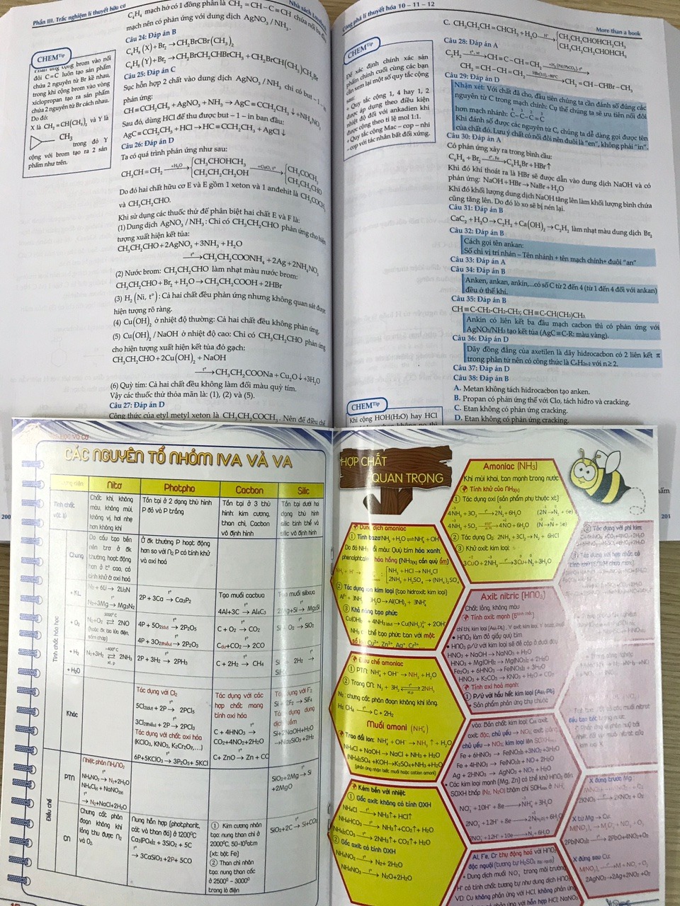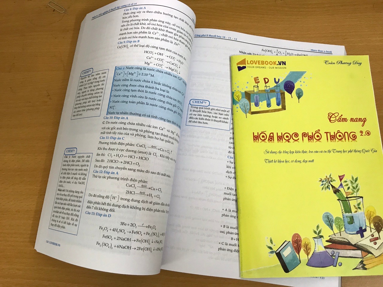 Như vậy là các em đã cầm trên tay cuốn sách “CÔNG PHÁ LÍ THUYẾT HÓA 10-11-12” kèm lời giải chi tiết và bình luận” sau bao tháng ngày mong ngóng và chờ đợi. Cuốn sách thể hiện những gì cô đọng nhất, tinh túy nhất của tác giả Trần Phương Duy và cộng sự. Chúng tôi hy vọng đây sẽ là bảo bối không thể thiếu trong quá trình ôn tập môn Hóa, hướng tới các kì thi THPT. Với gần 500 trang sách, chúng tôi đã nỗ lực cô đọng những gì cần thiết nhất, hay nhất để các em tối ưu việc học. Để quý độc giả có cái nhìn tổng quan về cuốn sách trước khi bước vào đọc cụ thể, chúng tôi xin được giới thiệu nội dung chính của sách như sau: NỘI DUNG CHÍNH Phần I: Tổng quan kiến thức Gồm 30 trang về nhận biết chất và các phương pháp điều chế chất hữu cơ được trình bày cụ thể trong sách. Ngoài ra, chúng tôi có soạn thêm 1 cuốn sổ in màu nhỏ hệ thống lại toàn bộ lí thuyết hóa trong chương trình THPT. Trong quá trình luyện bài tập trong sách, các em có thể sử dụng song song với cuốn sổ khi cần tra cứu lại lí thuyết, bên cạnh bộ sách giáo khoa của BGD. Phần II. Trắc nghiệm lí thuyết đại cương và vô cơ Hệ thống hơn 1000 câu hỏi trắc nghiệm, chia đều cho các chuyên đề kèm lời giải chi tiết ngay sau mỗi chuyên đề. Đặc biệt, trong phần lời giải, phân tích chi tiết, chúng tôi có chắt lọc ra những nội dung quan trọng (hoặc gợi nhắc lại kiến thức nền tảng) thông qua ô CHEM Tip bên lề trái. Với đặc điểm này, chúng tôi tin tưởng chắc chắn rằng các em sẽ tiếp thu bài nhanh hơn, khắc sâu kiến thức hơn. Phần III: Đề ôn tập Sau khi rèn luyện xong bộ 1023 câu hỏi ở phần II. Các em tiếp tục với việc ôn luyện lại và đo lường sự tiến bộ của mình thông qua bộ 8 đề chọn lọc (400 câu) mà chúng tôi biên soạn ra. Đây là những mảng lí thuyết dễ bị nhầm lẫn nhất mà chúng tôi tổng hợp lại. Việc để những câu hỏi hóc búa ở cuối cùng của sách sẽ giúp các em củng cố vững chắc hơn, tự tin hơn sau khi đọc xong cuốn sách. Ngoài ra, ở phần IV, chúng tôi sẽ cung cấp cho các em gần 200 câu hỏi lí thuyết được trích từ bộ đề chính thức của BGD trong hai năm gần nhất. Kết quả của việc làm bộ câu hỏi BGD này sẽ là câu trả lời chính xác nhất cho việc đo lường hiệu quả sử dụng sách của các em. Không như phần II, ở phần III, chúng tôi chuyển việc trình bày lời giải chi tiết sang kiểu 2 cột.