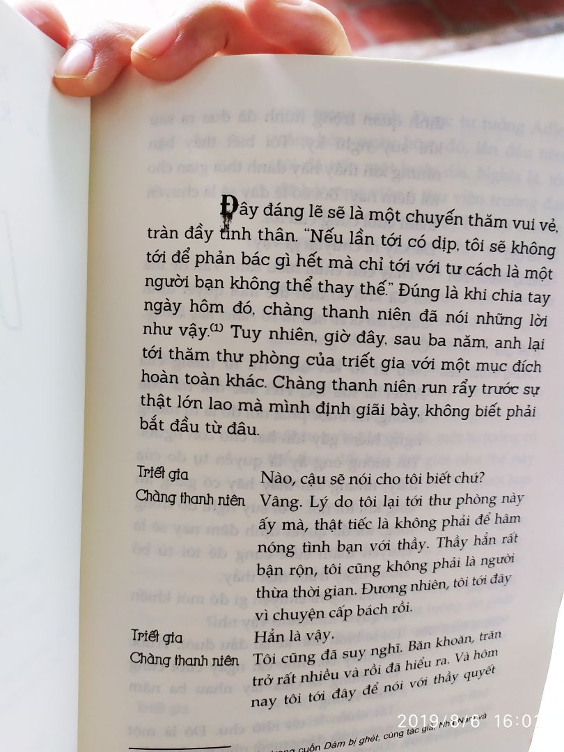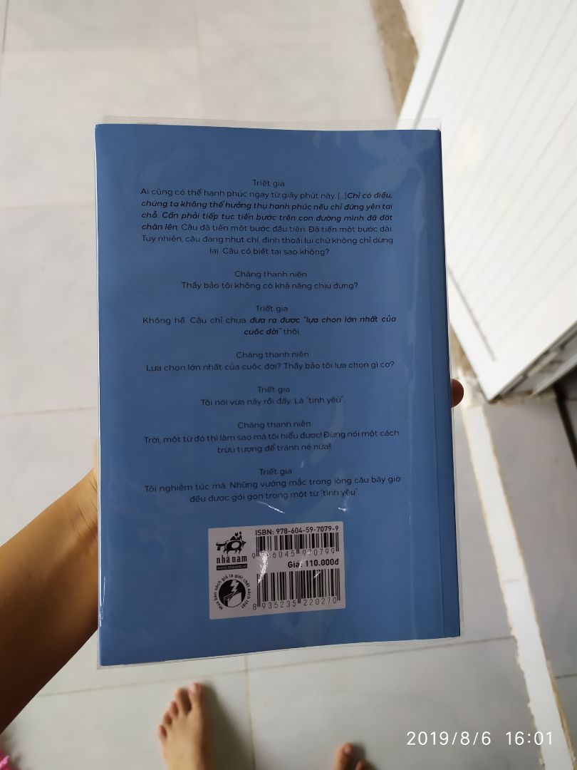 Triết gia Ai cũng có thể hạnh phúc ngay từ giây phút này. Chỉ có điều, chúng ta không thể hưởng thụ hạnh phúc nếu chỉ đứng yên tại chỗ. Cần phải tiếp tục tiến bước trên con đường mình đã đặt chân lên. Cậu đã tiến một bước đầu tiên. Đã tiến một bước dài. Tuy nhiên, cậu đang nhụt chí, định thoái lui chứ không chỉ dừng lại. Cậu có biết tại sao không? Chàng thanh niên Thầy bảo tôi không có khả năng chịu đựng? Triết gia Không hề. Cậu chỉ chưa đưa ra được “lựa chọn lớn nhất của cuộc đời” thôi. Chàng thanh niên Lựa chọn lớn nhất của cuộc đời? Thầy bảo tôi lựa chọn gì cơ? Triết gia Tôi nói vừa nãy rồi đấy. Là “tình yêu”. Chàng thanh niên Trời, một từ đó thì làm sao mà tôi hiểu được! Đừng nói một cách trừu tượng để tránh né nữa!! Triết gia Tôi nghiêm túc mà. Những vướng mắc trong lòng cậu bây giờ đều được gói gọn trong một từ “tình yêu”.