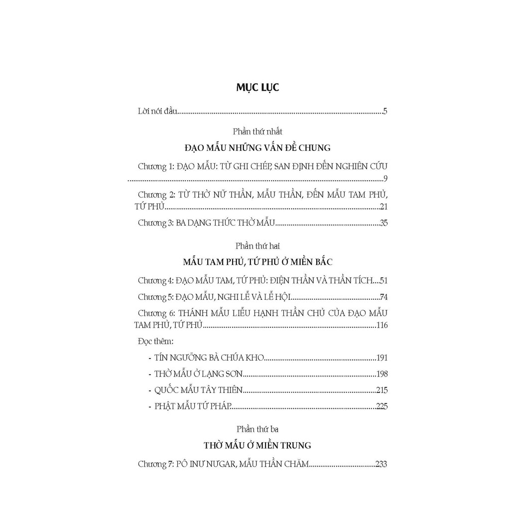 Năm xuất bản: 2019 Số trang: 900 Khổ sách: 16 x 24 cm Trong tín ngưỡng thờ Mẫu Việt Nam là việc tôn thờ nữ thần, thờ mẫu thần, thờ mẫu tam phủ, tứ phủ xuất hiện khá phổ biến và có nguồn gốc lịch sử và xã hội sâu xa. Tuy tất cả đều là sự tôn sùng thần linh nữ tính, nhưng giữa thờ nữ thần, mẫu thần, mẫu tam, phủ tứ phủ không hoàn toàn đồng nhất. Tín ngưỡng thờ Mẫu Việt Nam là một tín ngưỡng bản địa cùng với những ảnh hưởng ngoại lai từ đạo giáo, tín ngưỡng lấy việc tôn thờ Mẫu (Mẹ) làm thần tượng với các quyền năng sinh sôi, bảo trữ và che chở cho con người. Quyển sách đưa đến giá trị, tìm hiểu nghiên cứu những vấn đề chung về Đạo Mẫu, về tín ngưỡng tôn giáo cũng như các giá trị nghệ thuật và văn hóa Việt Nam. Các hình thức thờ Mẫu ở ba miền Bắc, Trung, Nam.