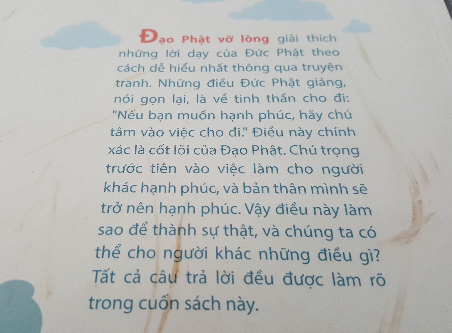 Đạo Phật Vỡ Lòng Cốt lõi của đạo Phật là gì? Hãy khoan nói đến những giá trị sâu xa kia, hãy nghĩ nó đơn giản rằng giúp đạo Phật giúp chúng ta sống đẹp hơn, luôn yêu thương nhau, và có 1 trí tuệ sáng hơn để nhận định sự việc một cách rõ ràng với tấm lòng thật từ bi. Bạn hiểu thế nhưng còn những bạn nhỏ thì sao, làm sao để các bạn có thể truyền tải cho con mình những giá trị đó. Bạn không thể đưa cho con một cuốn Kinh và bắt con đọc đi, hay bạn cũng không chỉ nói cho con rằng con phải như thế này phải như thế kia. Trẻ con cần sự rõ ràng, càng rõ ràng thì kiến thức này sẽ được đi sâu và tạo thành một thói quen, điều này sẽ thuận lợi hơn rất nhiều về cuộc sống tương lai của bé sau này. “Đạo Phật vỡ lòng” cuốn sách được viết với những lời dạy của Đức Phật theo cách mà trẻ nhỏ cũng có thể tiếp nhận. Bạn có thể cùng con tận hưởng nó cùng với một chút tiếng cười, học những triết lý cốt yếu của Đạo Phật – điều điều mà có thể làm thay đổi cuộc sống từ trí tuệ đến đạo đức của mỗi con người. Và đặc biệt hơn, cuốn sách được viết dưới dạng là truyện tranh, khá thú vị giúp các bé có thể tiếp thu được triết lý của đạo Phật theo cách vô thức. Đến với cuốn sách bạn sẽ giúp con hiểu được: Sự quý giá của cuộc sống. Sự chia sẻ, cho đi đúng nghĩa. Tầm quan trọng của sự kiên trì nổ lực. Sự giận dữ sẽ đi kèm với cách xử lý ngu dốt. Hãy biết ơn và trân trọng những gì mình đang có. …. Và không chỉ riêng gì các bé, hay những bạn trẻ, mà những người lớn như phụ huynh vẫn có thể đọc để hiểu hơn về những triết lý ấy. Mục lục: Bài 1 Cuộc sống quý giá – Tại sao cuộc sống con người là quý giá nhất trên Trái Đất? Bài 2 Luật Nhân Quả(1): Nền móng của Đạo Phật – Nguồn gốc căn bản để có một tương lai hạnh phúc Bài 3 Luật Nhân Quả(2): Nhân nào, quả nấy Không nổi giận hay oán ghét người khác Bài 4 Luật Nhân Quả(3): Nghiệp lực Hành động quyết định tương lai của bản thân Bài 5 Luật Nhân Quả (4): Nhân và quả ba đời Hiện tại là chìa khóa tới quá khứ và tương lai Bài 6 Sáu việc làm tốt (1): Tầm quan trọng của làm việc tốt Việc làm tốt là gì? Bài 7 Sáu việc làm tốt (2): Hảo tâm 1- Ngọn đèn của một người nghèo sáng hơn 10.000 ngọn đèn của một phú ông Bài 8 Sáu việc làm tốt (3): Hảo tâm 2 – Bảy loại tặng phẩm không phải bằng vật chất Dù không có tiền bạc hay tài sản để cho đi, bạn vẫn có thể là người hào phóng Bài 9 Sáu việc làm tốt (4): Hảo tâm 3 – Ba ruộng phước Chọn đối tượng để giúp đỡ. Bài 10 Sáu việc làm tốt (5): Giữ lời hứa và nhẫn nại Luôn luôn giữ lời hứa, và giữ cả bình tĩnh Bài 11 Sáu việc làm tốt (6): Nỗ lực, tự soi xét bản thân và tu dưỡng Kiên trì – Nỗ lực hơn tất cả những người khác Bài 12 Lễ hội Hoa – Ngày Đức Phật đản sanh Ý nghĩa thực sự của câu “Chỉ có ta là bậc tôn quý” Bài 13 Tám loại khổ đau (1) Sinh, già, bệnh, chết là không thể tránh khỏi Bài 14 Tám loại khổ đau (2) Một thế giới ngập tràn yêu thương và thù ghét Bài 15 Những đam mê trần tục Tại sao chuông chùa lại điểm 108 lần vào đêm Giao thừa? Bài 16 Nói lời thô ác, những lời nói gây hại Chúng ta không được làm tổn thương người khác bằng lời nói Bài 17 Thiếu sáng suốt (Đố kỵ) Tâm trí không trong sáng khi ghen tỵ với hạnh phúc của người khác và thích thú với bất hạnh của họ Bài 18 Bảy loại kiêu ngạo Con người không ai có thể tránh khỏi tính tự cao Bài 19 Biết ơn, nhớ ơn, trả ơn Người vô ơn không đáng được tin tưởng Bài 20 Tinh thần đem lại lợi ích cho người khác trước tiên Tử tế với người khác dẫn đến hạnh phúc của chính bạn