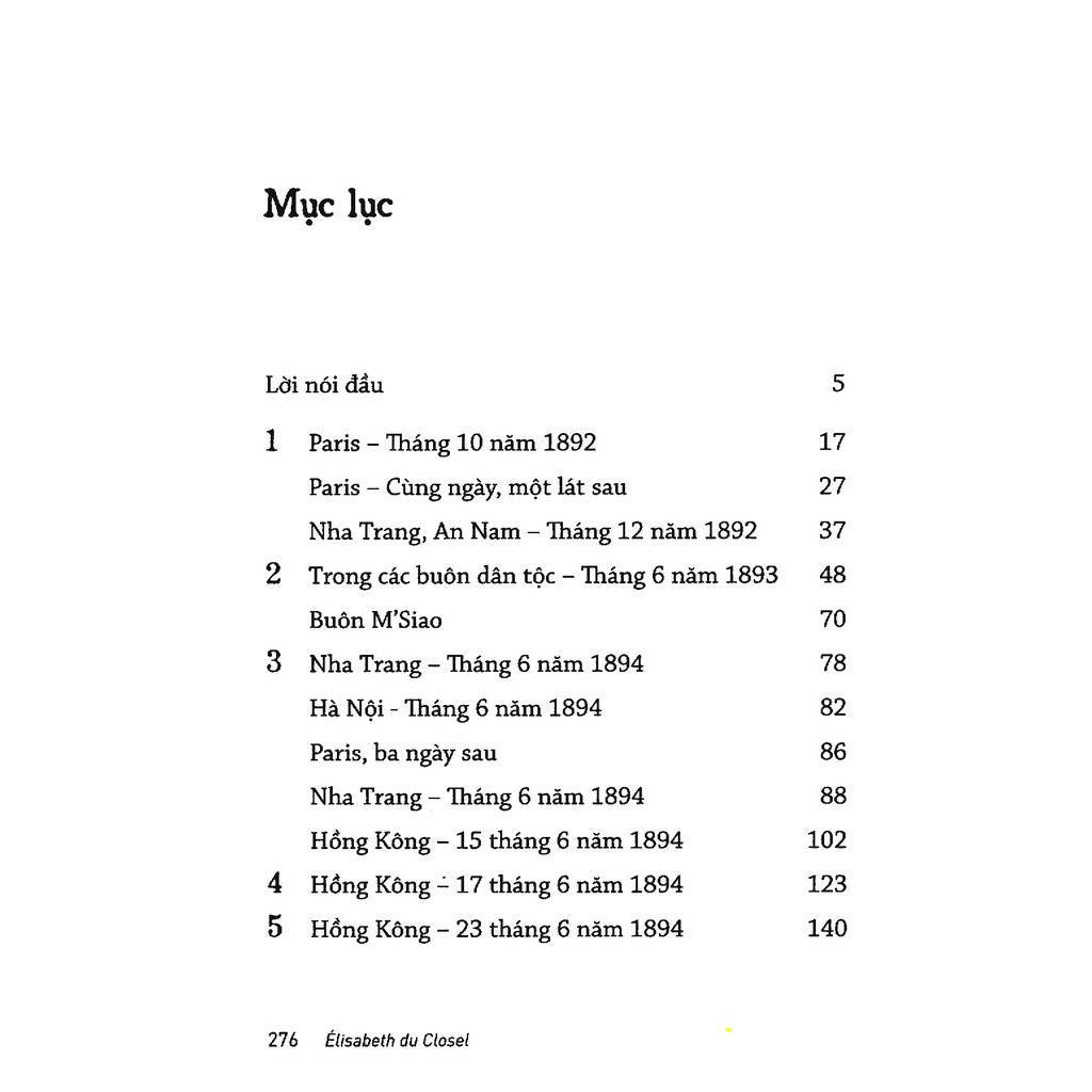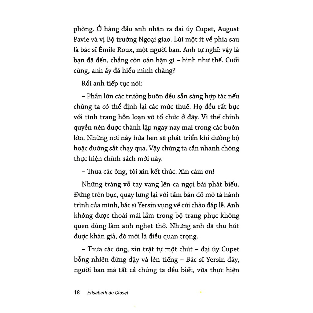 Cuốn sách kể về cuộc đời đặc biệt của Alexandre Yersin, Ông Năm: nhà vi trùng học nổi tiếng, thành viên Viện Pasteur ở tuổi 23, phát hiện ra khuẩn hạch năm 31 tuổi.Năm 1890, Yersin dời châu Âu trên tàu của một công ty vận tải biển, với ước mơ khám phá những vùng đất xa xôi như Livingstone, hướng tới Đông Dương và những cao nguyên chưa được biết tới của vùng đất này. Nhưng lý tưởng của nhà nghiên cứu vẫn luôn cháy trong ông. Dịch hạch nổ ra ở Trung Quốc, năm 1894, ông tới Hồng Kông để nghiên cứu căn bệnh này. Ở đây, giữa lúc dịch bệnh lan tràn khắp nơi, không được tiếp cận với bệnh viện và tử thi, ông đã tự mình phát hiện được khuẩn hạch mặc dù gặp phải sự đối đầu của giáo sư người Nhật Kitasato.Từ đó, Yersin nổi tiếng khắp thế giới. Tuy vậy, ông cảm thấy mình không thích hợp với sự nổi tiếng. Ông muốn sống ở Nha Trang, nơi ông thành lập một viện Pasteur và sống đến những ngày cuối đời, không ngừng khám phá và làm giàu cho vùng đất ông sinh sống.Trong cuốn tiểu sử đầy chất lãng mạn này, Élisabeth du Closel đã lần theo cuộc đời và những chuyến đi của Yersin cũng như những cuộc khẩu chiến làm chấn động thế giới khoa học, đồng thời làm sống lại Việt Nam thời kỳ đó một cách sinh động với đủ mọi sắc thái.Mời bạn đón đọc. Tác giả: Élisabeth Du Closel Nhà Xuất Bản: Nxb Trẻ Nhà Phát Hành: NXB Trẻ Năm Xuất Bản: 2019 Số Trang: 278