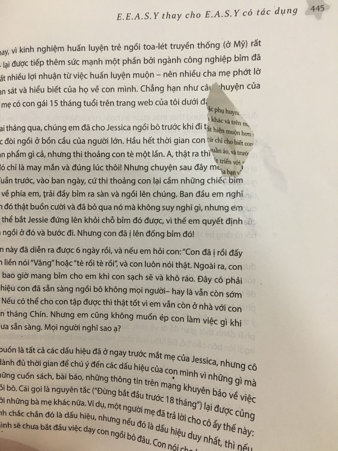 Đọc Vị Mọi Vấn Đề Của Trẻ “Trong cuốn sách này, tôi muốn giúp bạn, xoa dịu nỗi sợ của bạn và chỉ cho bạn cách tự tạo cho mình sức mạnh của một người làm cha mẹ. Tôi muốn dạy cho bạn những gì tôi đã học được từ công việc cả đời thì thầm với trẻ cũng như trả lời những câu hỏi mà bạn đặt ra cho tôi. Tôi muốn dạy bạn cách nghĩ giống như tôi. Tất nhiên, dù tôi có cố gắng liệt kê tất cả những vấn đề mà bạn có thể gặp phải thì mỗi một em bé và mỗi một gia đình lại có một chút khác biệt. Vì thế, khi các ông bố bà mẹ tìm đến tôi với một vấn đề cụ thể nào đó, để đánh giá xem chuyện gì đang xảy ra trong ngôi nhà và với đứa con sơ sinh hoặc đứa con mới chập chững biết đi của họ, tôi luôn hỏi ít nhất một, nếu không thì phải một loạt những câu hỏi về cả đứa trẻ và việc mà cha mẹ đã làm để ứng phó với tình huống đó. Sau đó, tôi mới có thể nghĩ ra kế hoạch hành động phù hợp. Mục tiêu của tôi là giúp bạn hiểu được quá trình tư duy và hình thành thói quen tự đặt câu hỏi. Như vậy, bạn sẽ không chỉ là người thì thầm với trẻ, mà còn trở thành một người giải quyết vấn đề xuất sắc – một Quý bà hoặc Quý ông vạn năng. Khi đọc tiếp, tôi muốn bạn nhớ điều quan trọng này: Vấn đề không là gì khác ngoài một rắc rối cần phải giải quyết hoặc một tình huống đòi hỏi giải pháp sáng tạo. Hãy đặt ra đúng câu hỏi và bạn sẽ tìm ra câu trả lời chính xác.” (Tracy Hogg) Mục lục Lời giới thiệu TỪ THÌ THẦM VỚI TRẺ TỚI GIẢI QUYẾT VẤN ĐỀ Bí mật quan trọng nhất của tôi MỘT: E.A.S.Y KHÔNG CÓ NGHĨA LÀ DỄ DÀNG (NHƯNG LẠI CÓ TÁC DỤNG) Buộc con quen với nếp sinh hoạt được sắp xếp HAI: NGAY CẢ TRẺ SƠ SINH CŨNG CÓ CẢM XÚC Phán đoán tâm trạng/ cảm xúc trong năm đầu BA: CHẾ ĐỘ UỐNG SỮA CỦA CON BẠN Các vấn đề ăn uống trong 6 tháng đầu BỐN: THỨC ĂN KHÔNG CHỈ LÀ NUÔI DƯỠNG Ăn dặm và ăn uống vui vẻ mãi về sau NĂM: DẠY CON CÁCH NGỦ Ba tháng đầu tiên và sáu biến thể rắc rối SÁU: BẾ LÊN/ ĐẶT XUỐNG Công cụ huấn luyện ngủ – bốn tháng tới một tuổi BẢY: “CHÚNG TÔI VẪN CHƯA NGỦ ĐỦ” Các vấn đề liên quan đến ngủ sau một tuổi TÁM: THUẦN HÓA TRẺ CHẬP CHỮNG BIẾT ĐI Dạy trẻ phát triển HỢP (F.I.T) cảm xúc CHÍN: E.E.A.S.Y CÓ TÁC DỤNG Trường hợp huấn luyện đi vệ sinh sớm MƯỜI: NGAY KHI BẠN NGHĨ BẠN ĐÃ LÀM ĐƯỢC… MỌI THỨ LẠI THAY ĐỔI! Mười hai câu hỏi thiết yếu và mười hai nguyên tắc giải quyết vấn đề!