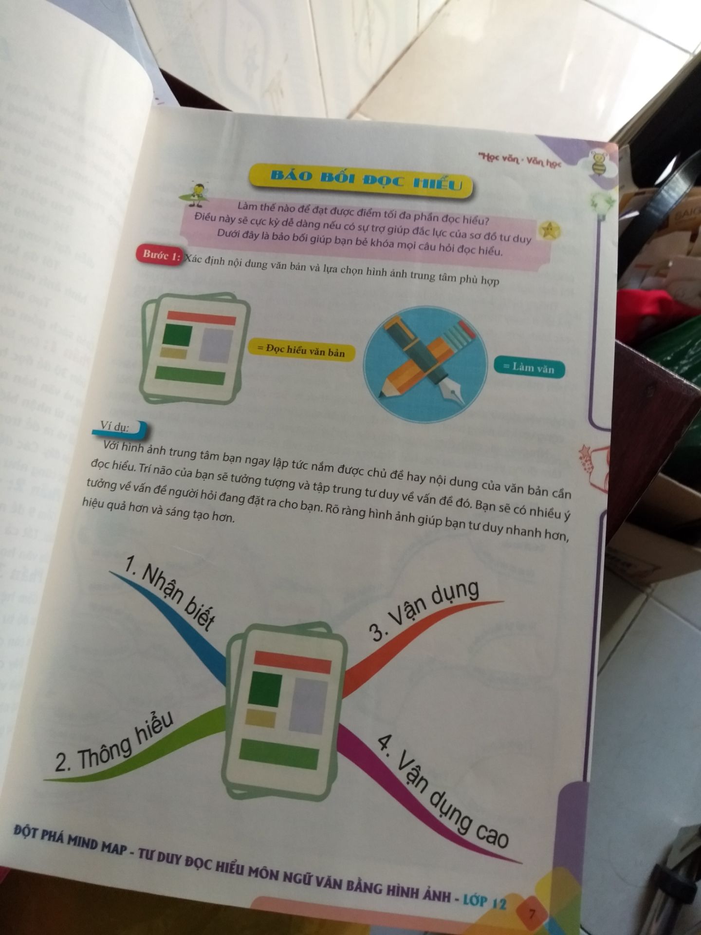 Đột Phá Mindmap – Tư Duy Đọc Hiểu Môn Ngữ Văn Bằng Hình Ảnh Lớp 12 Các sĩ tử đã chuẩn bị gì để “đối phó” với môn học vốn được mệnh danh là “khó nhằn” này? Bạn cảm thấy: – Áp lực với khối lượng kiến thức ôn thi THPT khổng lồ gồm nhiều môn, đặc biệt với môn Ngữ Văn khi mà khối lượng cần ghi nhớ của môn học này là rất lớn. – Mệt mỏi khi liên tục phải đọc đi đọc lại để thuộc lòng các ý, các đầu dòng. Đọc trước quên sau.Nhàm chán bởi cách học lại rất nhàm chán, gần như chỉ là giáo viên đọc, còn học sinh chép, thậm chí học theo những bài văn mẫu. – Khó đạt điểm cao: Nhiều bạn viết rất dài nhưng lan man, bố cục không rõ ràng, viết xong ý này lại quay lại viết ý trước,.. Đột Phá Mindmap – Tư Duy Đọc Hiểu Môn Ngữ Văn Bằng Hình Ảnh Lớp 12 sẽ mang đến một phương pháp học văn hoàn toàn mới mẻ – Học văn bằng tư duy Mindmap. Phương pháp Sơ đồ tư duy Mindmap có gì đặc biệt? Học văn bằng hình ảnh là phương pháp học giúp nhớ lâu, nhớ dễ dàng, nhanh chóng và khoa học nhất. Không quá 60 phút cho 1 tác phẩm . Chỉ 60 phút với bản đồ tư duy trong cuốn sách này, một tác phẩm phải phân tích hơn 10 trang giấy nhưng chỉ tóm gọn trong 2 sơ đồ và thuộc ngay. Giúp bạn ôn các đề thi Văn hiệu quả. Tối đa suy nghĩ cả 2 bộ não . Mindmap Văn giúp ghi nhớ hình ảnh vào sâu trong não bộ (ghi nhớ hình ảnh dễ hơn câu chữ rất nhiều), khi làm đề thi Văn mọi hình ảnh trong bản đồ tư duy sẽ lần lượt hiện ra, đồng thời giúp bạn nhớ ngay hệ thống kiến thức tương ứng. Không lo thiếu ý, lặp ý, viết lan man . Sơ đồ tư duy sắp xếp các ý theo luận điểm luận cứ, viết hết luận điểm này bạn sẽ viết tiếp luận điểm khác vì vậy giúp bạn viết các đoạn văn không bị trùng lặp, người chấm thi dễ dàng tìm được ý để cho điểm cao. Bạn hoàn toàn tự do trong diễn đạt .Tự diễn đạt theo cách hiểu bản thân dựa theo hệ thống ý có sẵn từ các bài ngữ văn 12. Nội dung cuốn sách Đột Phá Mindmap – Tư Duy Đọc Hiểu Môn Ngữ Văn Bằng Hình Ảnh Lớp 12 : – 30 đề Đọc hiểu các văn bản văn học hiện đại và các văn bản nhật dụng Hệ thống đề bài luyện tập phục vụ trực tiếp cho kì thi THPT quốc gia; – 9 đề nghị luận xã hội những vấn đề mới nhất, mới mẻ và sát với thực tế; – Sơ đồ tư duy tác phẩm văn học trong chương trình ngữ văn lớp 12.