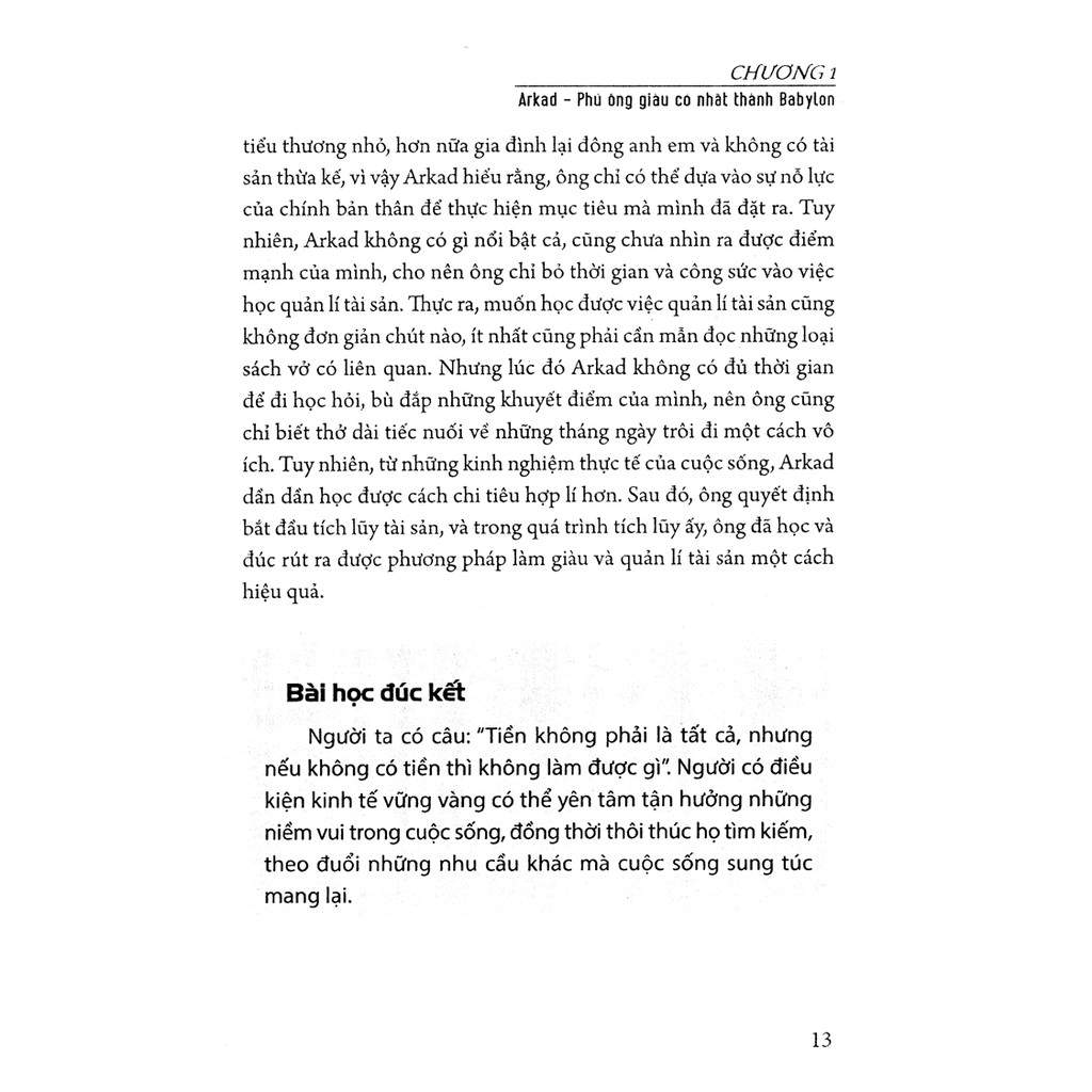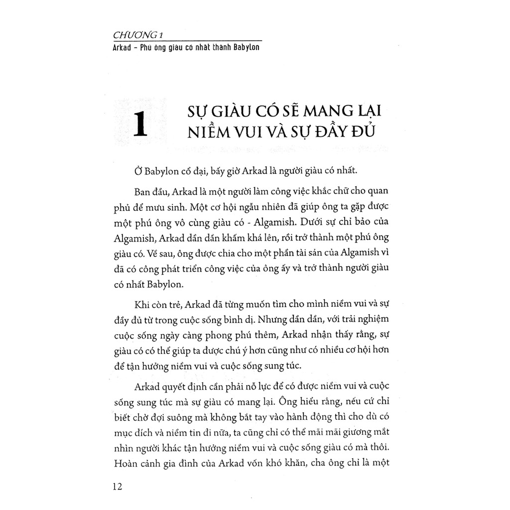 THÔNG TIN CHI TIẾT Công ty phát hành Minh Long Tác giả Tương Lâm Ngày xuất bản 02-2017 Nhà xuất bản Nhà Xuất Bản Thanh Niên Số trang 200 GIỚI THIỆU SÁCH Đừng Để Tiền Ngủ Yên Trong Túi – Thuật Đầu Tư Thông Minh Của Người Giàu Babylon Được sở hữu một khối tài sản lớn là ước mơ và mong muốn của mỗi chúng ta. Trong thời đại ngày nay, khát hữu một khối tài sản lớn là ước mơ và mong vọng của con người đối với tài sản vật chất lại càng lớn hơn nữa. Thế nhưng giữa ước mơ và hiện thực thường có một khoảng cách nhất định. Chúng ta thường mơ được phát tài, và cũng thường than thở rằng ước mơ ấy quả là xa vời. Đó là vì năng lực ta có hạn? Hay là vì ta không đủ lòng tin? Hay là vì chúng ta chưa tìm thấy bí quyết làm giàu? Sáu nghìn năm trước, Babylon cổ đại mặc dù không hề có bất cứ lợi thế nào về tài nguyên thiên nhiên, nhưng họ vẫn có thể trở nên giàu có. Họ đã xây dựng nên thành Babylon – một thành phố phồn hoa, giàu có nhất bậc thế giới lúc bấy giờ. Nguyên nhân là vì người Babylon đã biết vận dụng một cách hiệu quả trí tuệ của mình để khắc phục sự khắc nghiệt của thiên nhiên, tổng kết và vận dụng các phương pháp làm giàu, đồng thời không ngừng khai thác và phát huy tiềm năng của con người, nhờ đó giúp cho số tiền của mình ngày càng được “sinh sôi” nhiều lên. Babylon nằm bên bờ sông Euphrates, từng là một thành phố tuyệt đẹp, giàu có và sung túc, vàng bạc châu báu của toàn thành phố nhiều không đếm xuể. Sáu nghìn năm trước, nơi đây từng là biểu tượng của sự giàu có. Nhưng tài nguyên thiên nhiên của ngôi thành này lại không mấy phong phú như mọi người hằng tưởng tượng, ở đây không có rừng, cũng không có mỏ quặng, thậm chí đá dùng để xây dựng cũng như các con đường thương mại đều rất ít. Ở Babylon chỉ có nước sông và đất đai phì nhiêu, nhưng lượng mưa không nhiều, còn khí hậu thì nóng và khô cằn. Tuy nhiên, người Babylon đã lập nên kì tích khi họ đã tận dụng được một cách triệt để những tài nguyên thiên nhiên đó để khắc phục điều kiện tự nhiên khắc nghiệt, vận dụng trí tuệ một cách hoàn hảo để hoàn thành mục tiêu vĩ đại, viết nên trang sử hào hùng được lưu truyền mãi cho muôn đời sau. Đó cũng là một minh chứng rõ ràng cho sự nỗ lực của con người đã chiến thắng thiên nhiên.