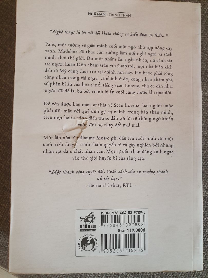 Dưới Một Mái Nhà Ở Paris “Nghệ thuật là một lời nói dối khiến chúng ta hiểu được sự thật…” Paris, một xưởng vẽ giấu mình cuối một ngõ nhỏ rợp bóng cây xanh. Madeline đã thuê căn xưởng làm nơi nghỉ ngơi và tách mình khỏi thế giới. Do một nhầm lẫn ngẫu nhiên, nữ cảnh sát trẻ người Luân Đôn chạm trán với Gaspard, một nhà biên kịch đến từ Mỹ cũng thuê trọ tại chính nơi này. Họ buộc phải sống cùng nhau trong vài ngày, và chính ở đó, cùng nhau khám phá số phận bí ẩn của họa sĩ nổi tiếng Sean Lorenz, chủ căn nhà, người đã để lại ba bức tranh bí ẩn cuối cùng trước khi qua đời. Để vén được bức màn sự thật về Sean Lorenz, hai người buộc phải đối mặt với quỷ dữ ngự trị chính trong bản thân mình, trên một hành trình điều tra sẽ dẫn tới lối rẽ không ngờ khiến cuộc đời họ thay đổi mãi mãi. Một lần nữa Guillaume Musso ghi dấu tên tuổi mình với một cuốn tiểu thuyết trinh thám quyến rũ và gây nghiện bởi những nhân vật đậm chất nhân văn. Một sự dấn thân đáng kinh ngạc vào thế giới huyền bí của sáng tạo. “Một thành công tuyệt đối. Cuốn sách của sự trưởng thành và táo bạo.” – Bernard Lehut, RTL